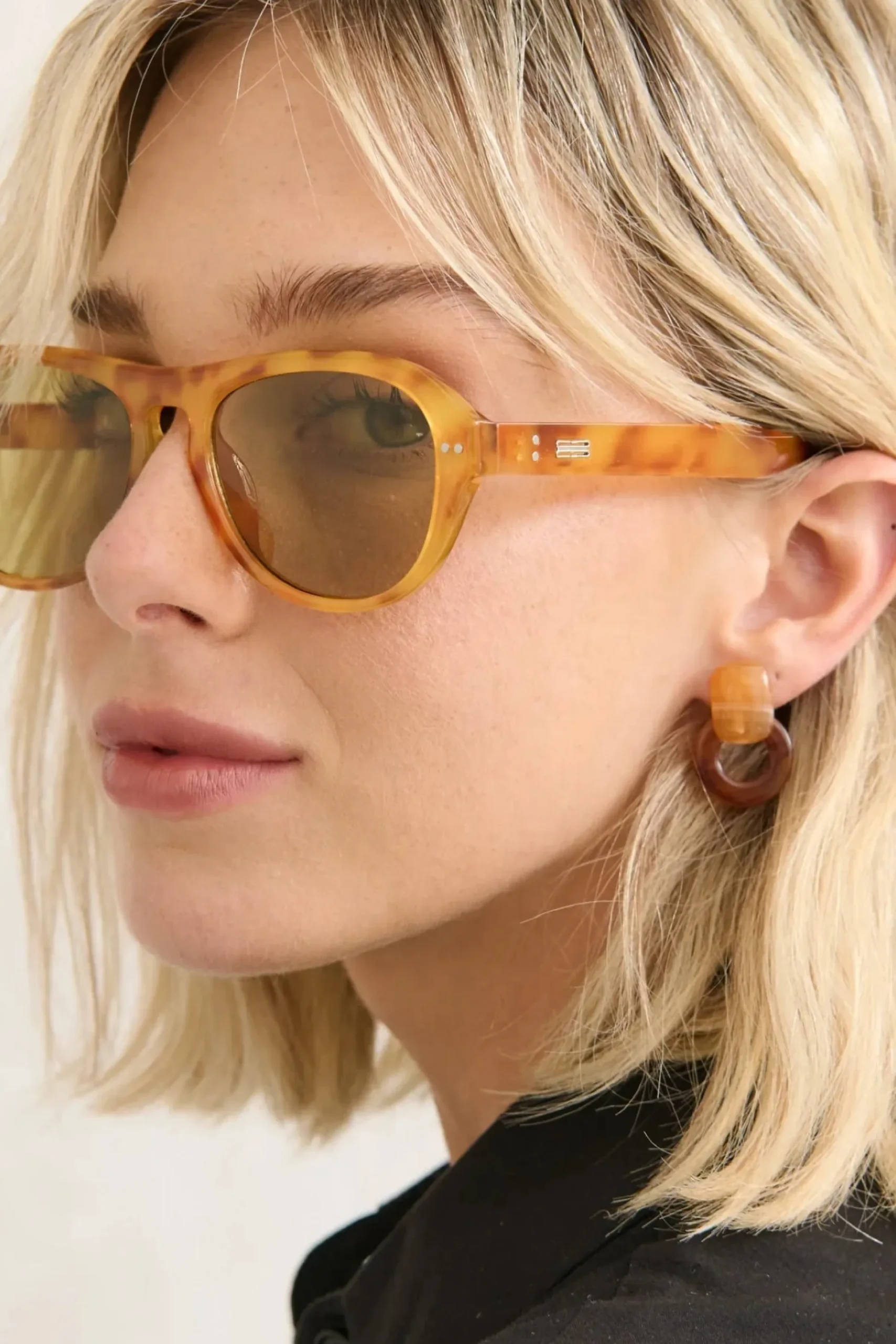 These sunglasses feature a classic aviator-inspired silhouette with a modern twist. Designed in a rich tortoiseshell frame, they offer a timeless yet contemporary appeal