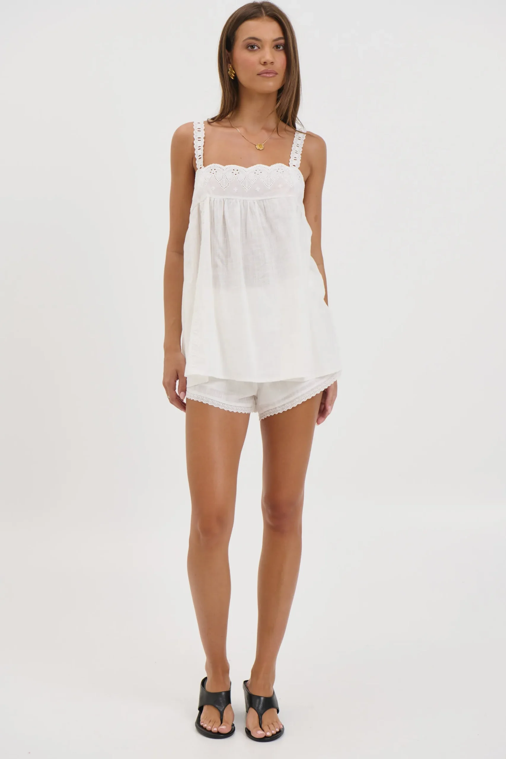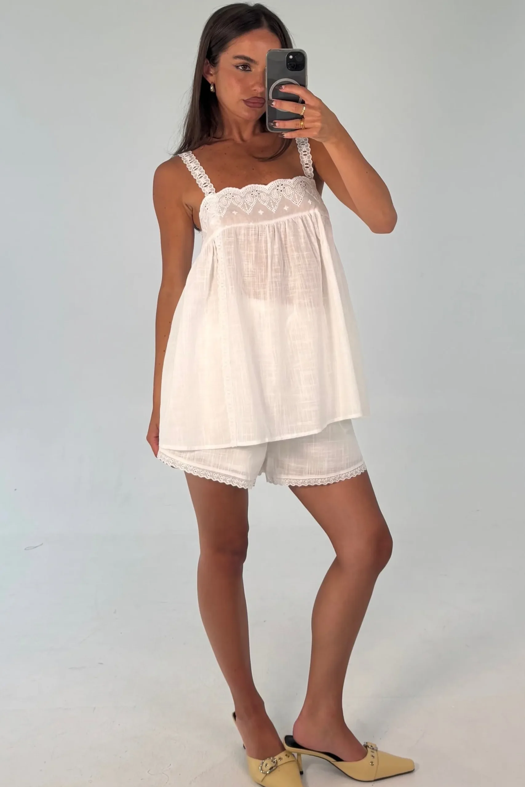 Meet the Alora Lace Set, The flowy top features thin adjustable straps and intricate lace detailing, creating a soft and romantic silhouette. Paired with matching shorts, the look is finished with a lace-trimmed hemline and an elasticated waistband for a comfortable, flattering fit.