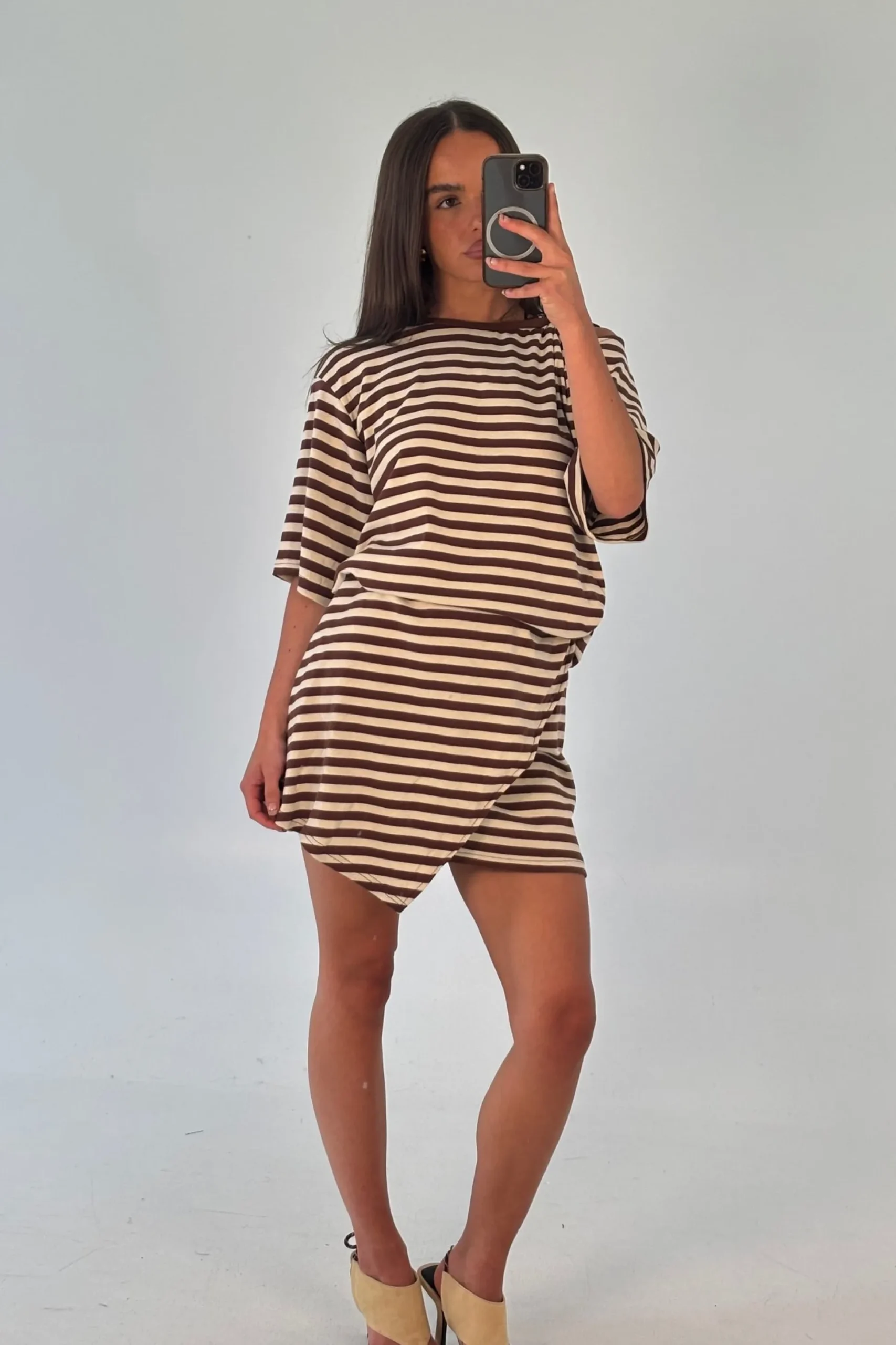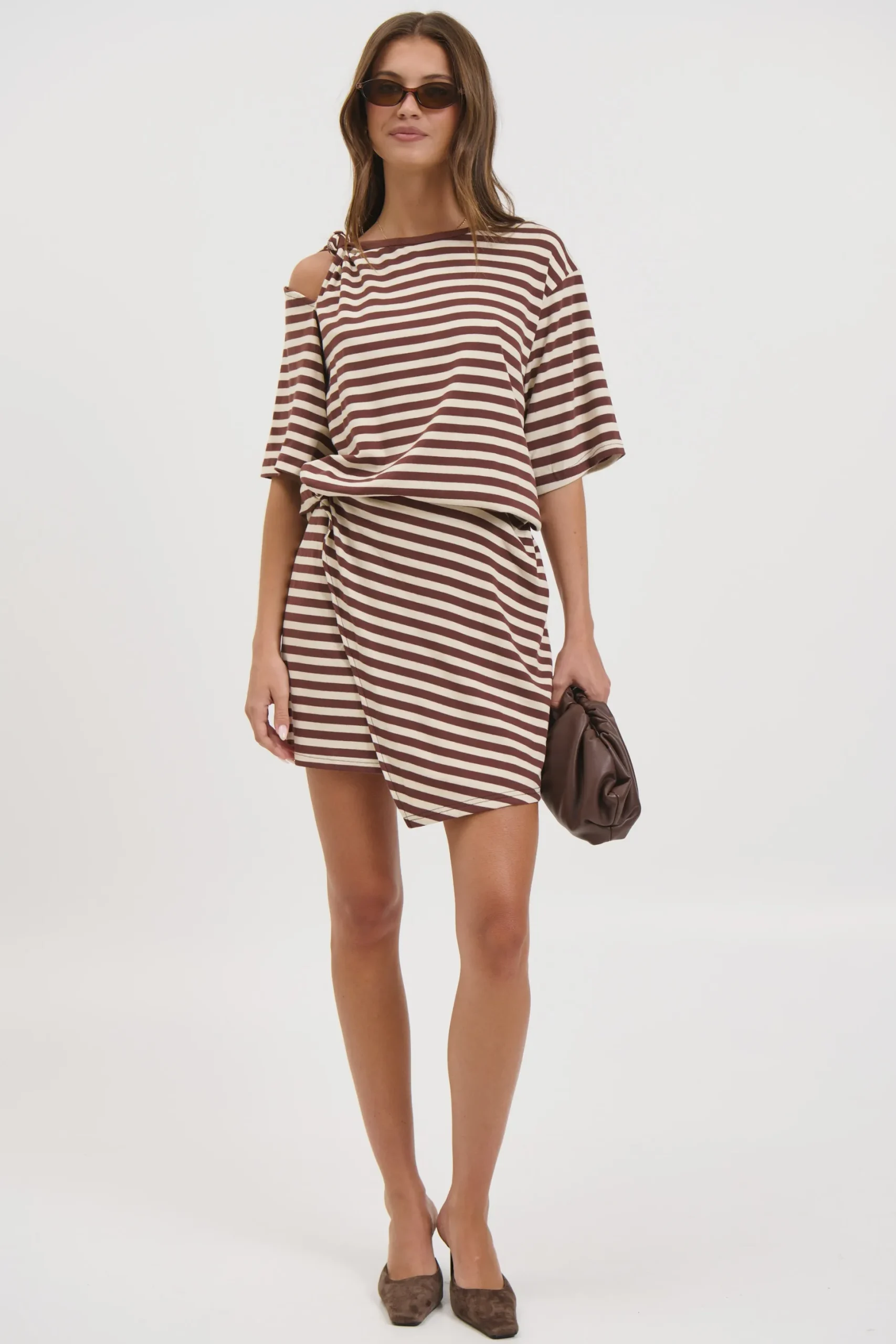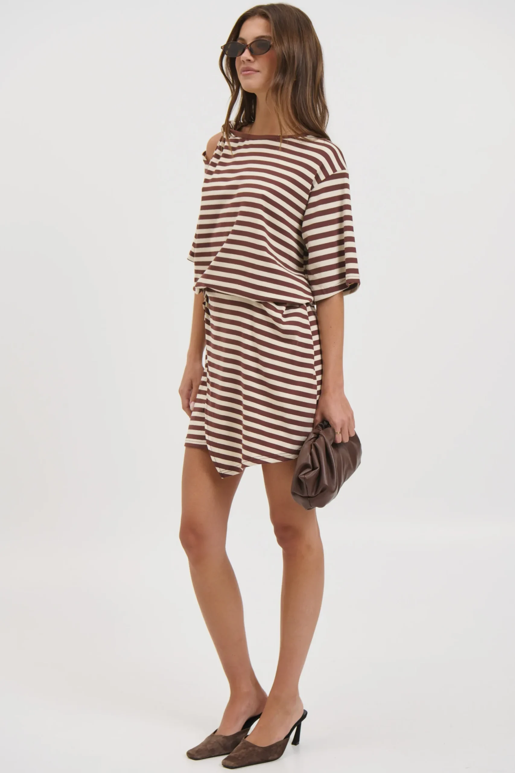 Meet the Anastasia Tee Dress Chocolate Stripe, this dress combines the relaxed comfort of oversized tee sleeves with a cinched, defined waist for a flattering fit. The asymmetric hem adds a modern edge, creating movement and visual interest with every step.