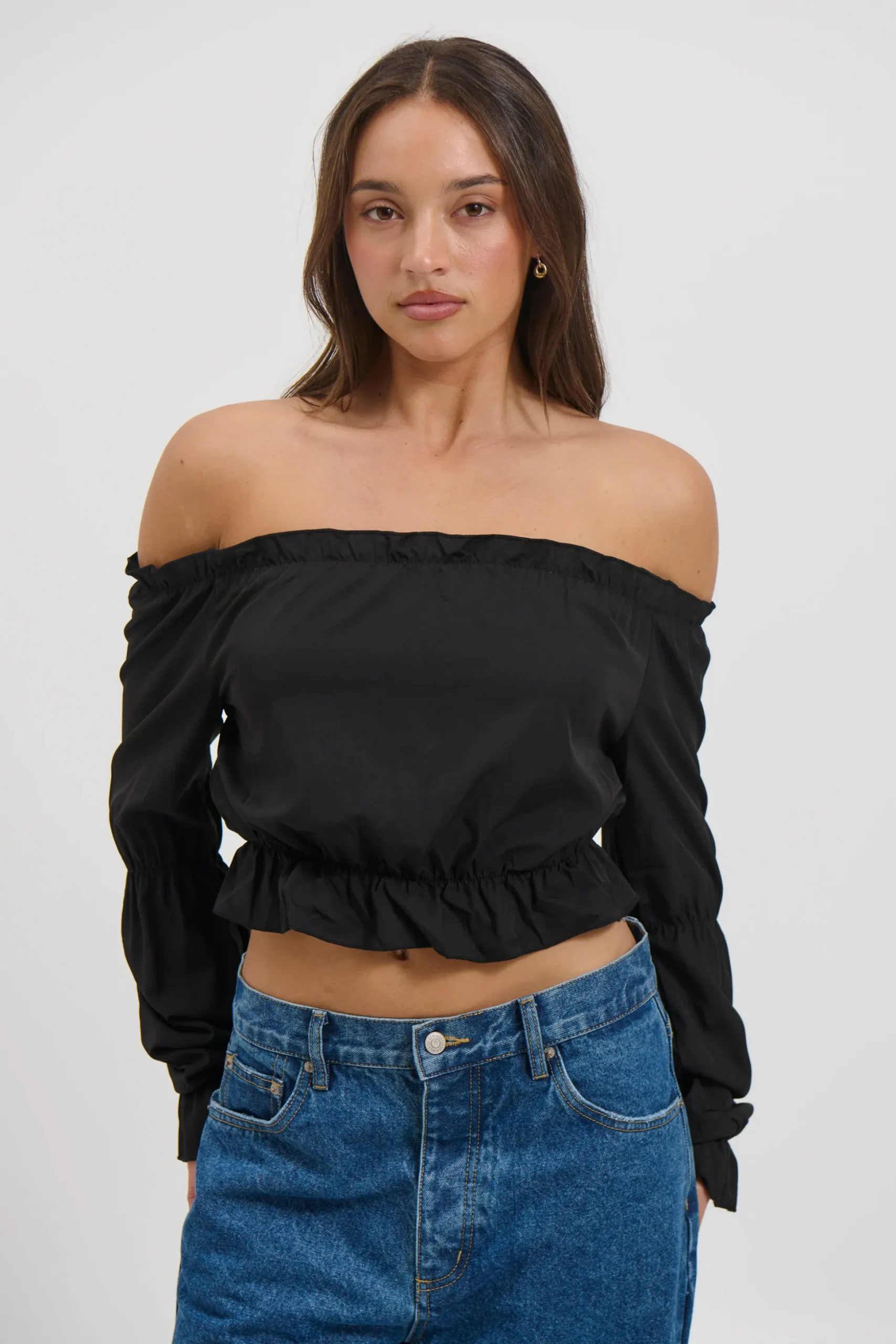 Meet the Antonia Off The Shoulder Top, A romantic top featuring a cropped silhouette with a ruched puff body and sleeves for a voluminous, feminine touch. Designed with long sleeves and playful frill hems, this off the shoulder style exudes effortless charm, perfect for pairing with high waisted skirts or jeans for day to night wear.
