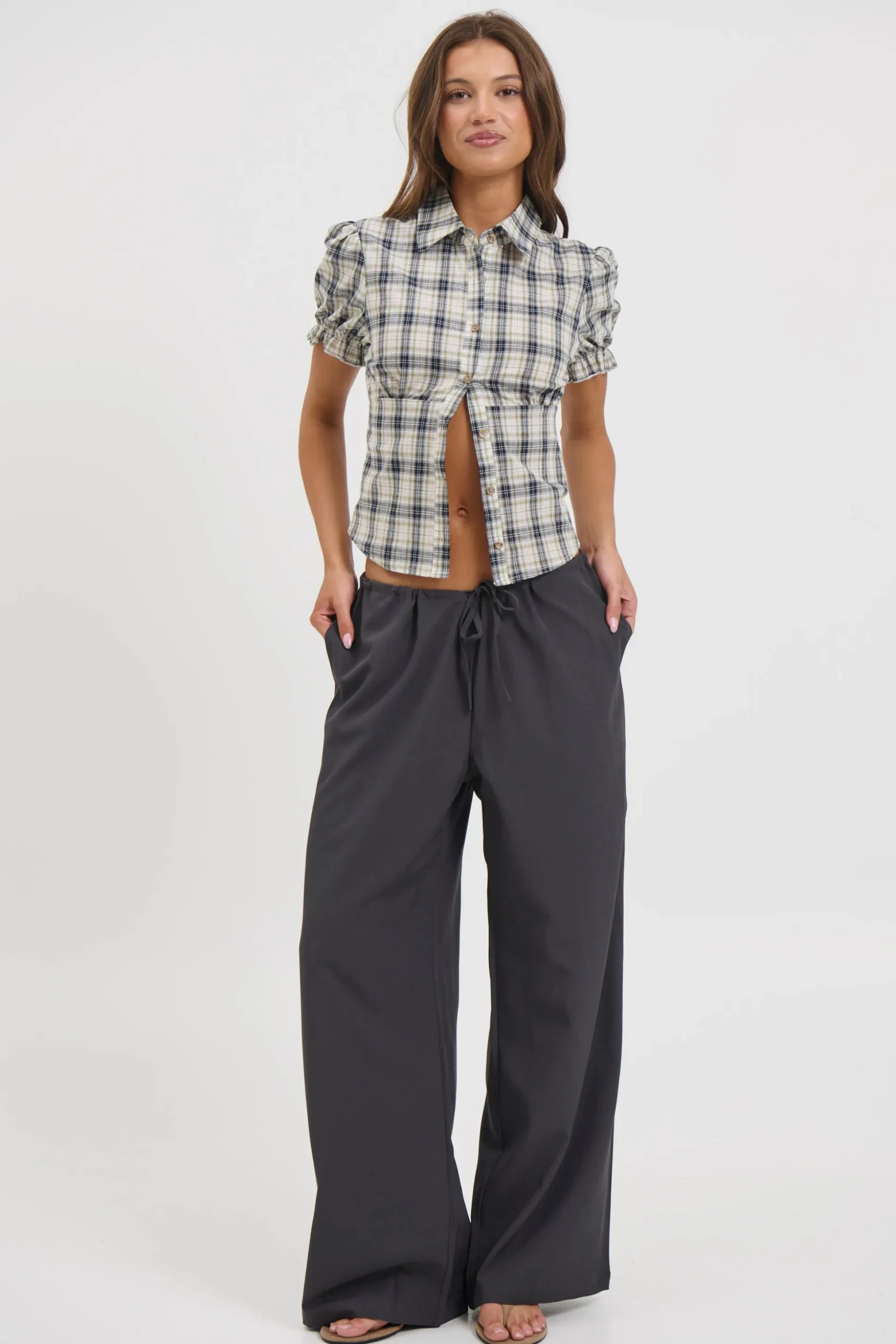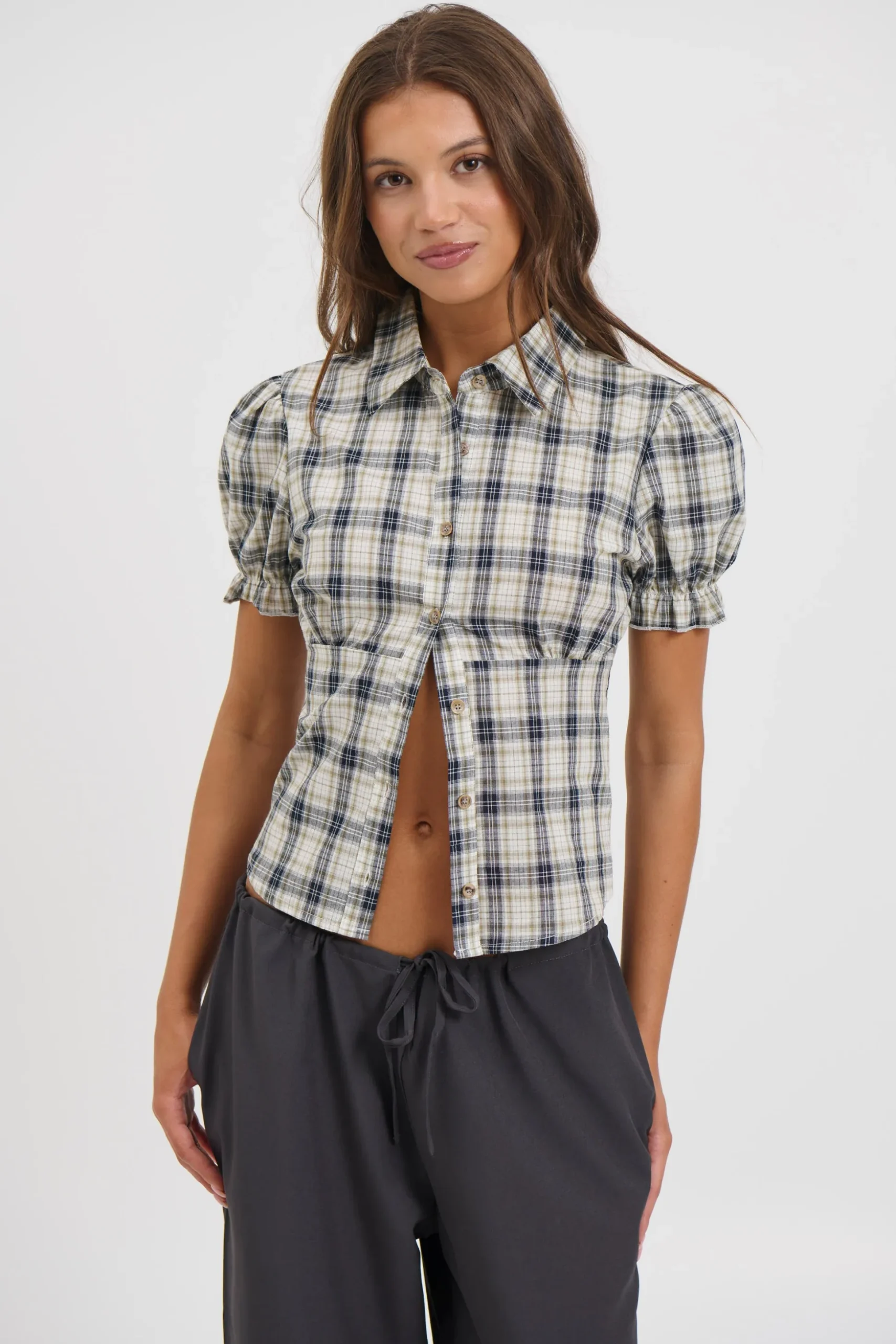Meet the Astra Short Sleeve Shirt, Featuring a button-up collared neckline and short, slightly puffy sleeves bring a soft feminine touch. A ribbed back panel offers stretch and comfort, balancing the crisp shirt front with a relaxed fit. Perfect for styling from work to weekend.