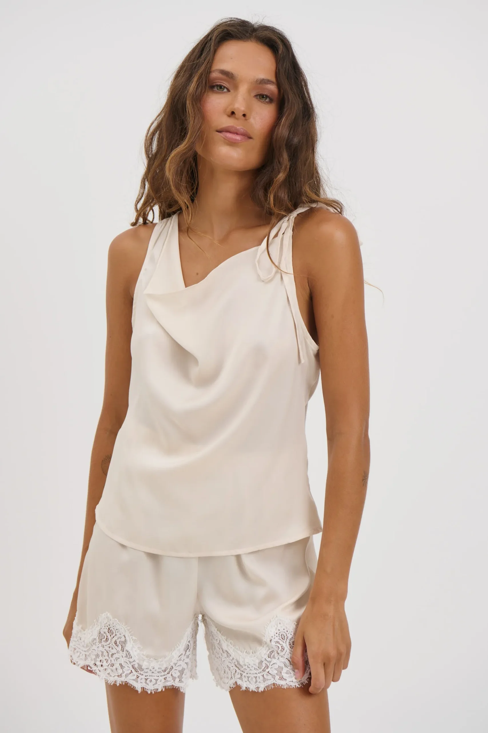 Meet the Ayla Set, Featuring a coordinated set designed for effortless style and comfort, this ensemble includes relaxed-fit shorts with a delicate lace hem, paired with a relaxed top accented by a side zipper and adjustable tie shoulder detail. Perfect for casual days or laid-back evenings, this set combines subtle femininity with modern ease.