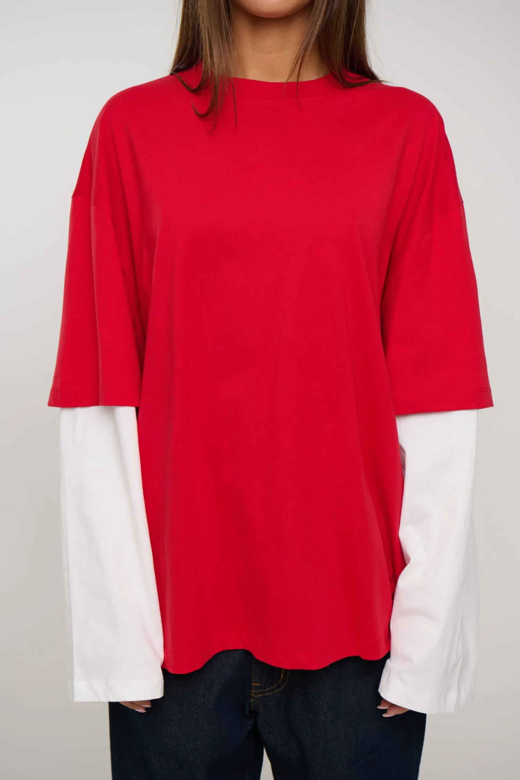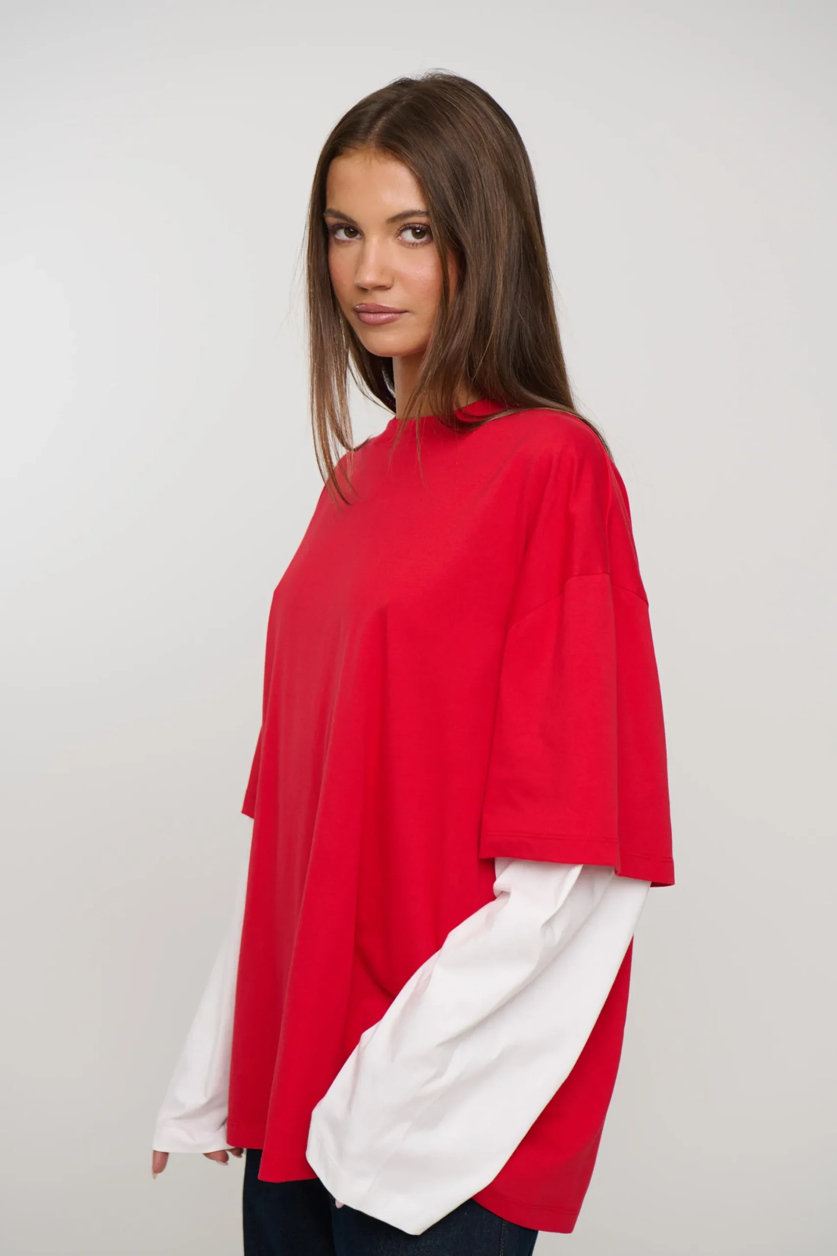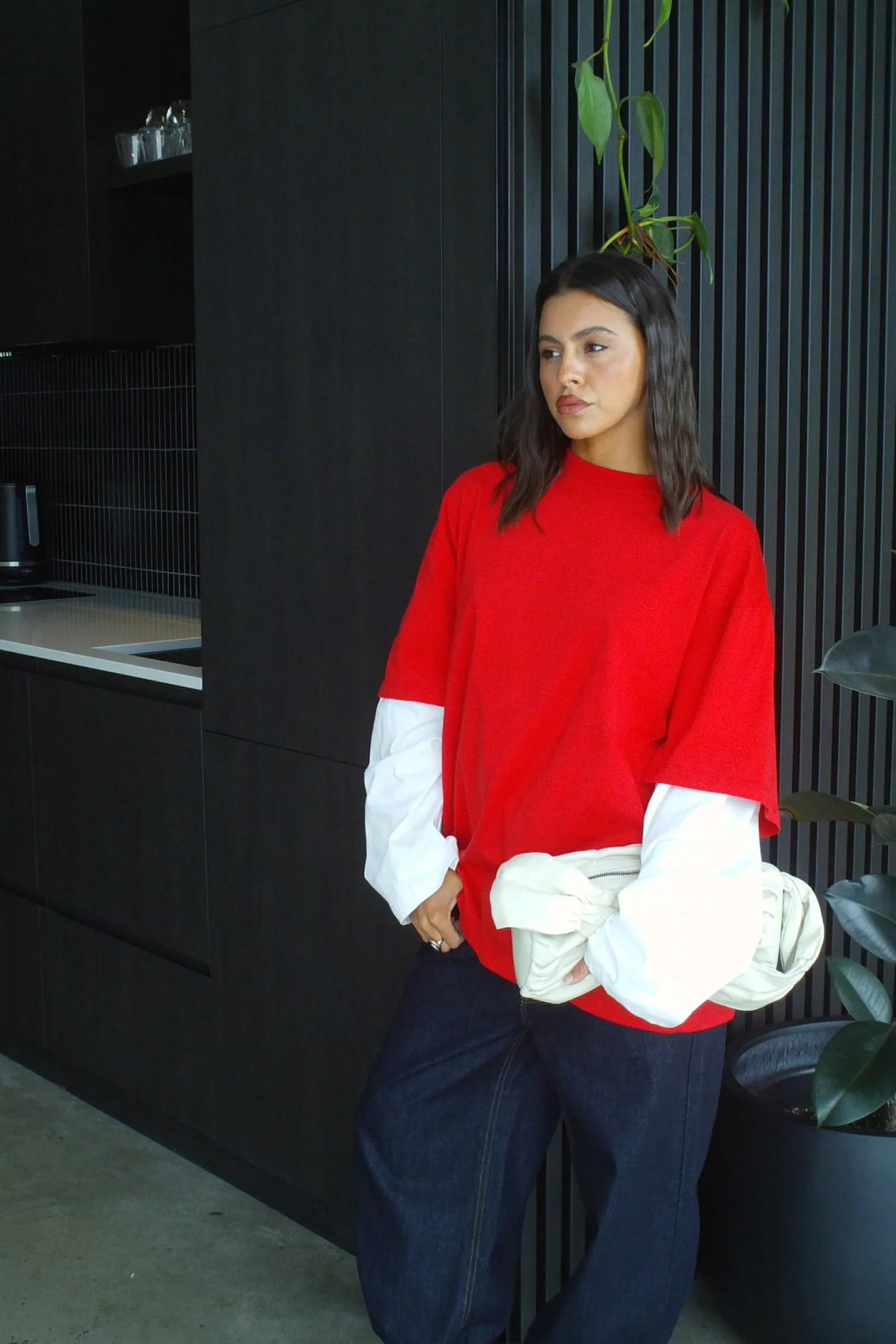 The Bottega Shirt is designed with an oversized fit, featuring a crew neckline and dropped shoulders. It incorporates faux shirting sleeves and is made entirely from 100% cotton for comfort and breathability.