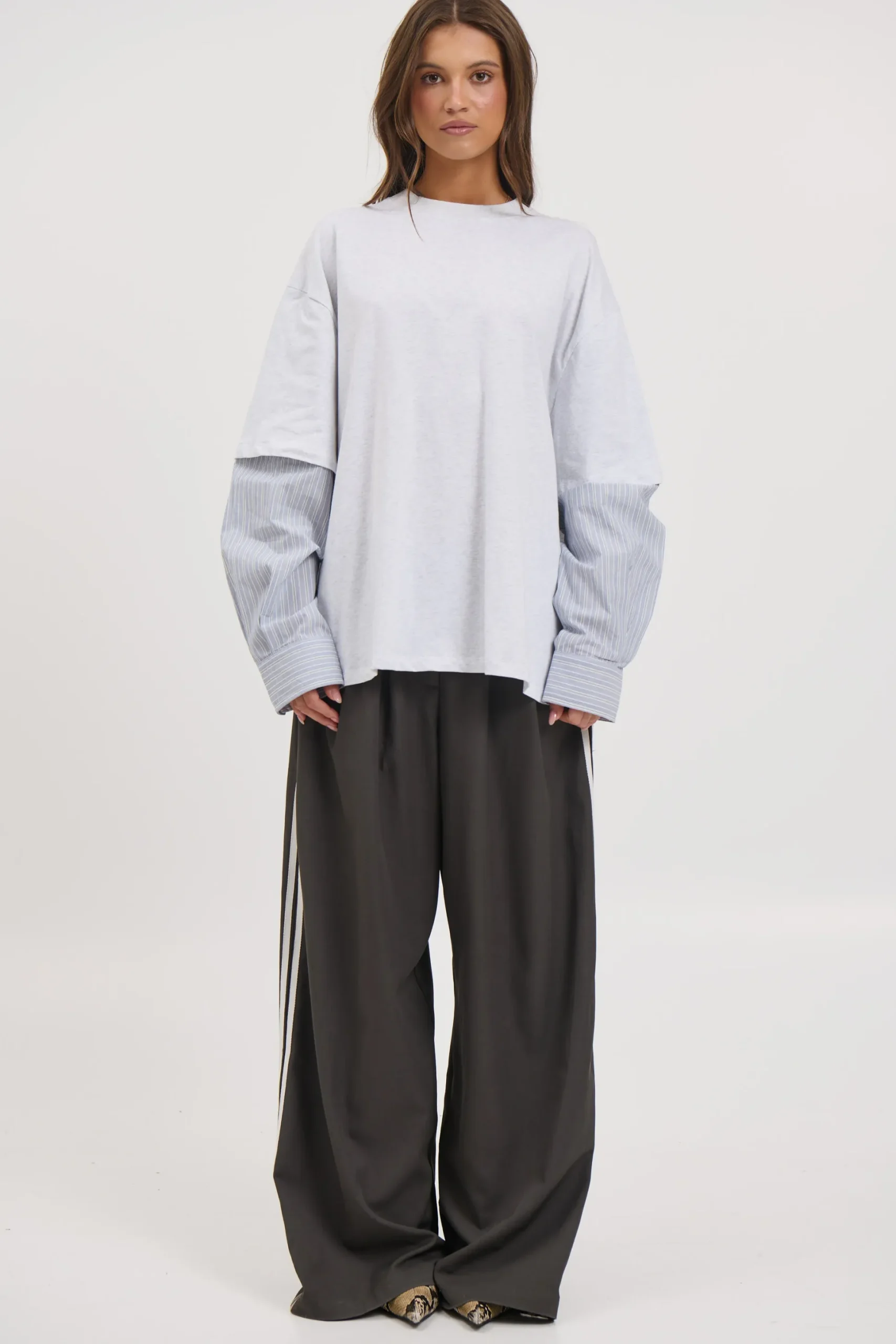 The Bottega Shirt is designed with an oversized fit, featuring a crew neckline and dropped shoulders. It incorporates faux shirting sleeves and is made entirely from 100% cotton for comfort and breathability.