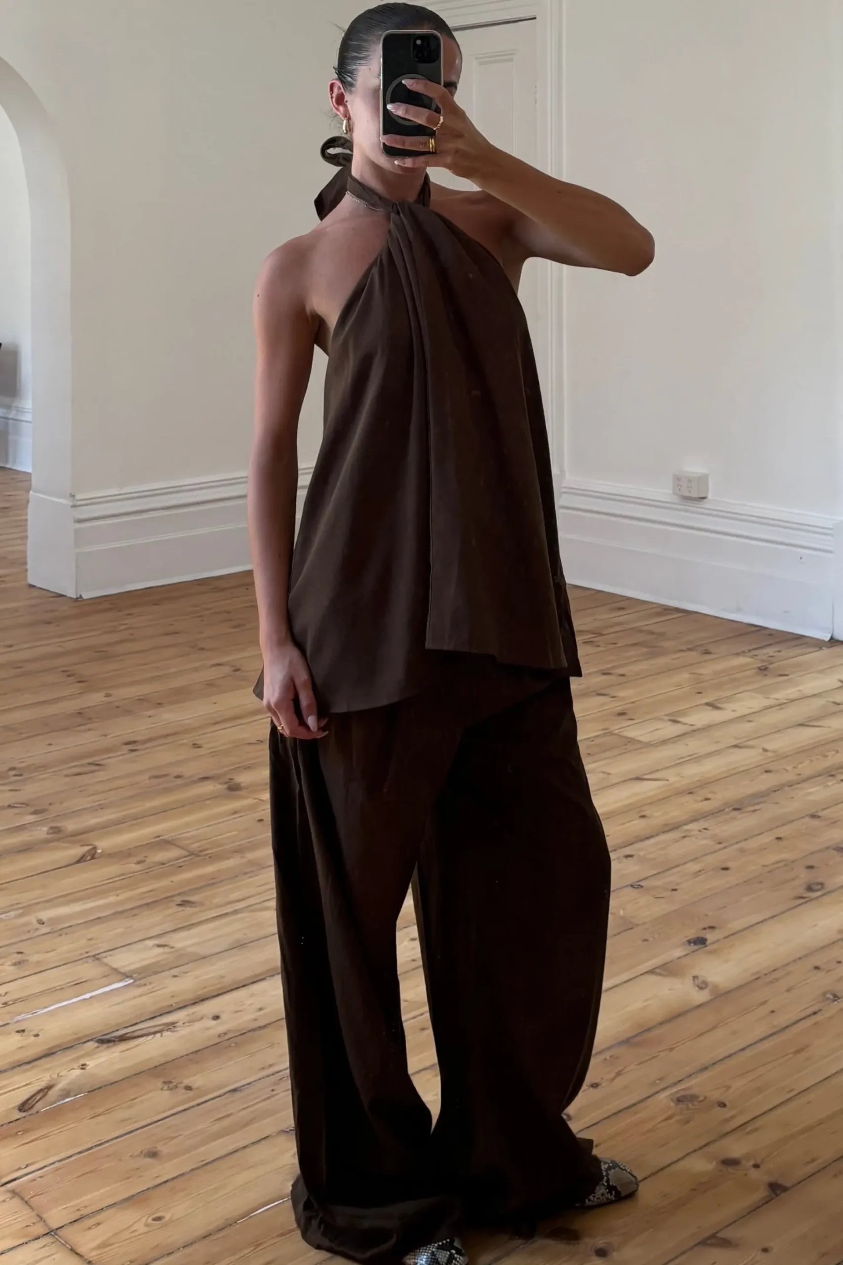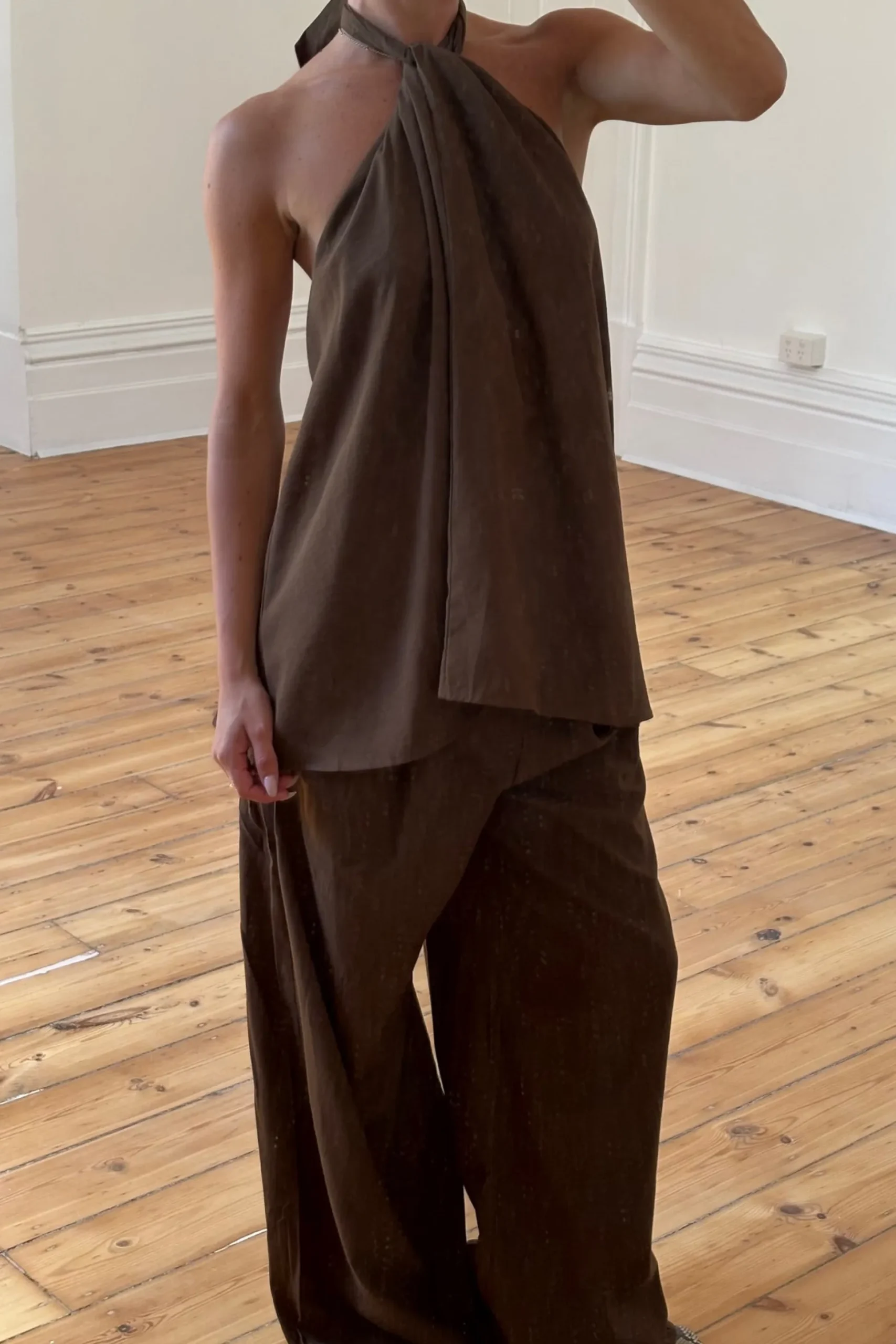 Meet the Brinly Set, the top features a chic halter neckline and a low back accented by an elasticated back strap for a secure yet comfortable fit. Its flowy silhouette adds soft movement and feminine charm. Paired with long, wide-leg pants designed for a flattering drape, this set combines ease and sophistication. The pants are finished with practical pockets and a sleek side-zip closure for a smooth, tailored look.