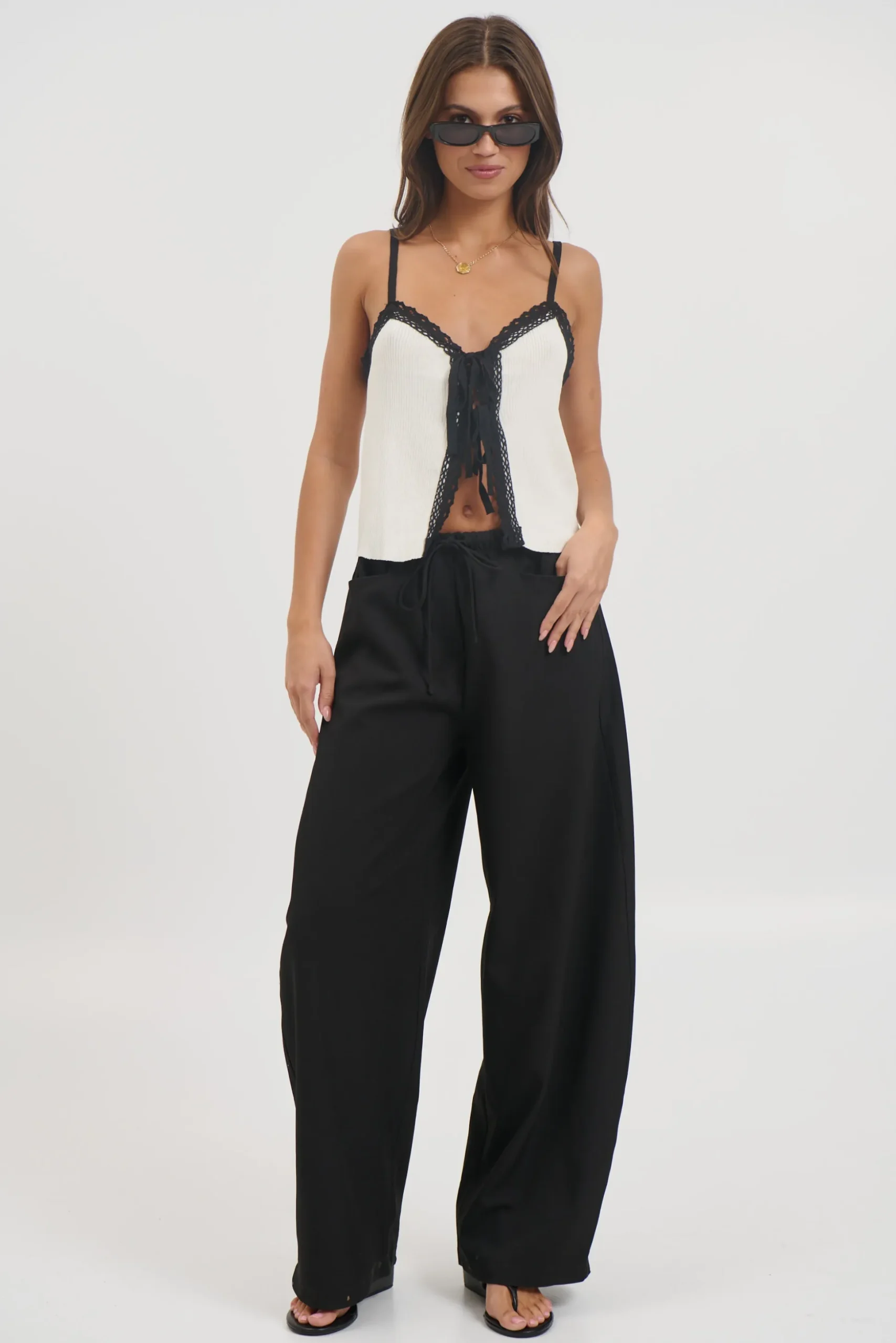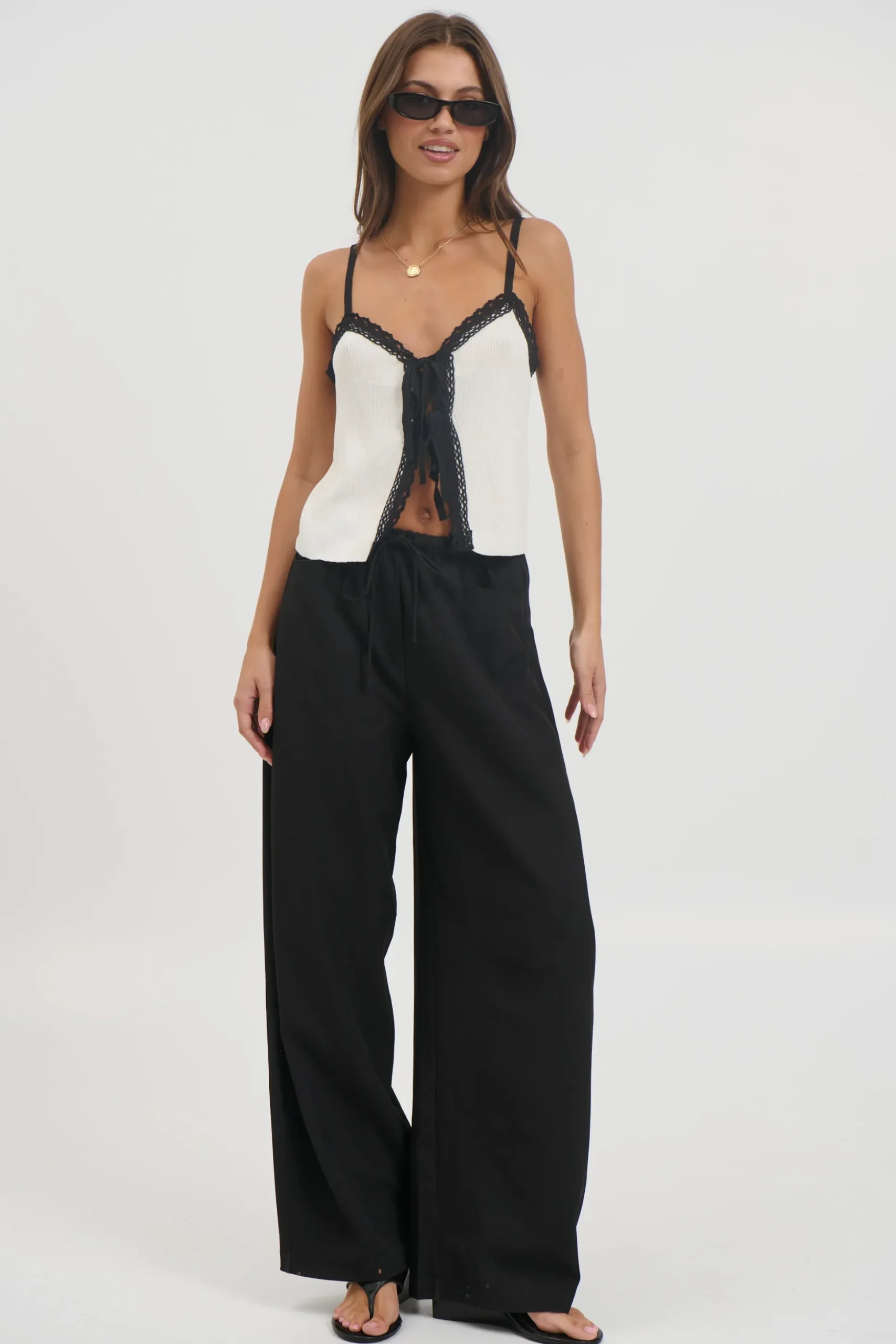 Meet the Byron Lace Cami, crafted from soft ribbed material for a flattering, comfortable fit. Featuring a chic front tie-up closure, delicate thin straps, and intricate lace detailing along the hems, this top effortlessly blends playful charm with subtle elegance.