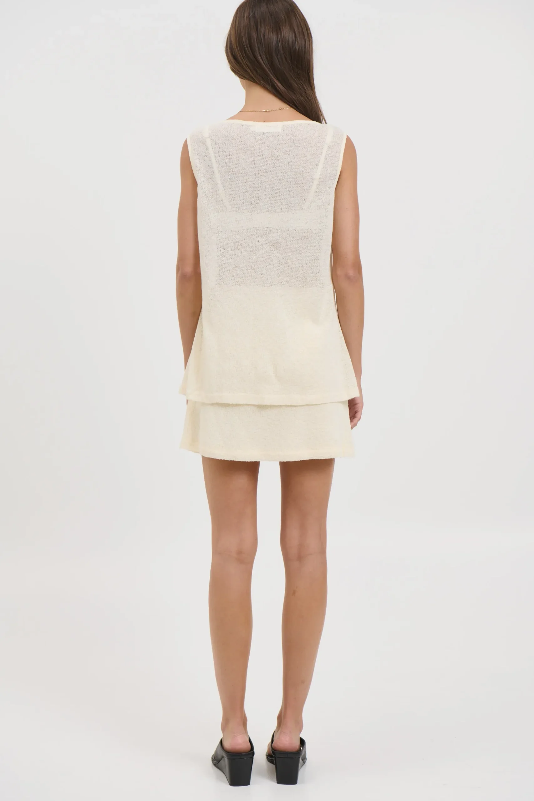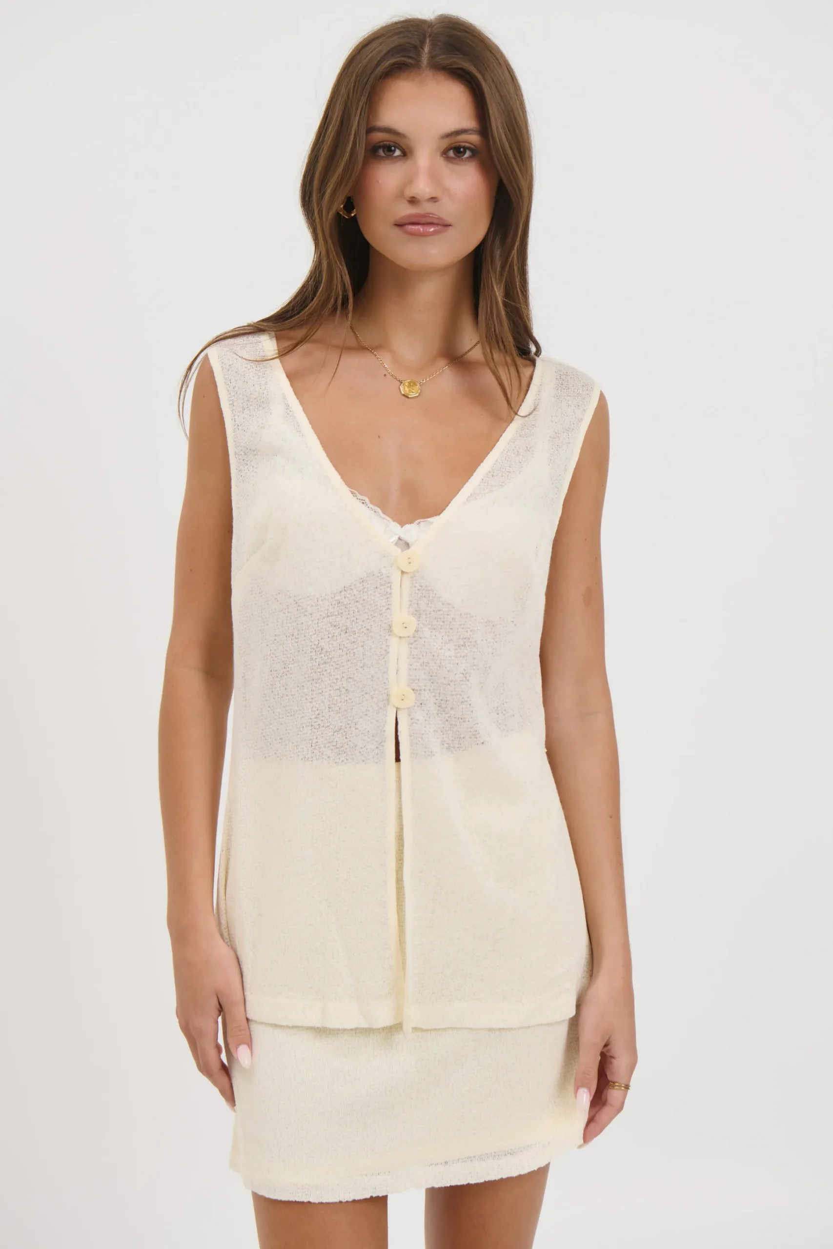 Meet the Camila Set, Featuring a knitted sheer long-line vest and matching mini skirt. The vest is cut with a flattering V-neck and fastens neatly with front buttons, creating a clean, elongated silhouette. Completing the set, the matching mini skirt is fully lined for comfortable coverage while maintaining a smooth, streamlined finish.