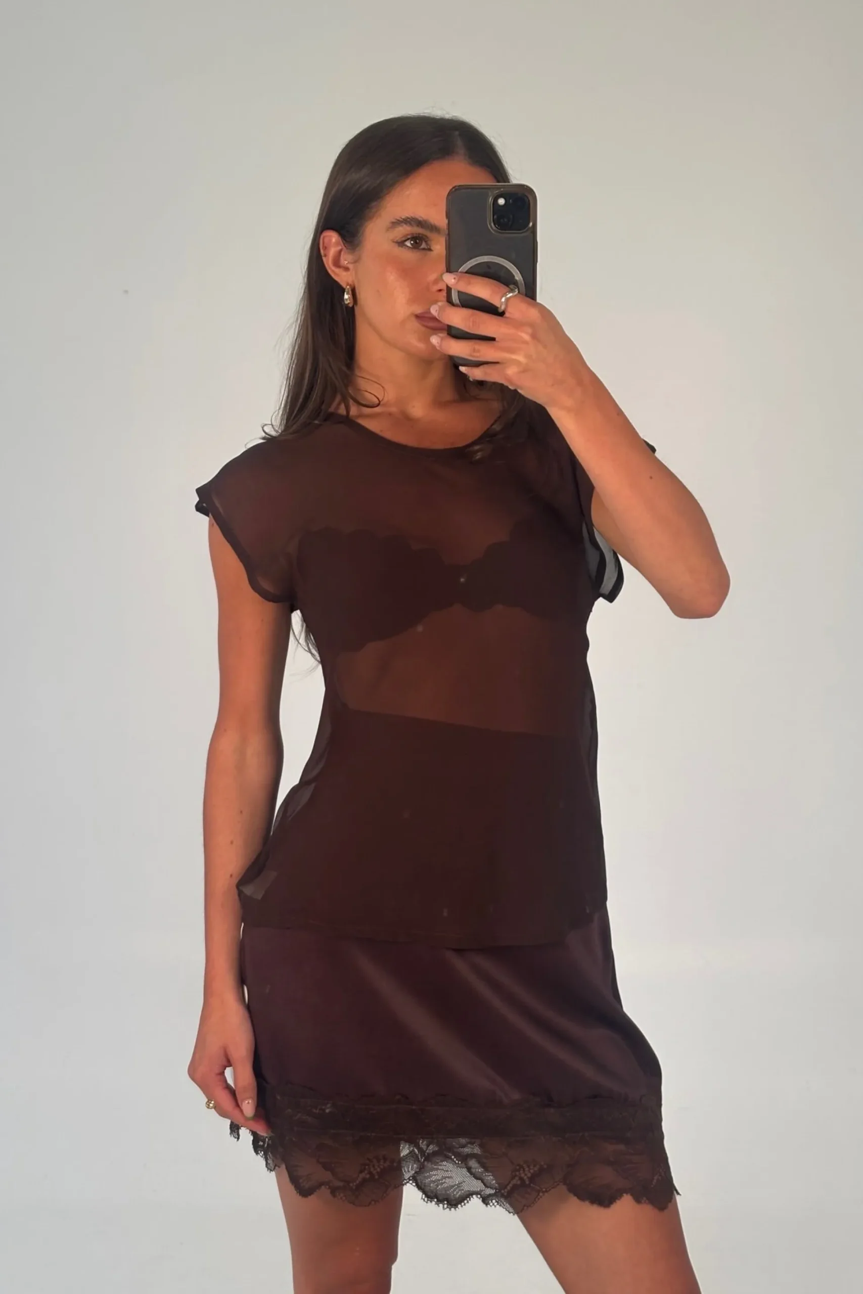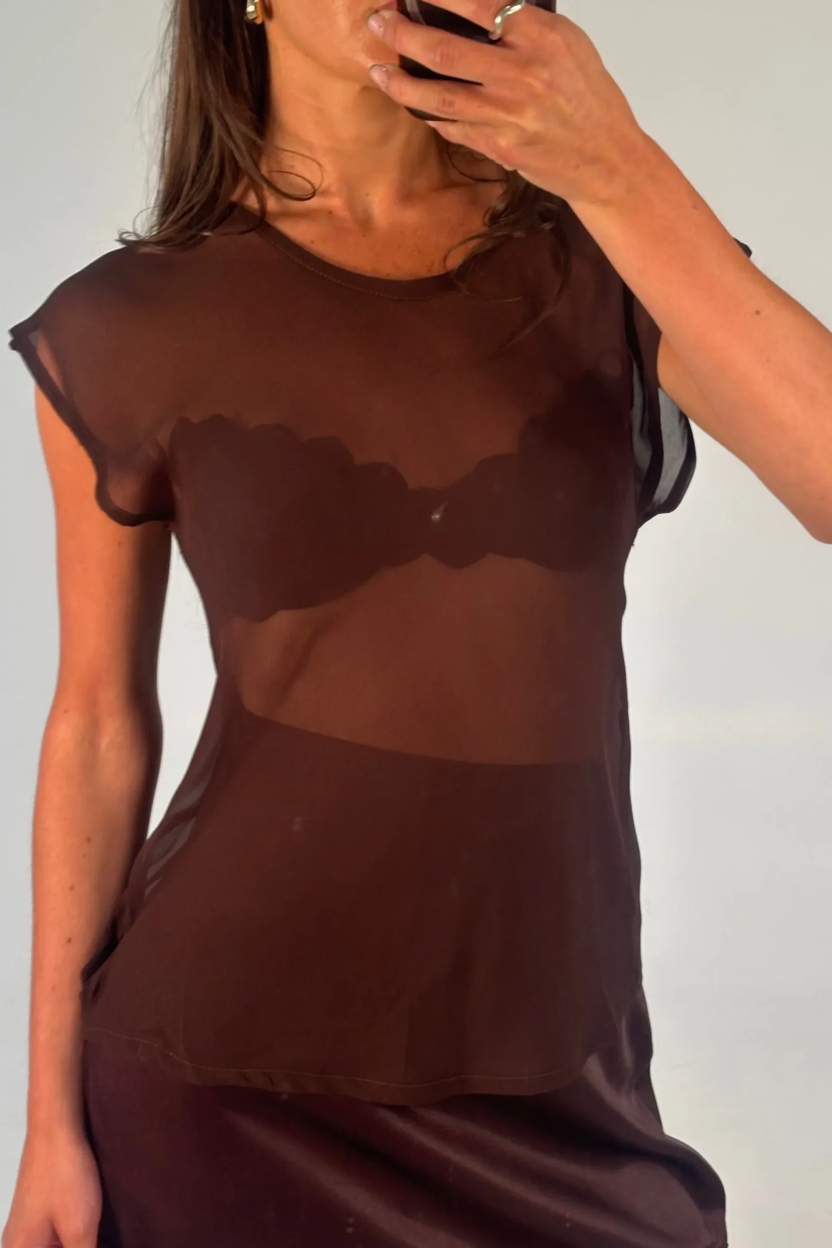 Meet the Camille Sheer Top, Featuring a sheer mesh tee crafted with a soft, flowy drape, this style offers an effortless, airy look. It’s designed with an oversized neck hole for easy on-and-off and finished with a subtle button closure at the back for a clean, minimal touch.