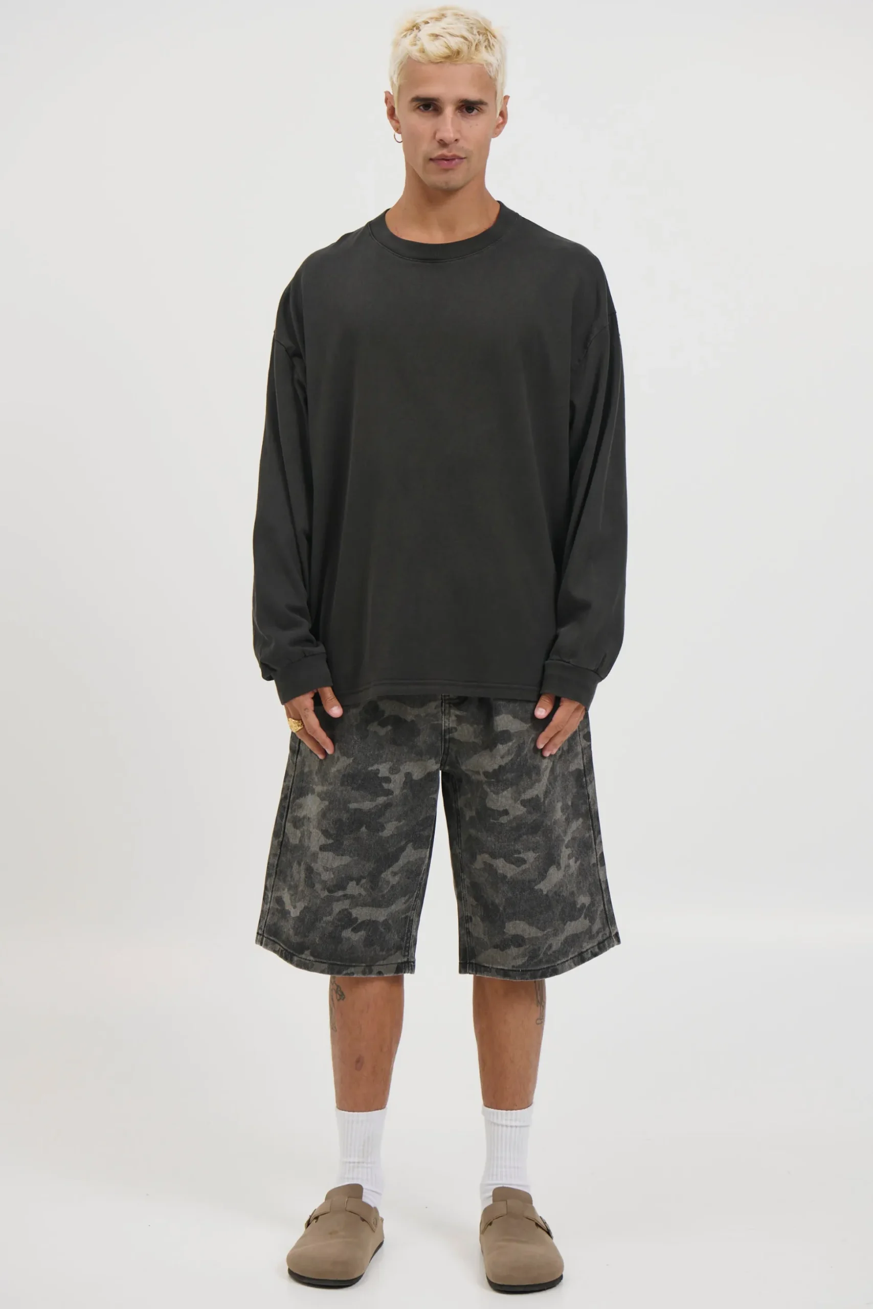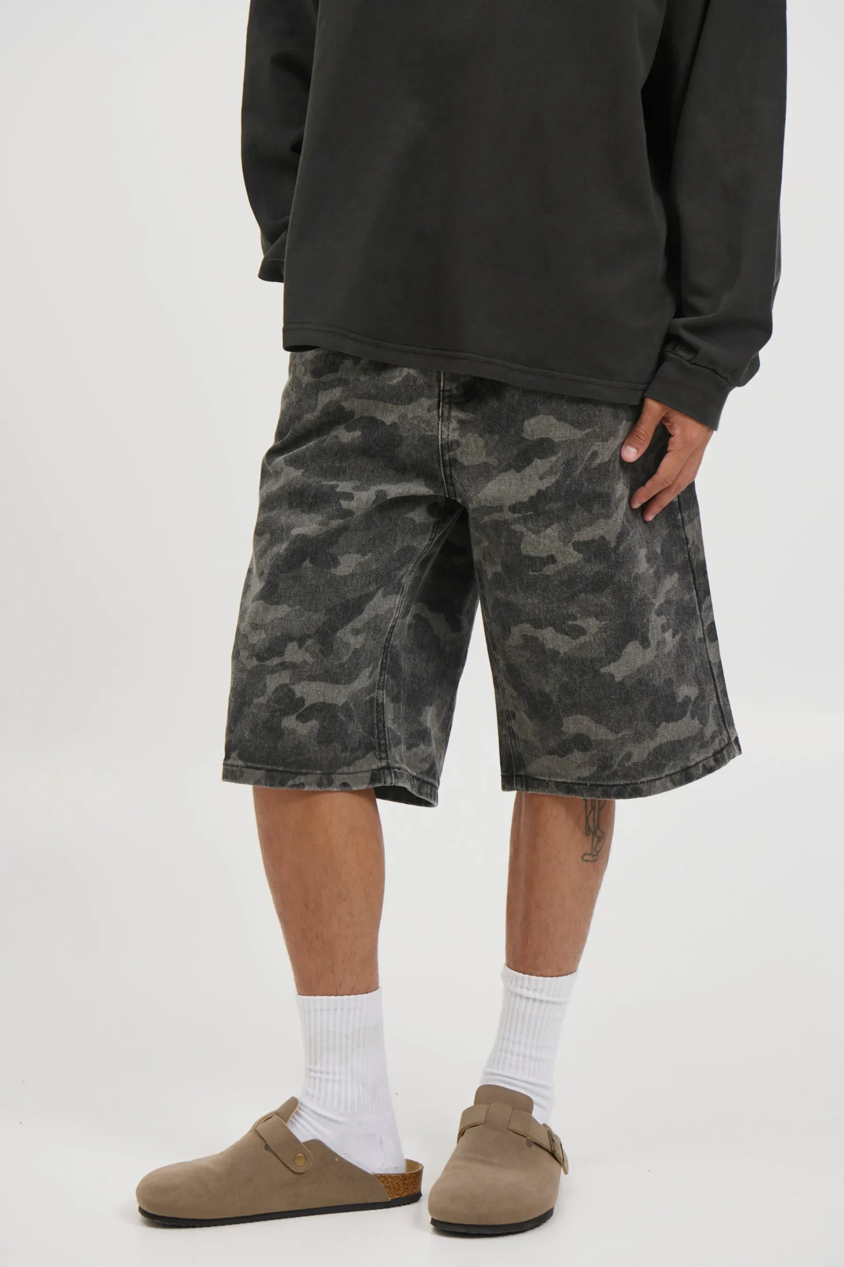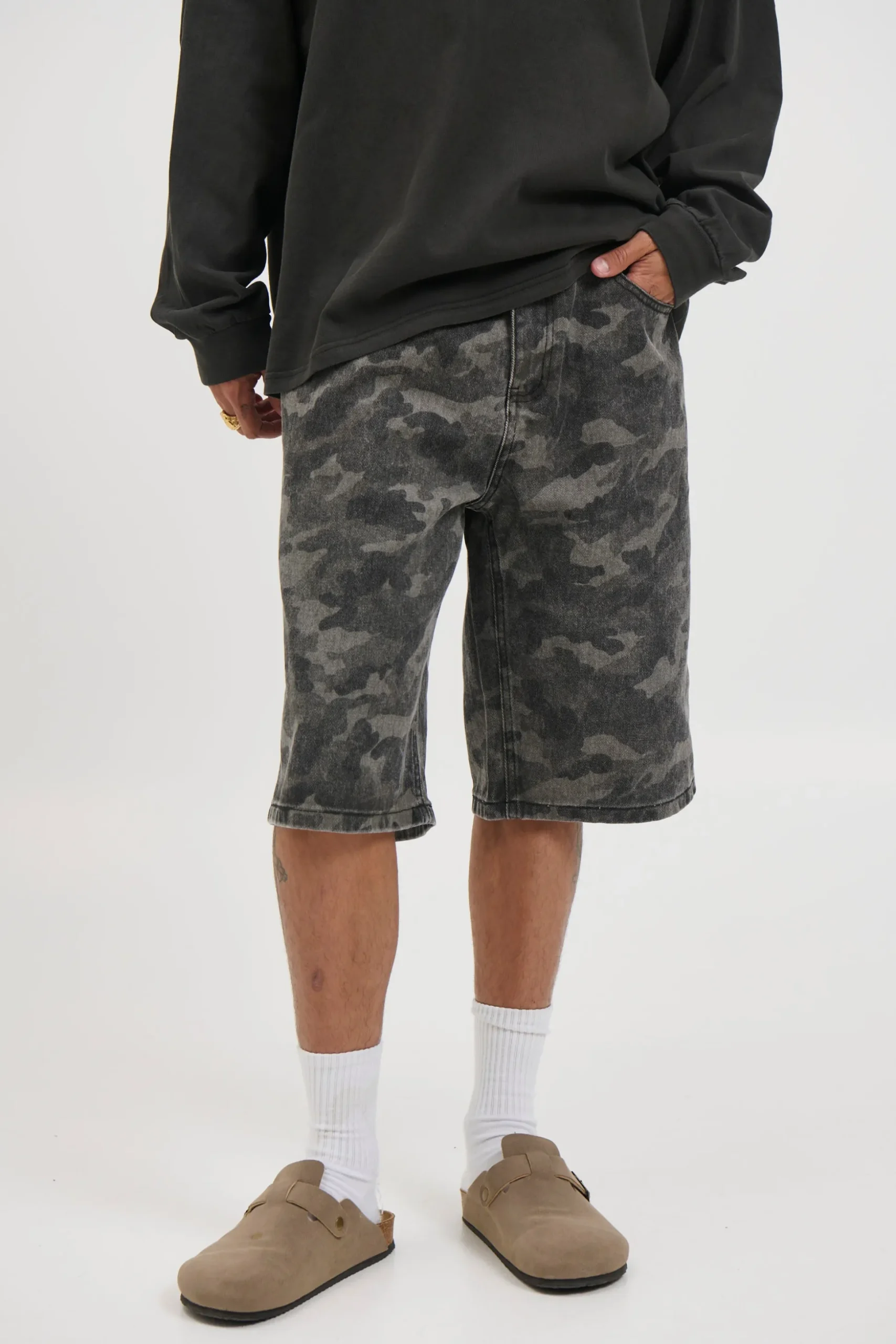 Meet the Camo Baggy Short, Featuring a washed camo print, these men’s shorts are designed with a relaxed fit and knee-length cut for everyday comfort. Crafted from durable denim, they include side and back pockets for functionality, finished with a casual raw-style hem. Perfect for laid-back streetwear styling.