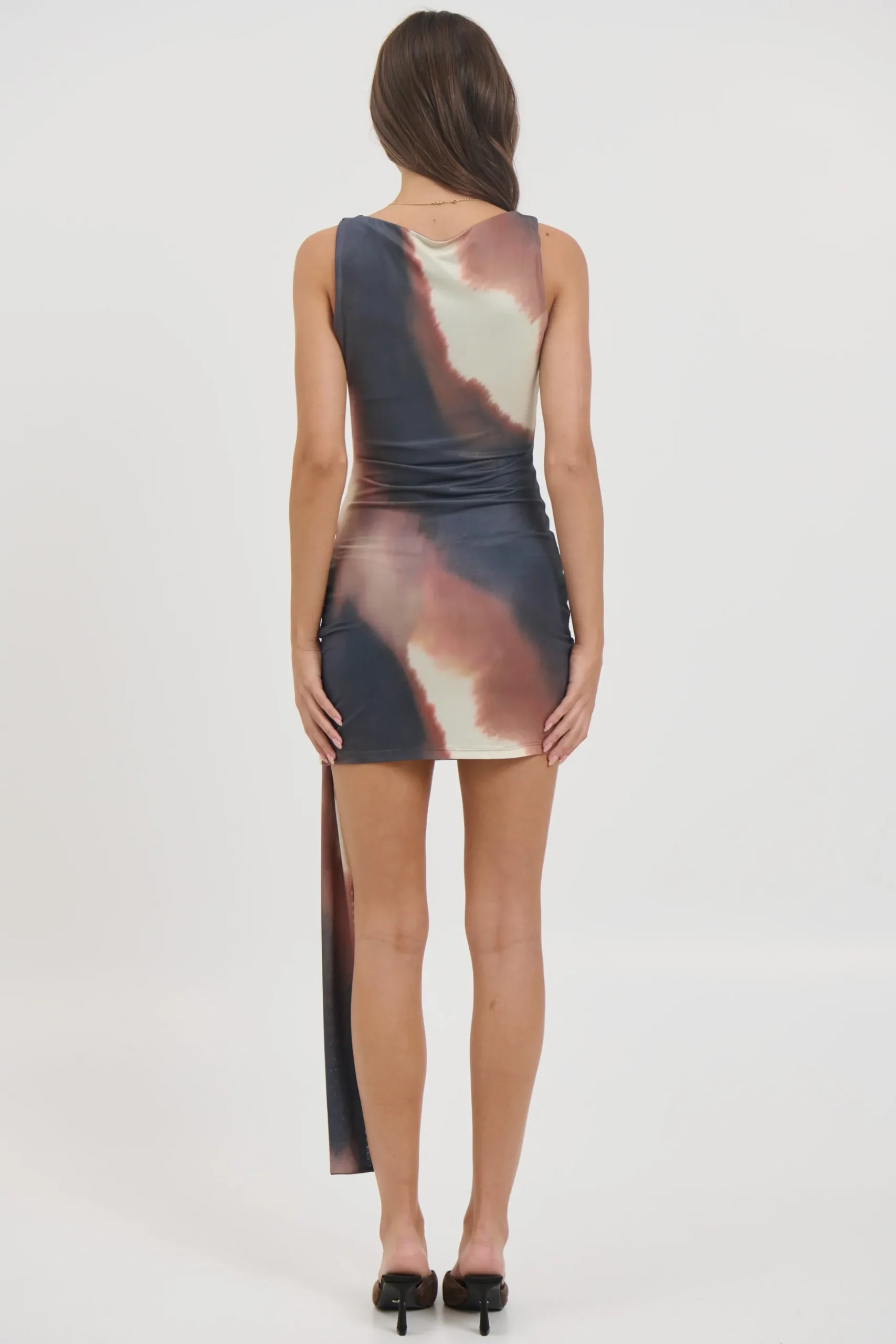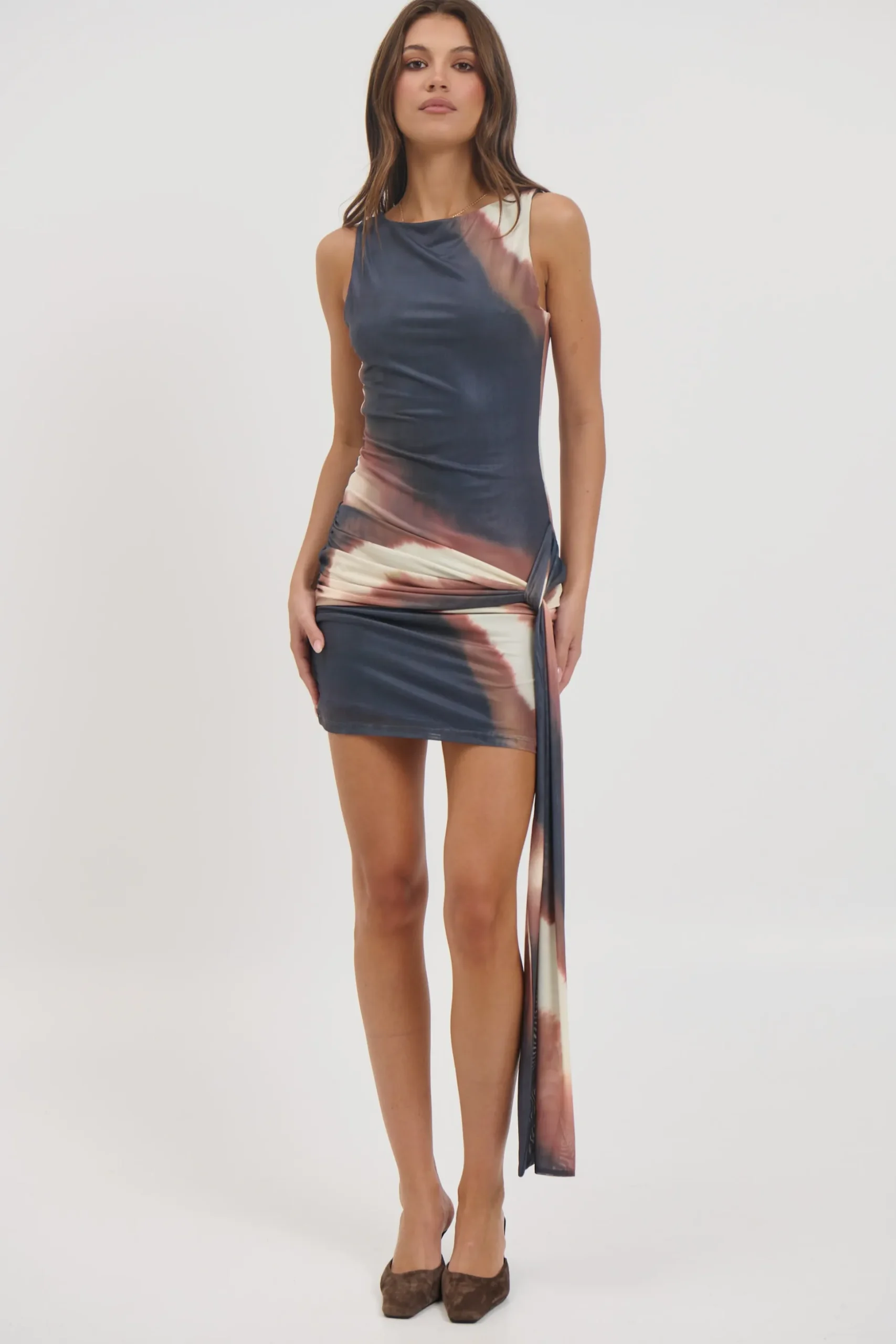 Meet the Chala Mini Dress, featuring a sleek high neckline and sleeveless design for a modern edge. Crafted from soft mesh with a subtle printed finish, it hugs the body in a flattering fitted silhouette. The front knot detail adds a touch of texture and shape, while the fully lined interior ensures comfort and confidence all night long.