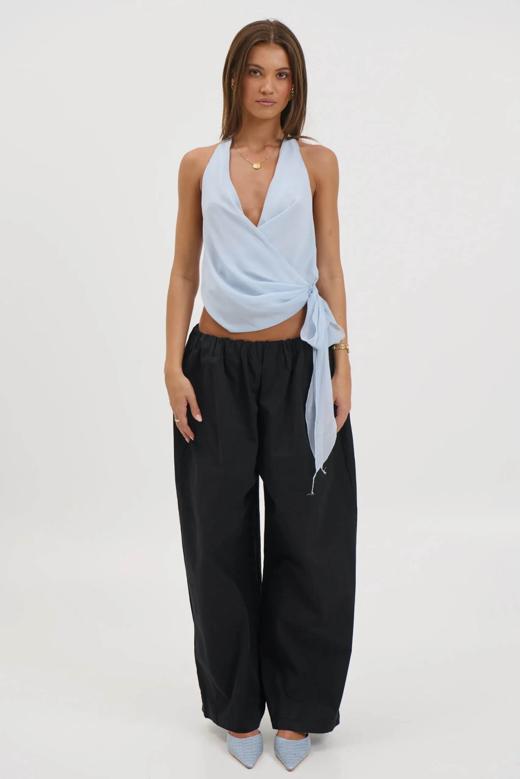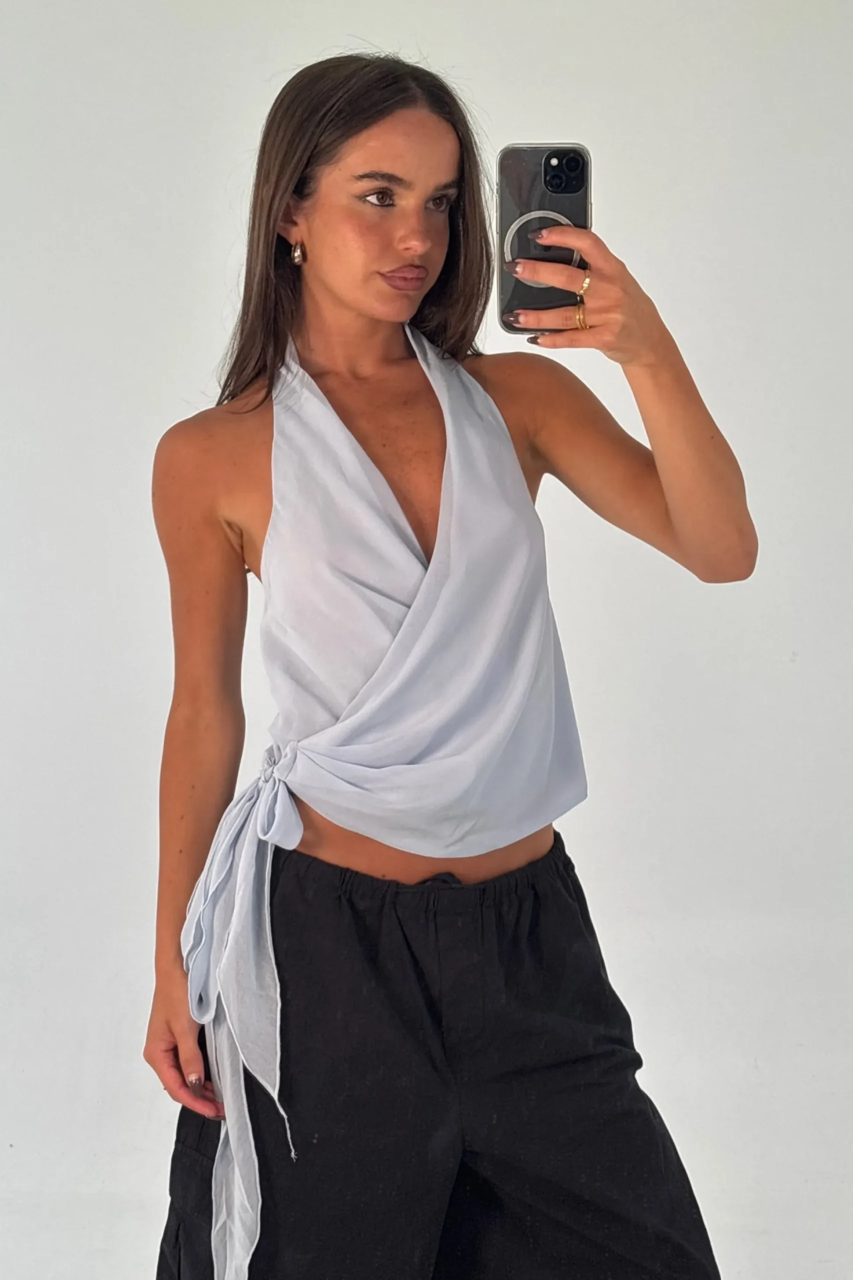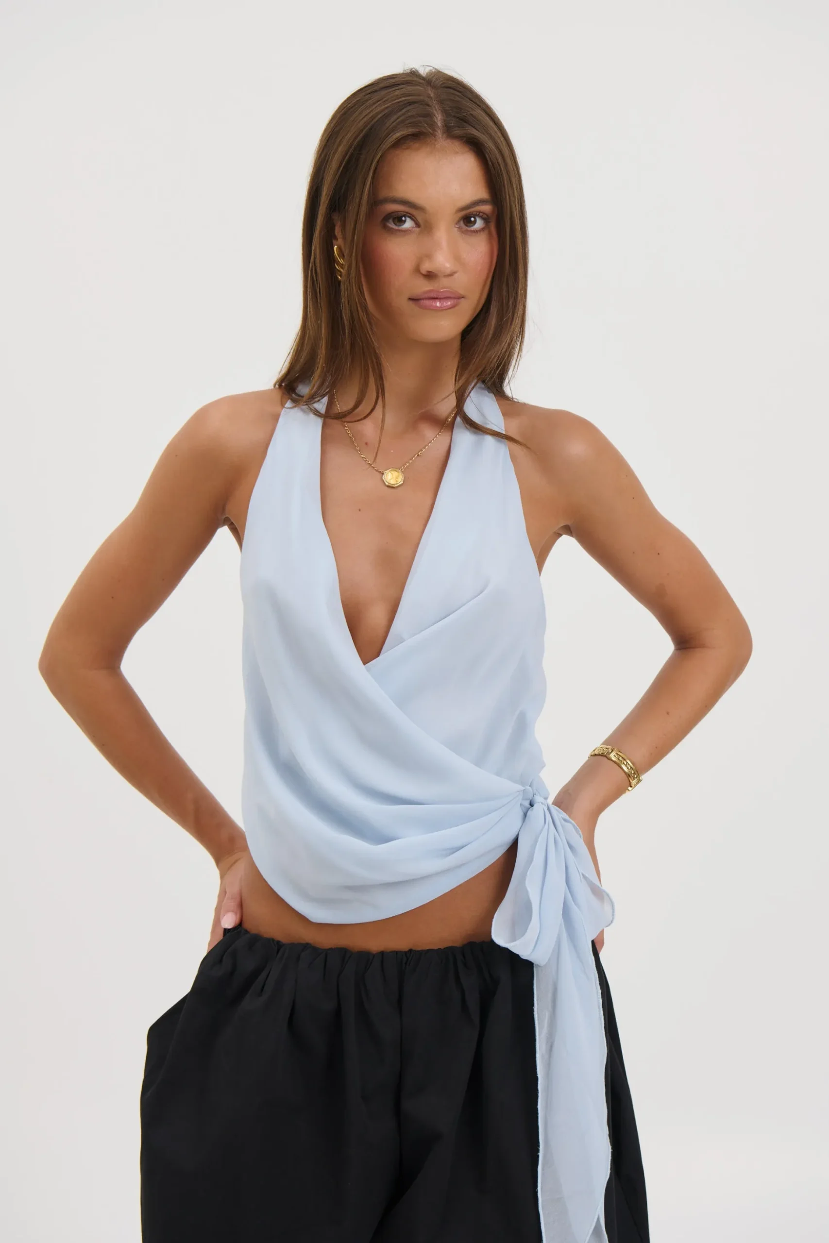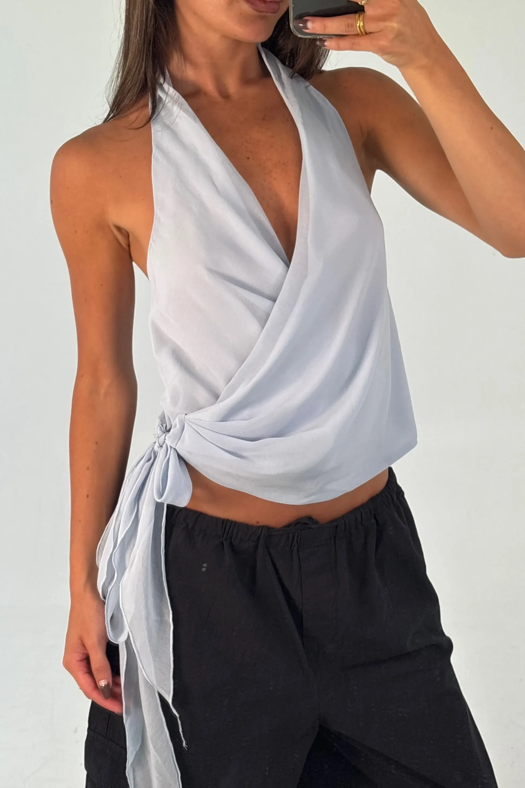 Meet the Cherri Top, Featuring a flattering halter neckline and a deep V-neck, the wrap-around style creates a sculpted silhouette that enhances the waist. The cropped length adds a contemporary finish, making it perfect for pairing with high-waisted jeans, skirts, or tailored pants.