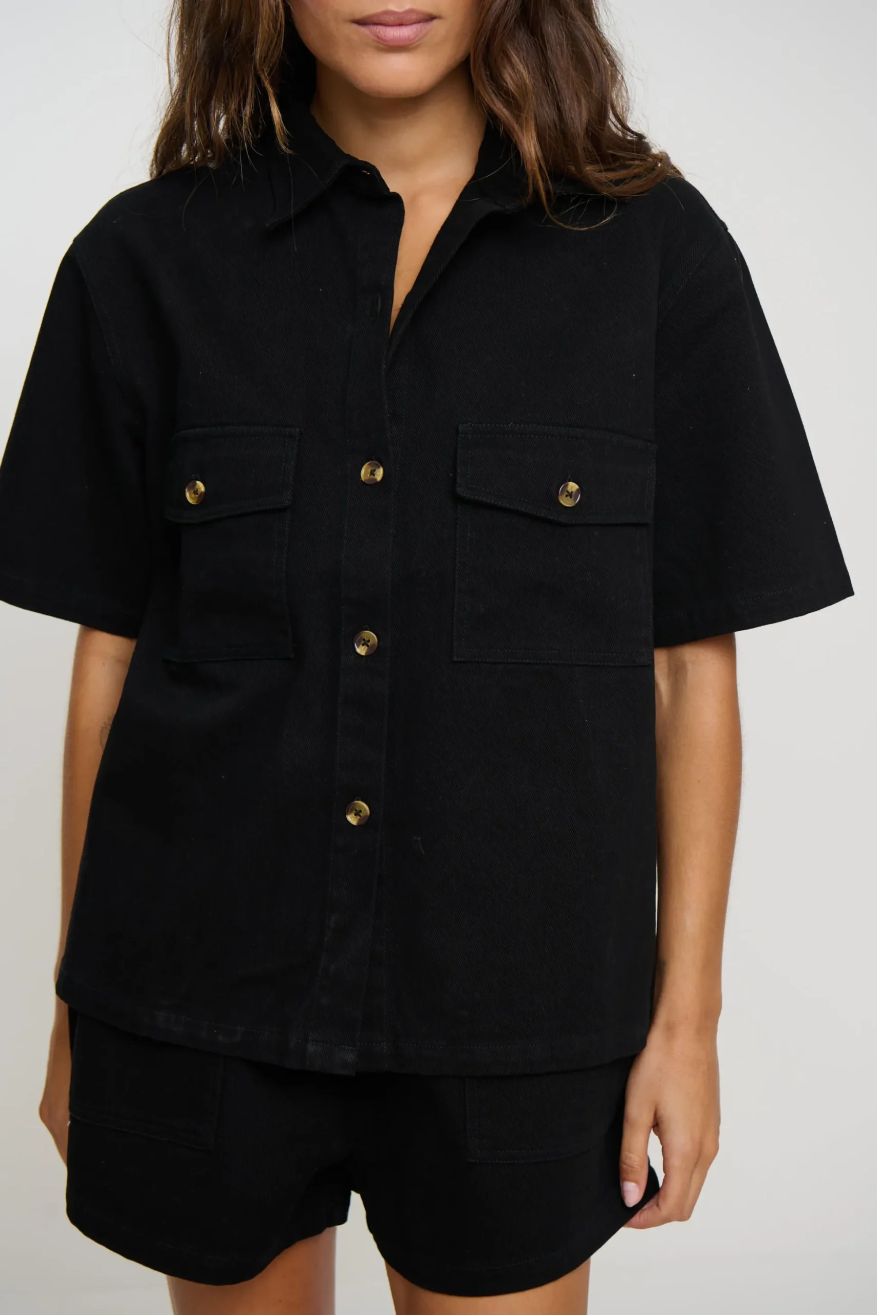 Meet the Delaney Set. Featuring a relaxed-fit collared button-down top with chest pockets and short sleeves for a laid-back vibe. Paired with matching shorts, designed with side pockets, an elasticated waistband for comfort, and a decorative waist tie for a touch of style. Perfect for easygoing, warm-weather days.