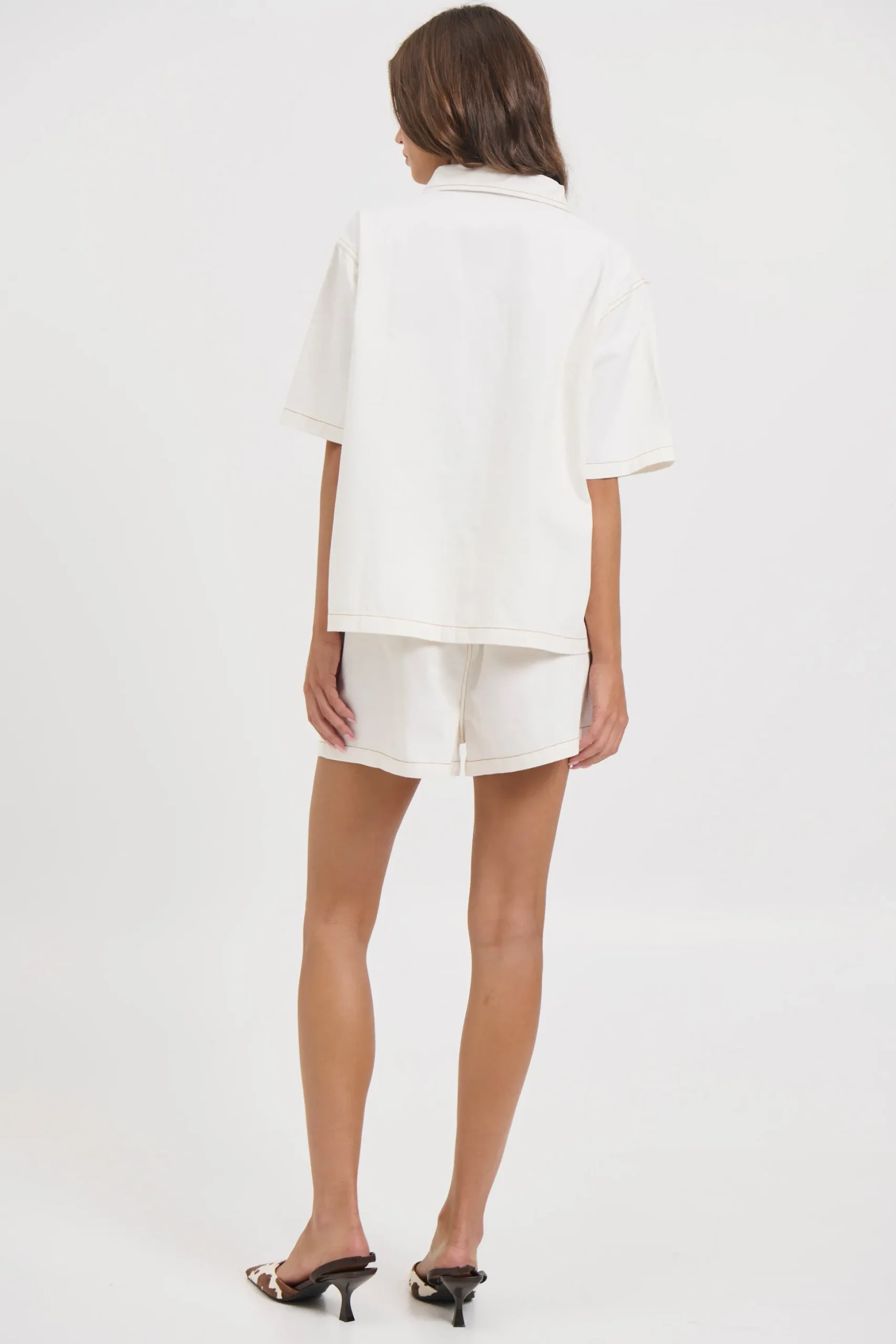 Meet the Delaney Set. Featuring a relaxed-fit collared button-down top with chest pockets and short sleeves for a laid-back vibe. Paired with matching shorts, designed with side pockets, an elasticated waistband for comfort, and a decorative waist tie for a touch of style. Perfect for easygoing, warm-weather days.