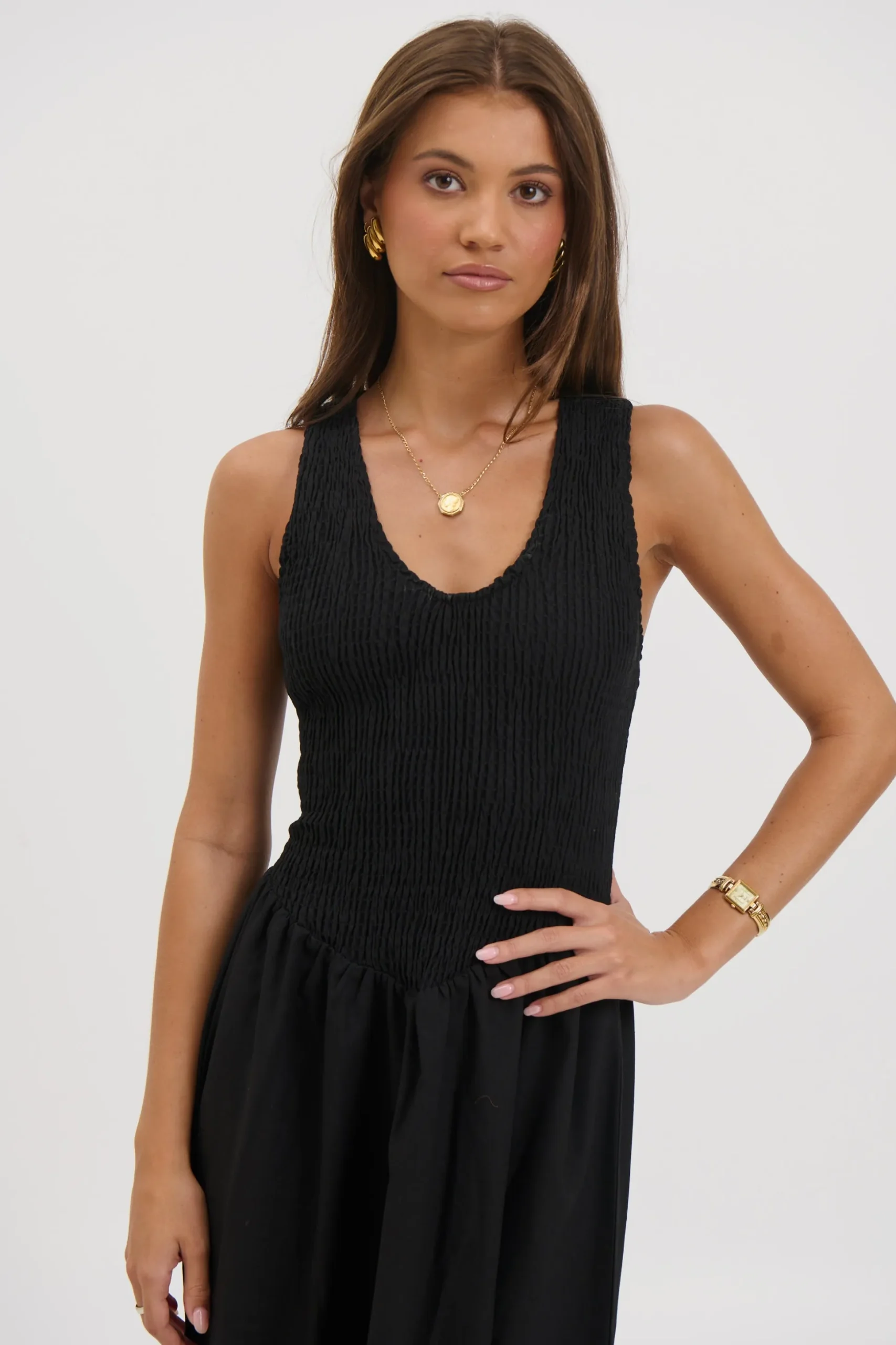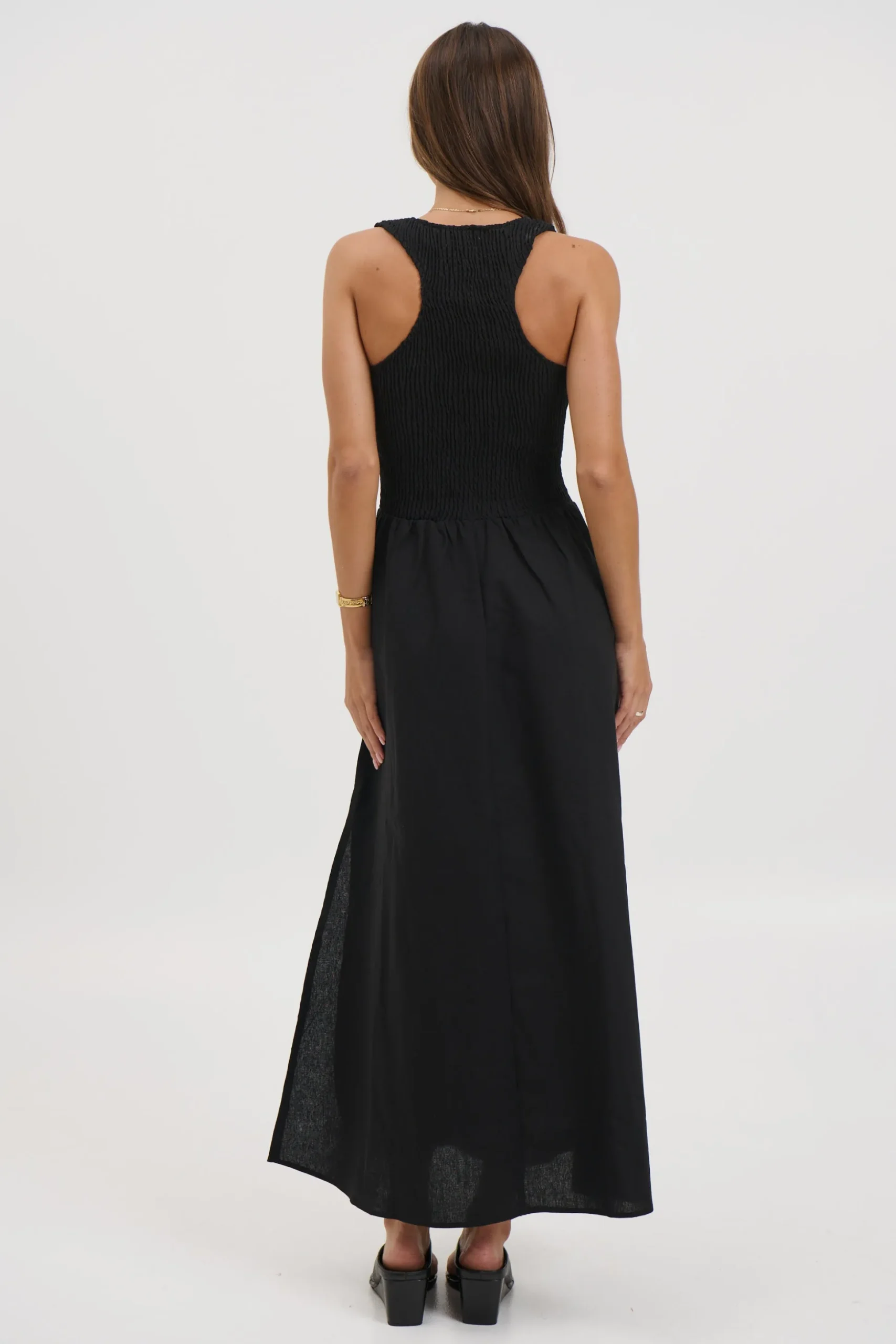 Meet the Destiny Maxi Dress, Featuring a sleeveless bodice features a shirred racer-back design that offers a comfortable, flexible fit while creating a softly structured shape through the top. Flowing seamlessly into a full-length, airy skirt, the dress drapes beautifully with every step, delivering an easy elegance that moves from day to night with ease