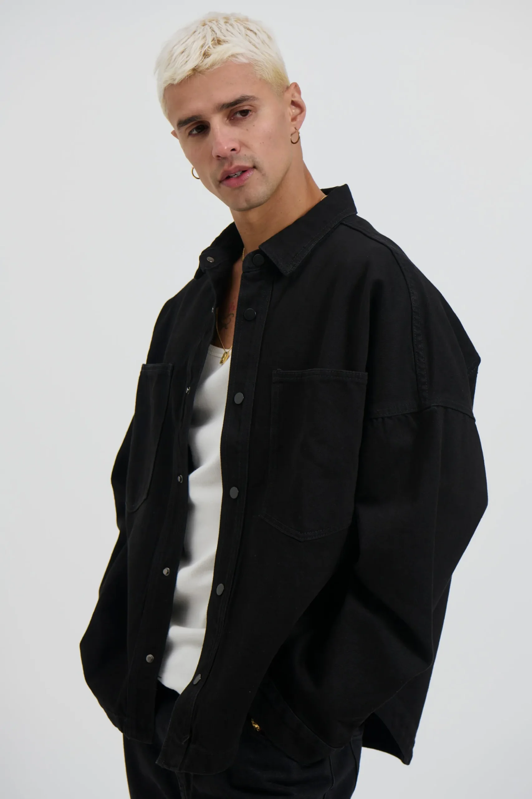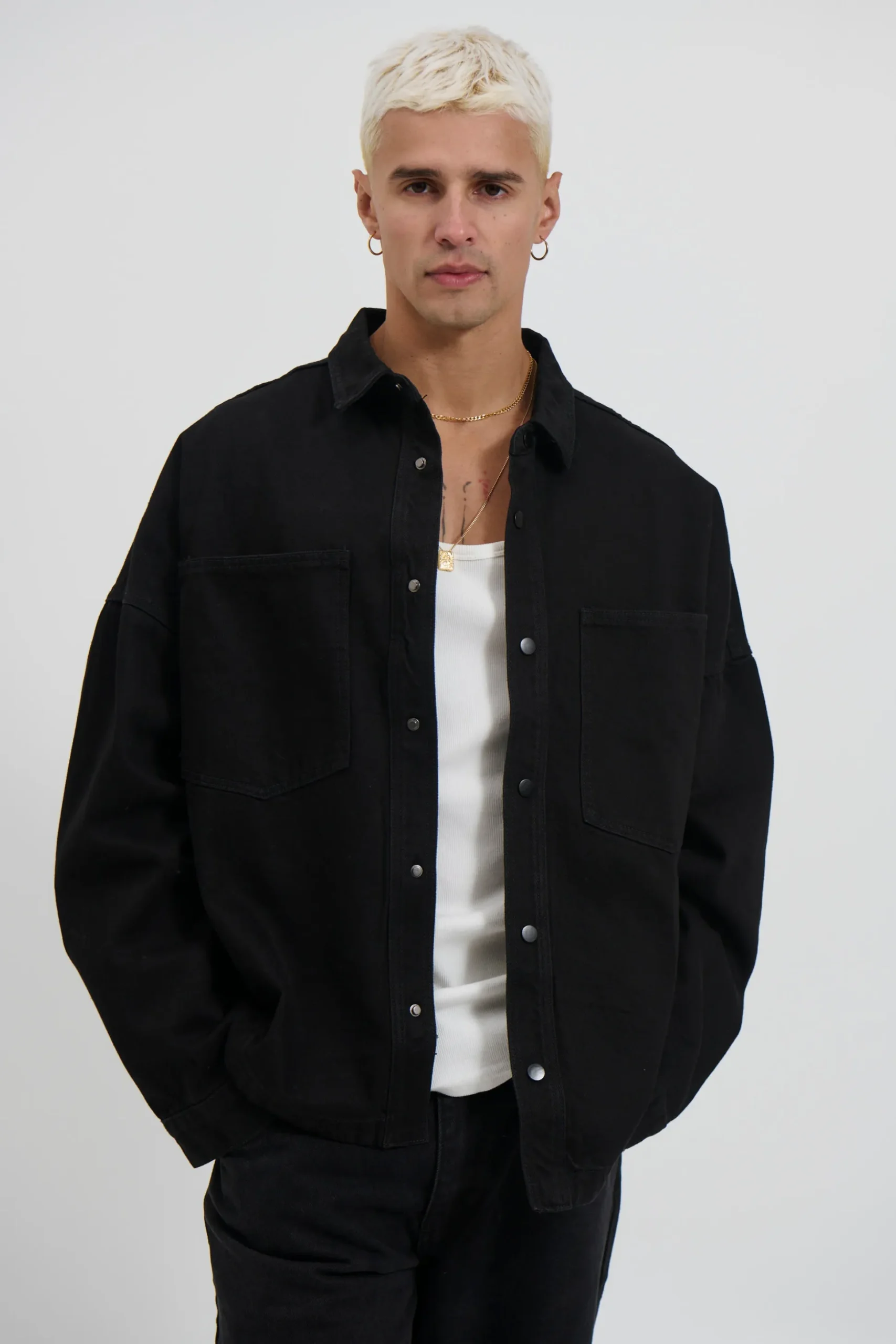 The Drop Shoulder Denim Shirt features a heavyweight design with drop shoulders and a stud press closure on the front. The double pockets at the front add functionality and a boxy fit for a stylish look.