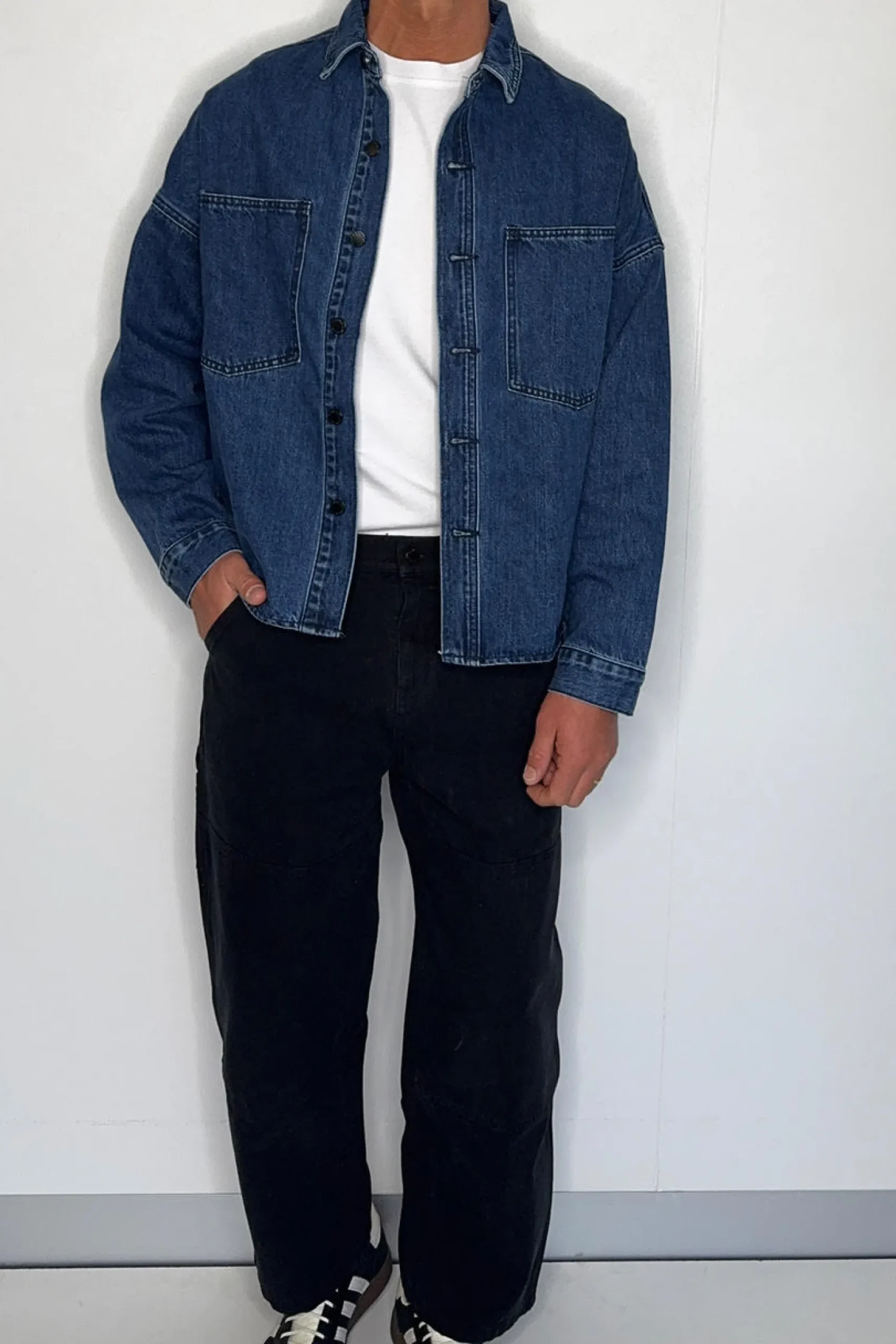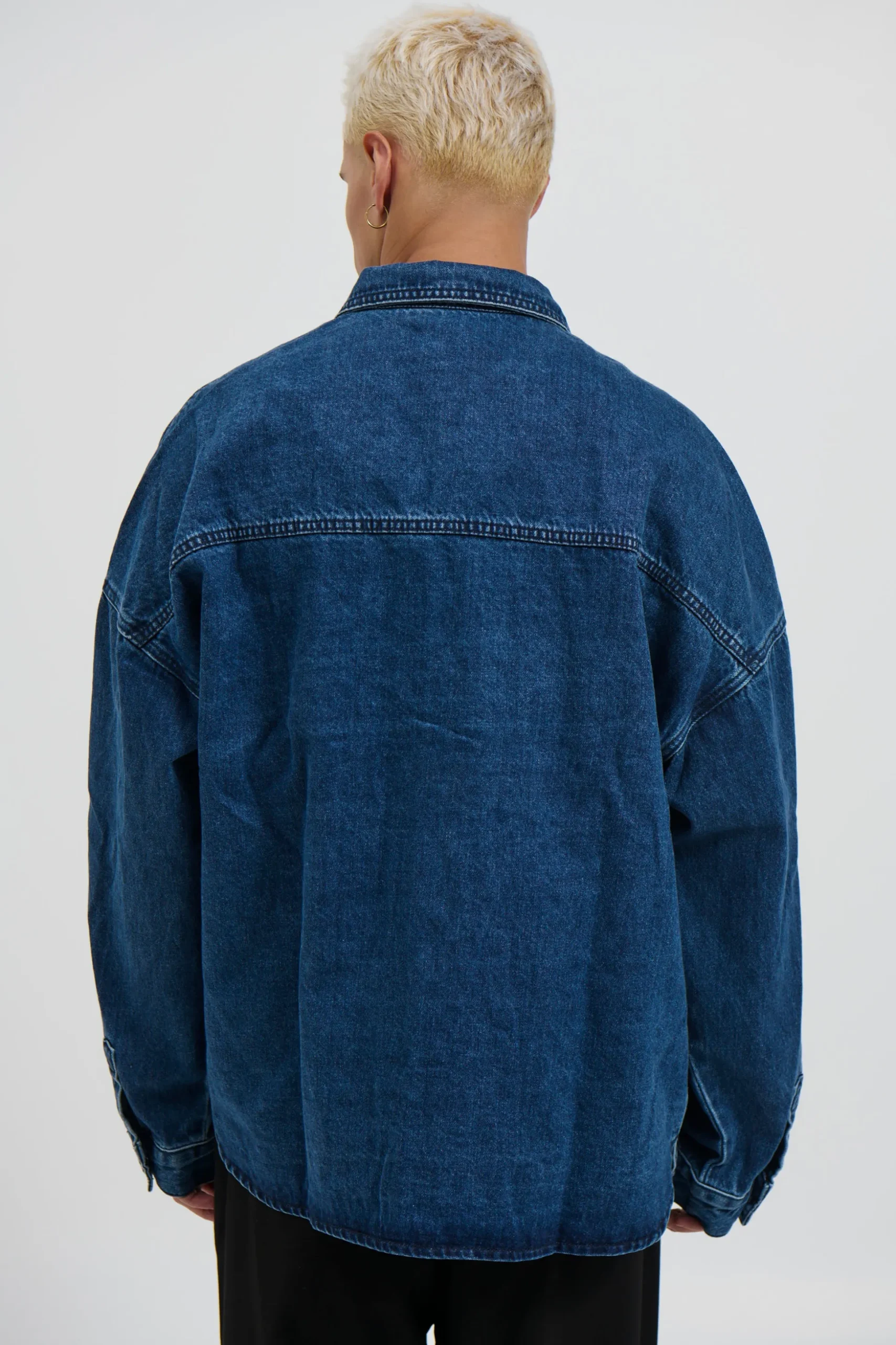 The Drop Shoulder Denim Shirt features a heavyweight design with drop shoulders and a stud press closure on the front. The double pockets at the front add functionality and a boxy fit for a stylish look.