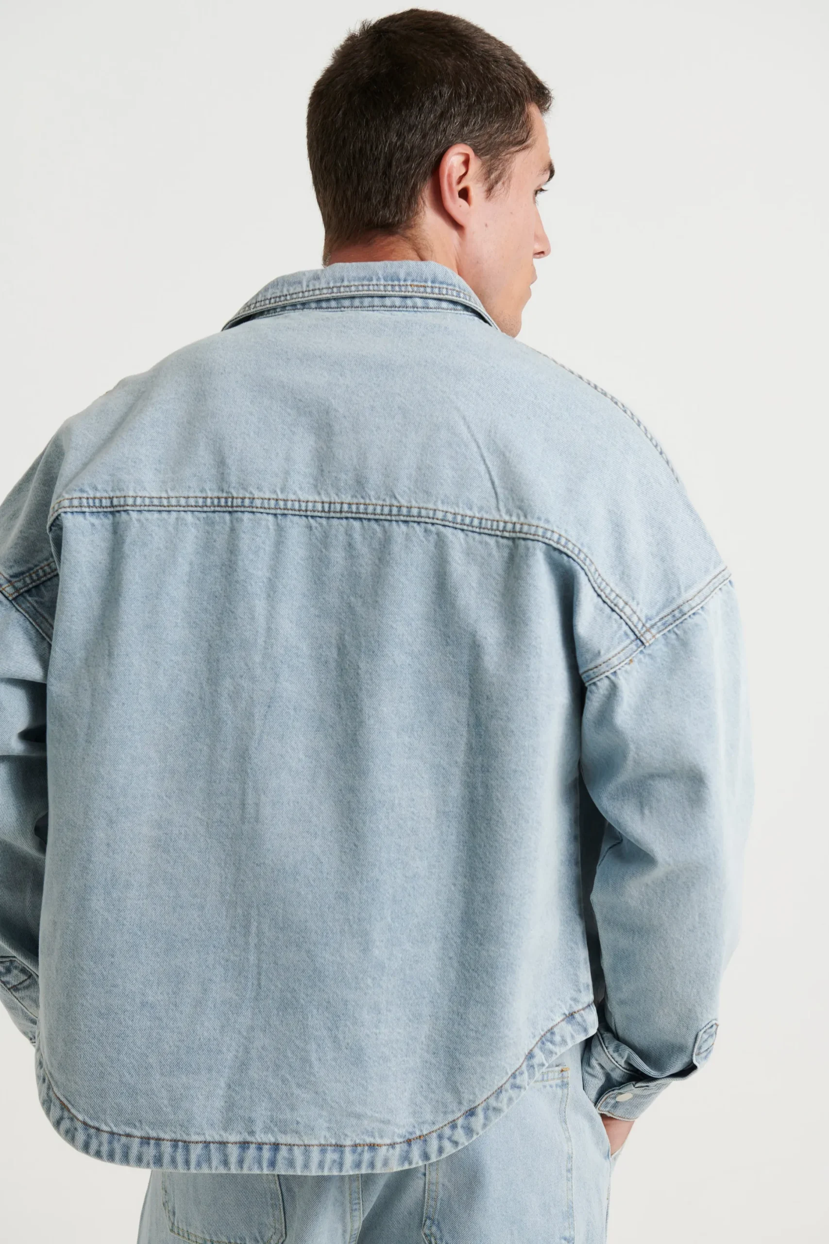 The Drop Shoulder Denim Shirt features a heavyweight design with drop shoulders and a stud press closure on the front. The double pockets at the front add functionality and a boxy fit for a stylish look.