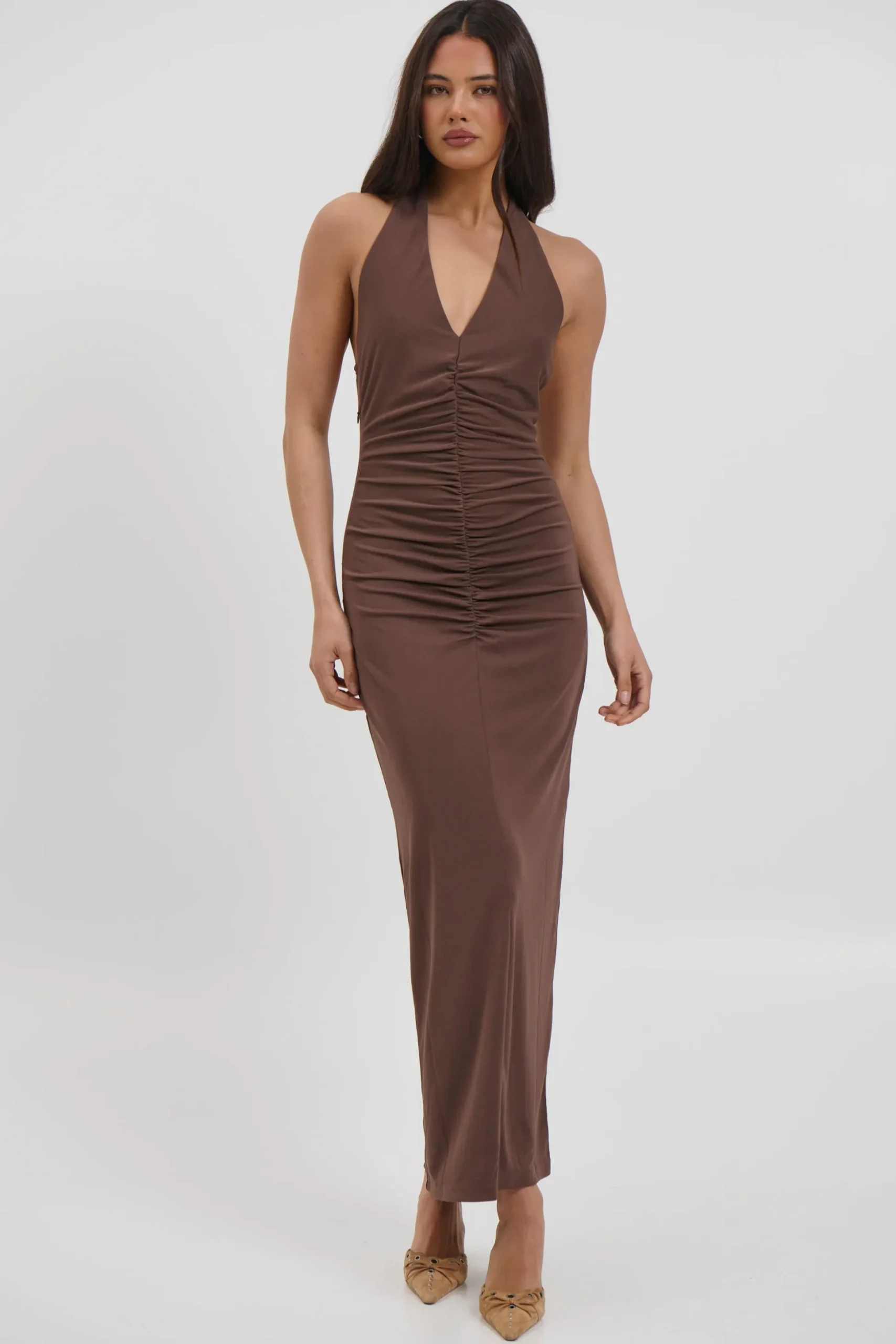 Meet the Ebba Maxi Dress, Featuring a statement silhouette, this women’s dress is designed in a maxi length with a ruched front and back down the centre to flatter and sculpt the figure. The v-scoop neckline flows into a halter tie, adding an elegant yet modern touch.