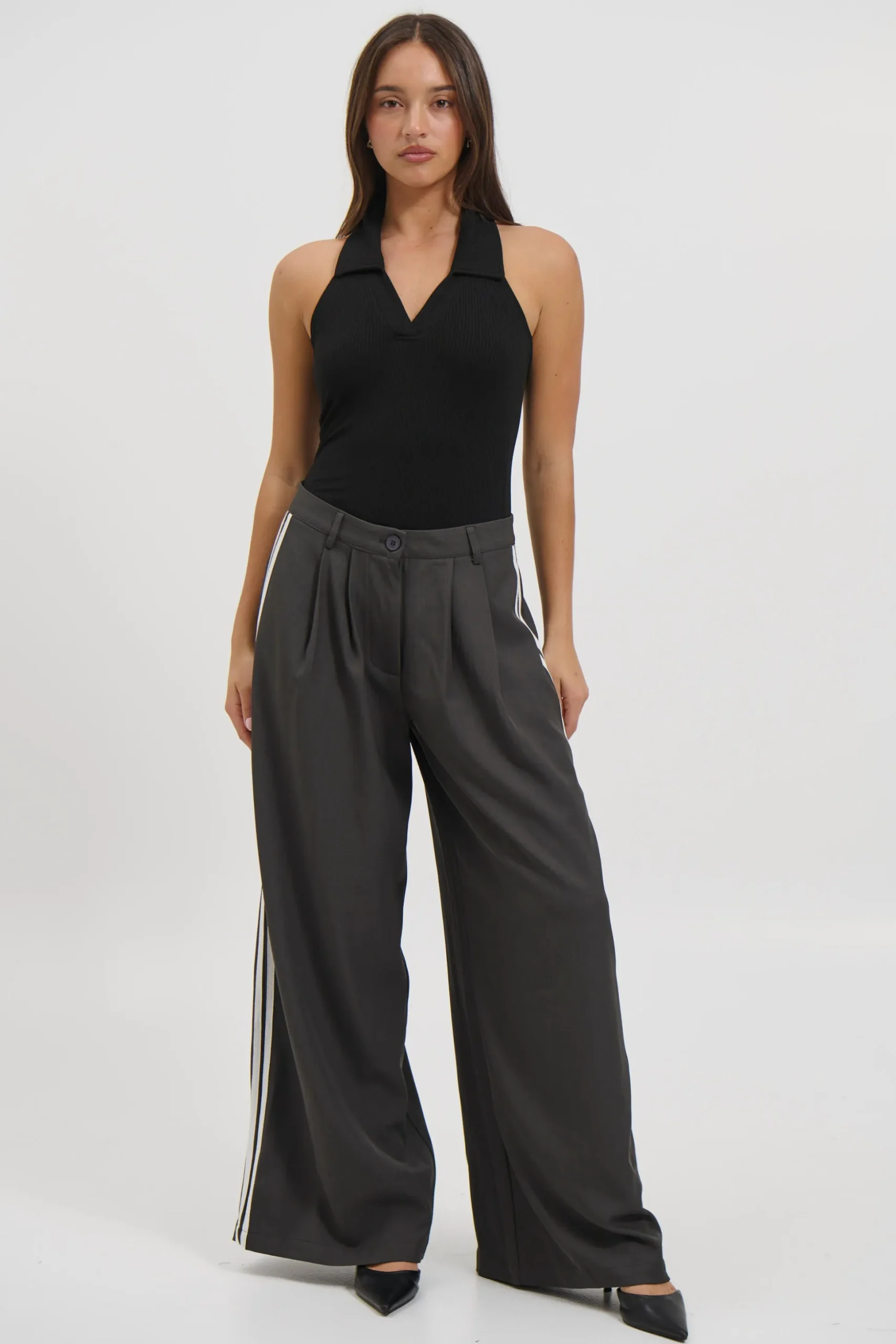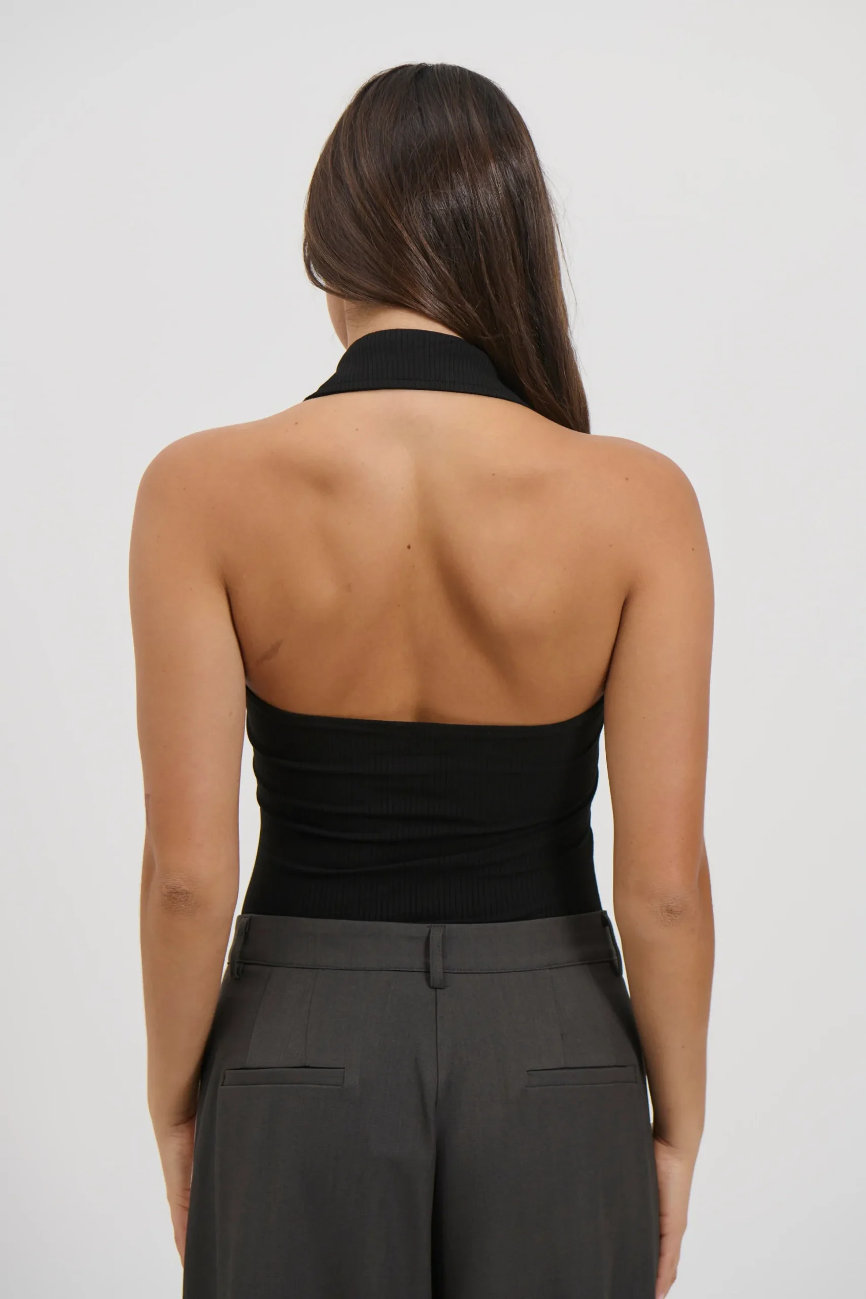 Meet the Elio Bodysuit, Elevate your basics with this bodysuit, crafted from a soft ribbed stretch fabric that hugs in all the right places. Featuring a halter neckline with a structured collar and V-cut front, it adds a sleek and modern touch to any look. Finished with a bikini cut and snap clasp closure for all-day comfort and ease.