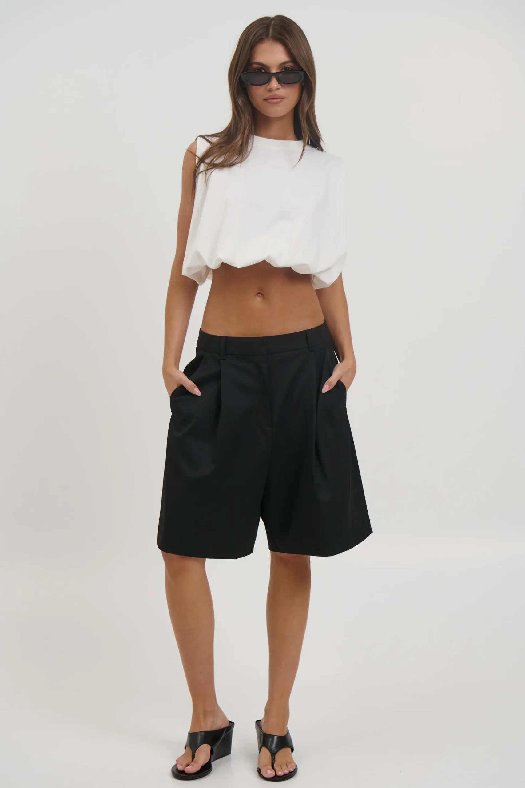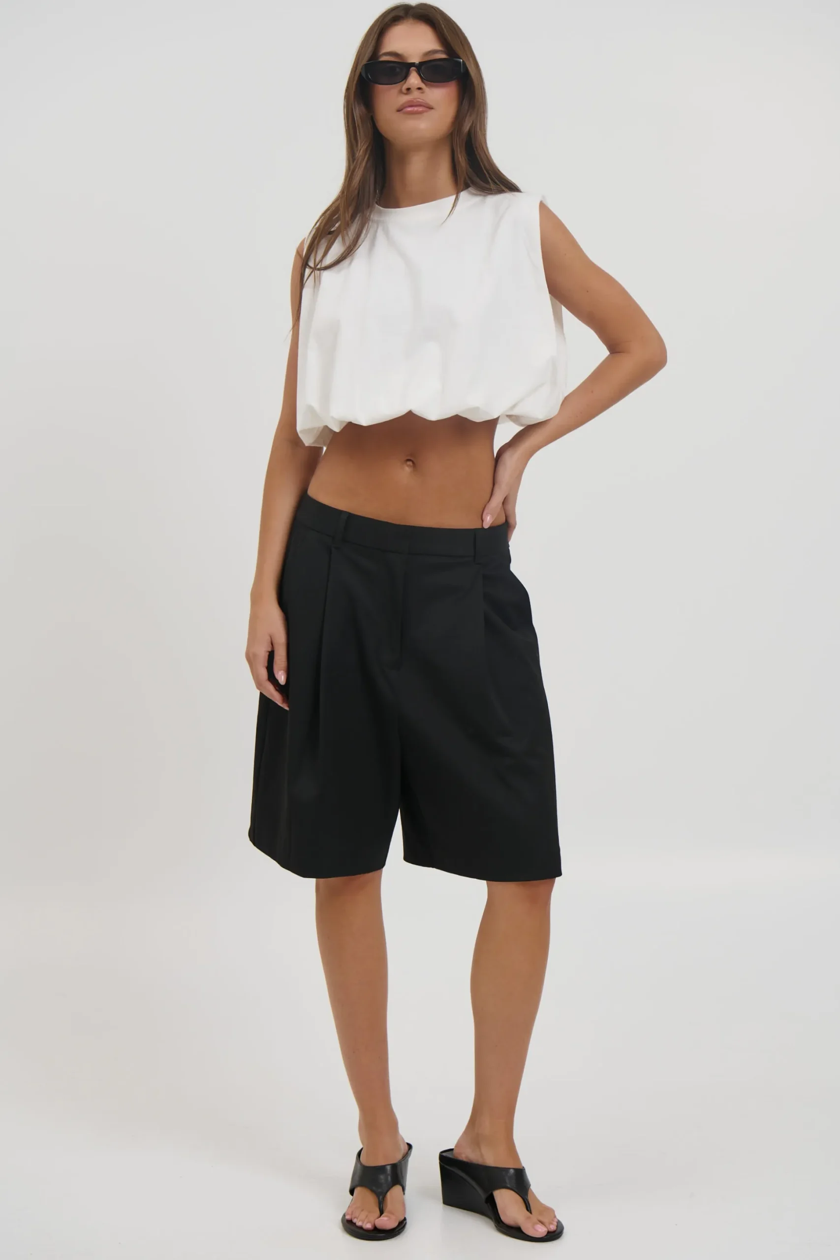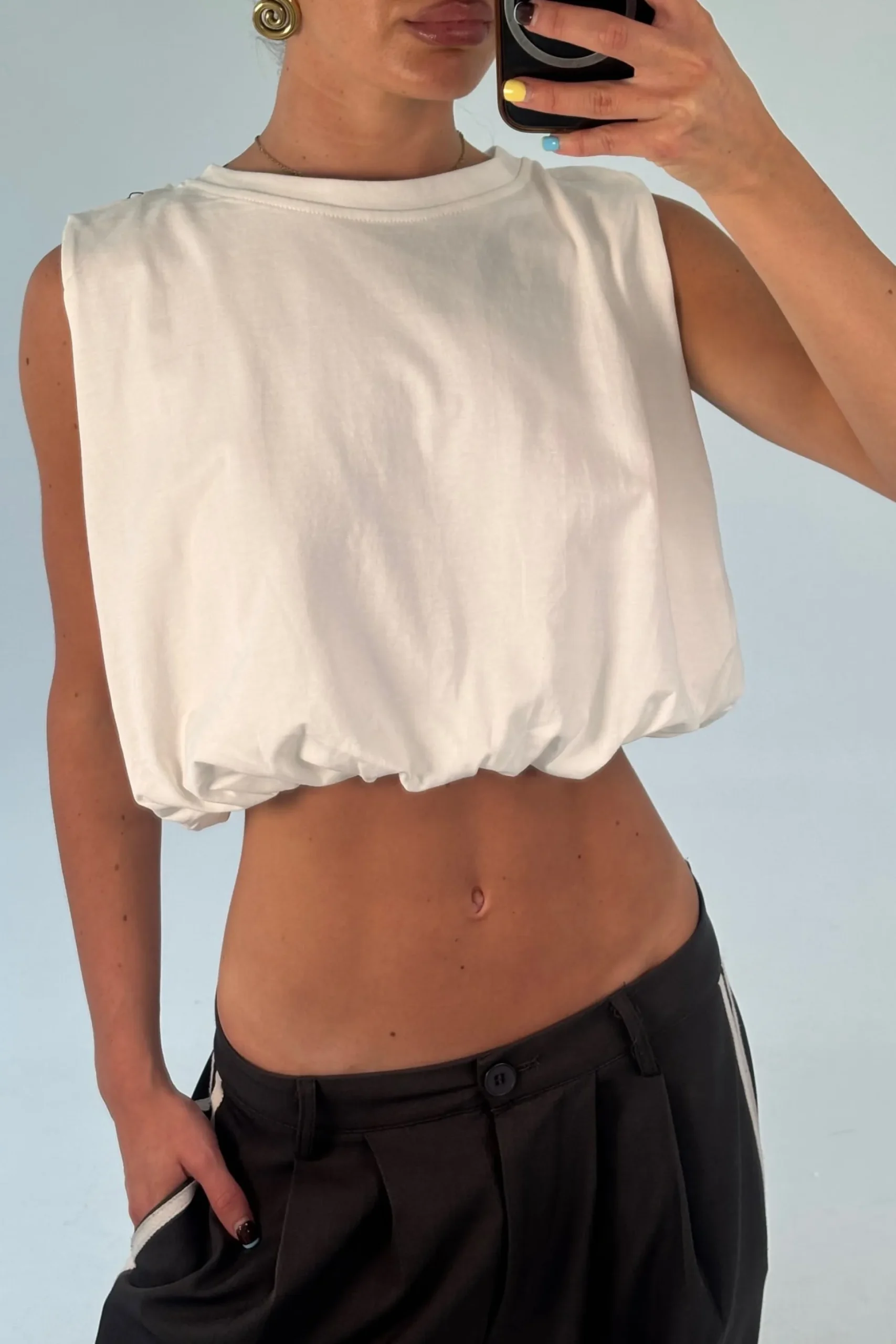 Meet the Emily Bubble Hem Top, featuring a relaxed, boxy silhouette with a gathered elastic hemline for a voluminous shape. Designed with a high crew neckline and wide sleeveless cut for a clean, structured look.