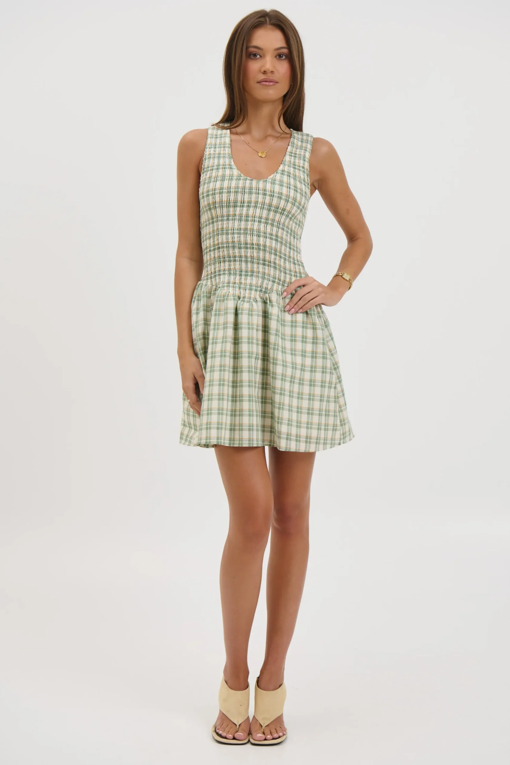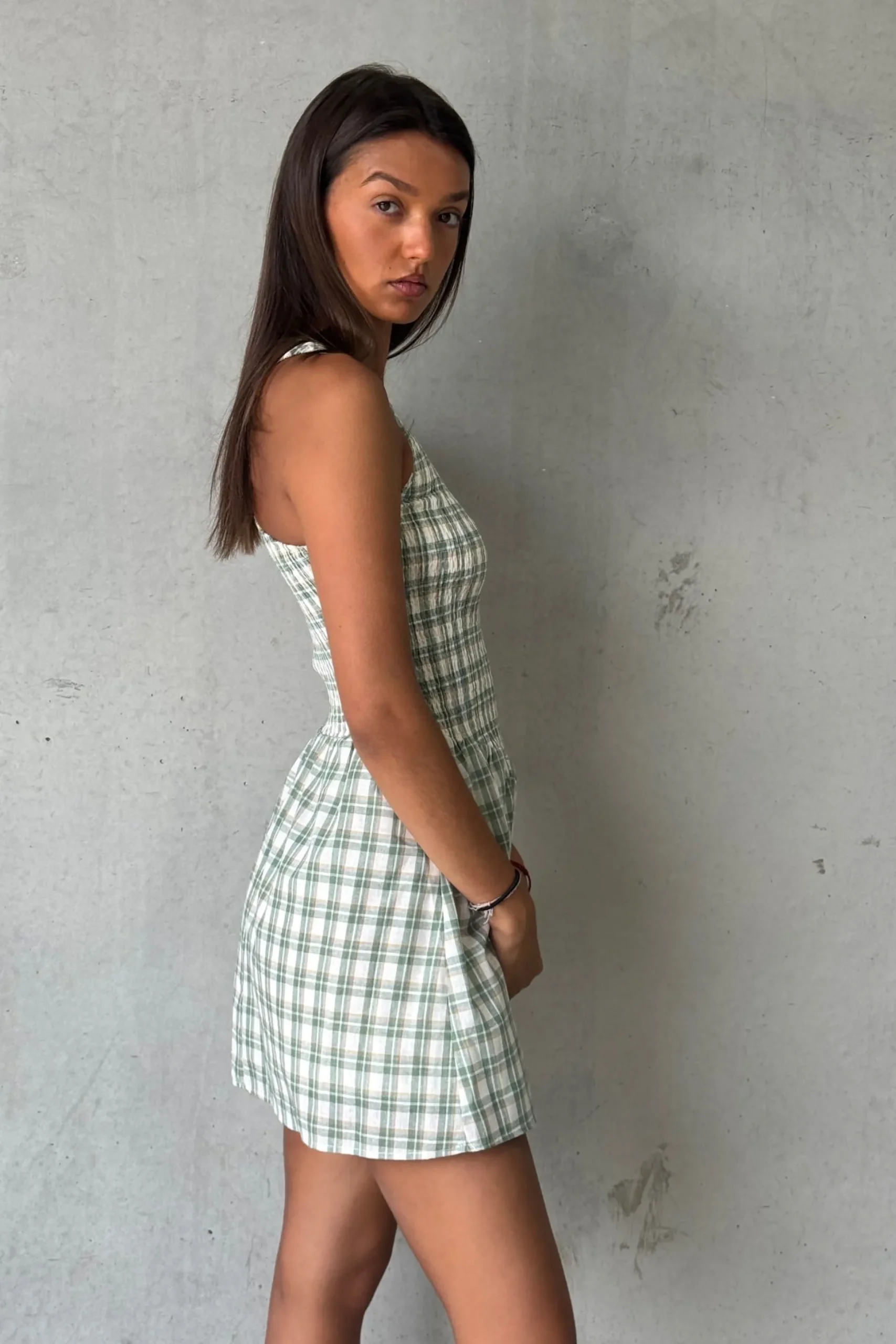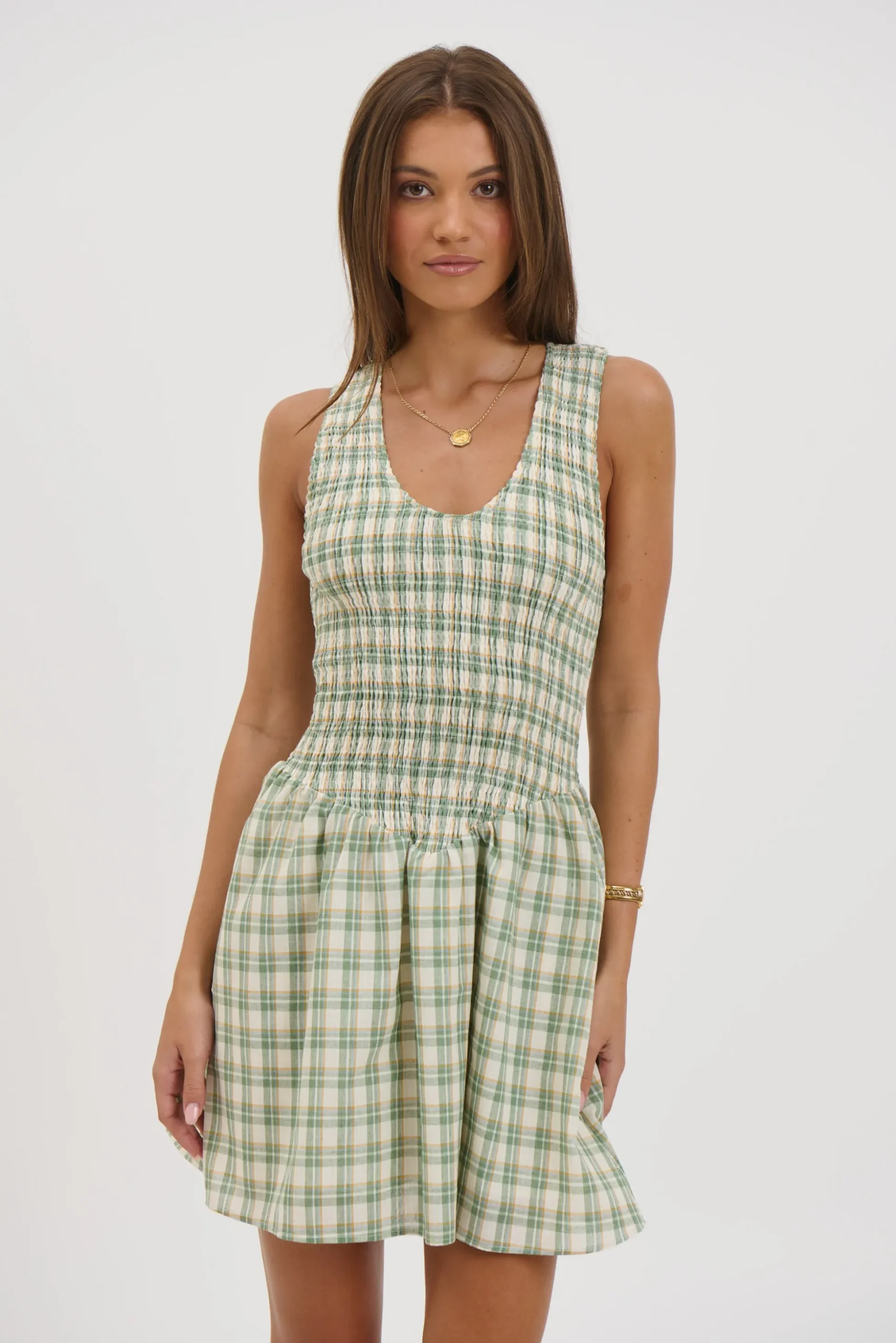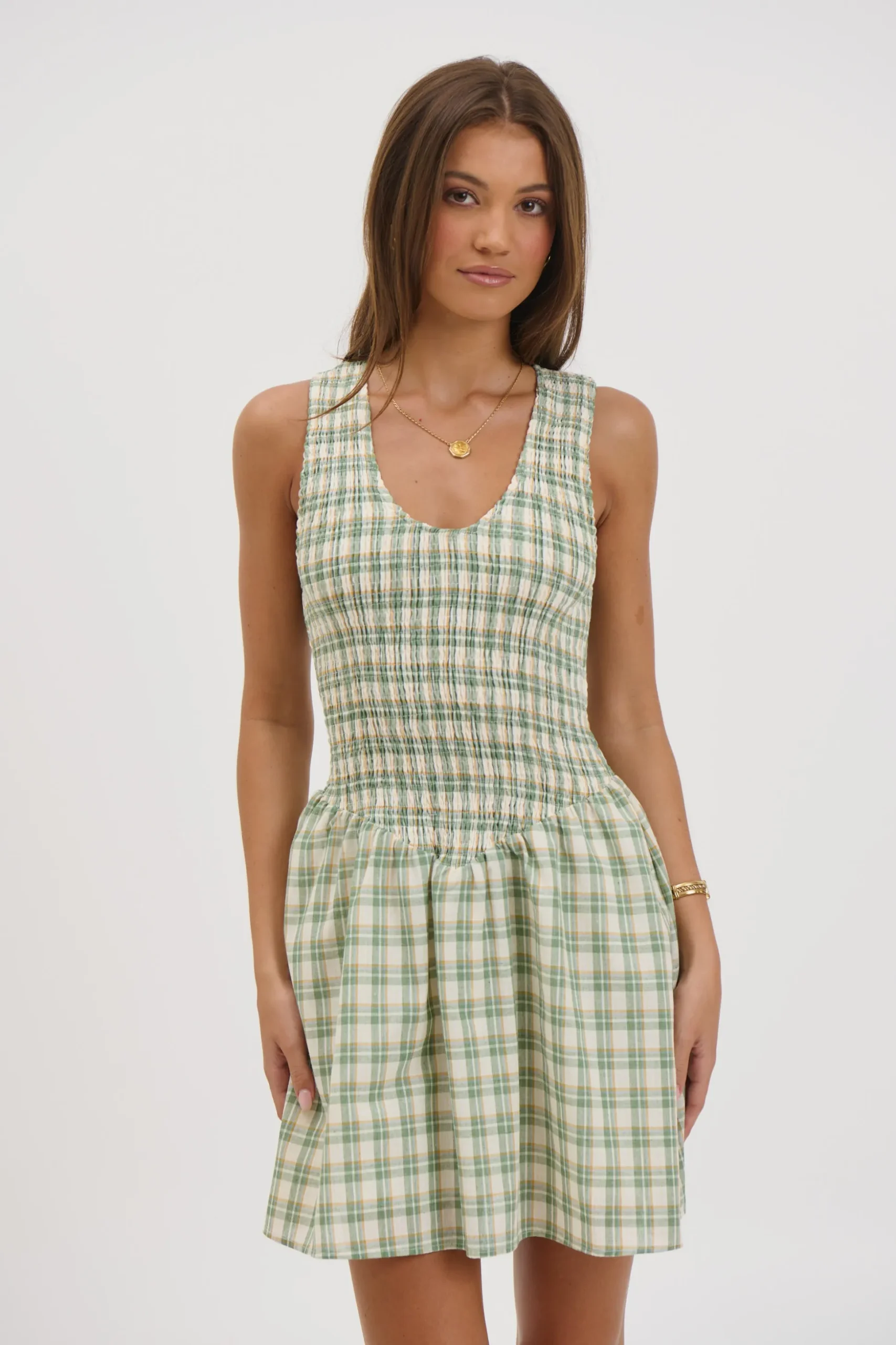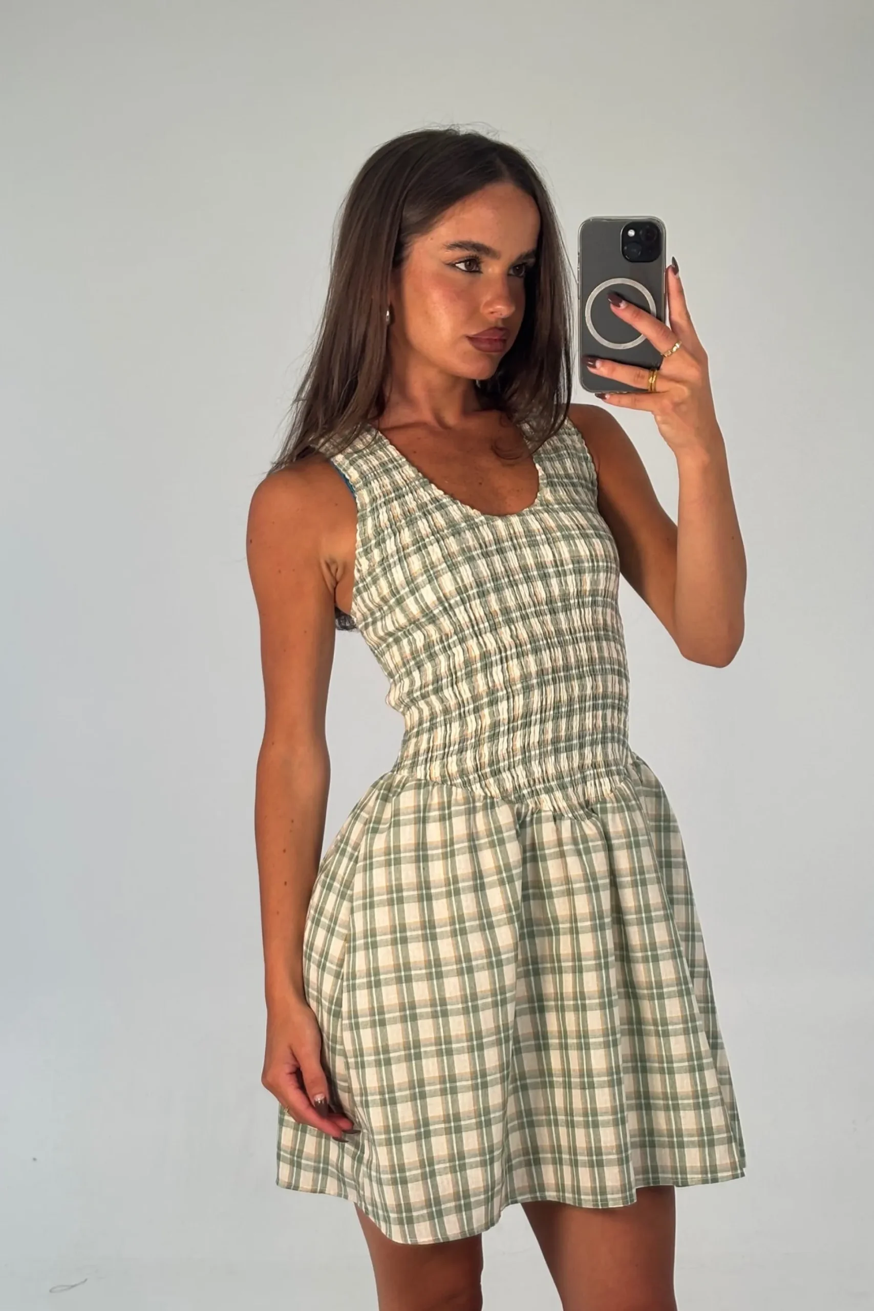 Meet the Essie Mini Dress, Featuring a flattering V-neckline and wide shoulder straps, the bodice is finished with smocked detailing that offers a comfortable, flexible fit while accentuating the waist. The dress flows into a softly gathered skirt, creating a relaxed and airy silhouette. Finished in a classic plaid pattern, this piece is perfect for warm-weather days, casual outings, or layered styling across seasons.