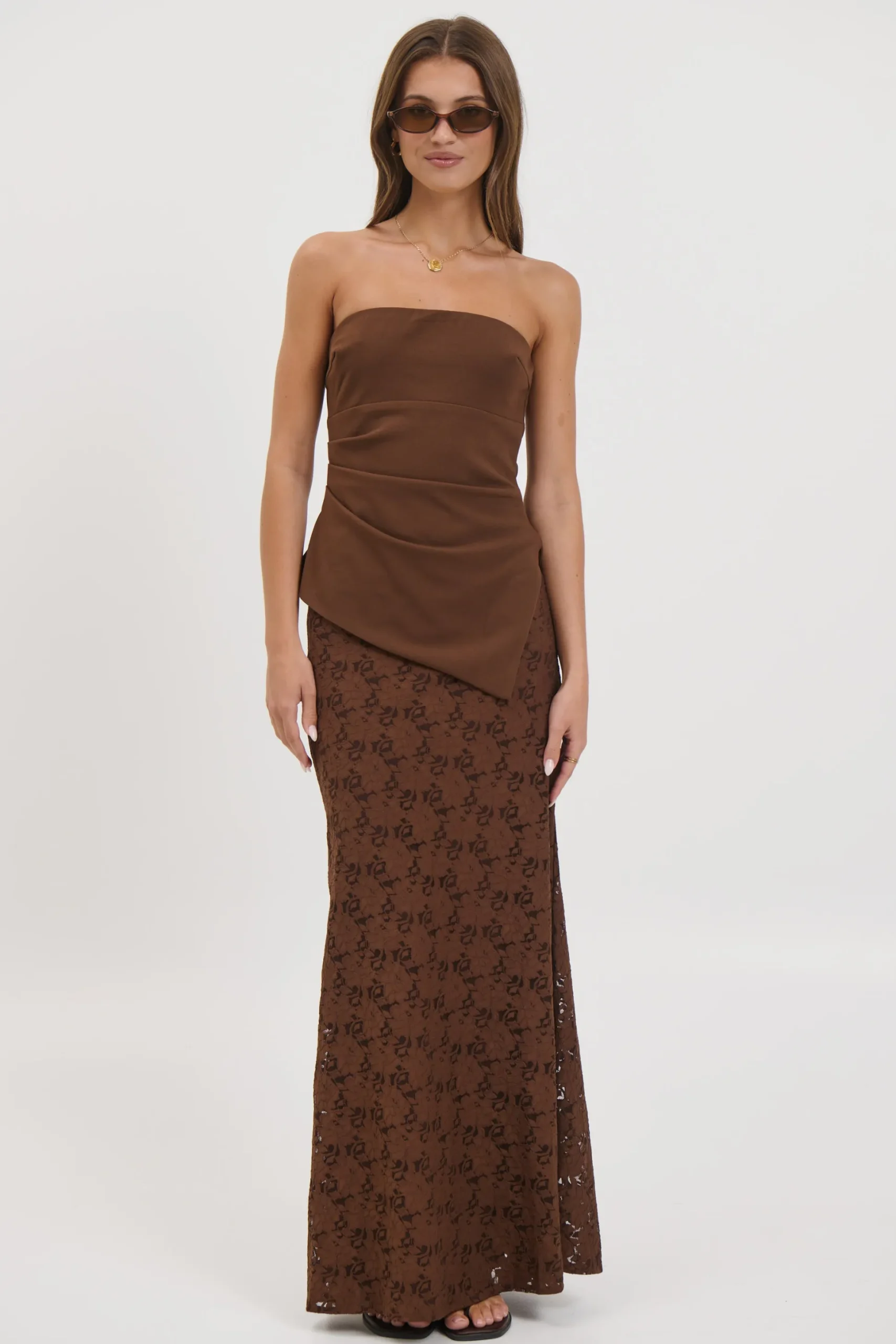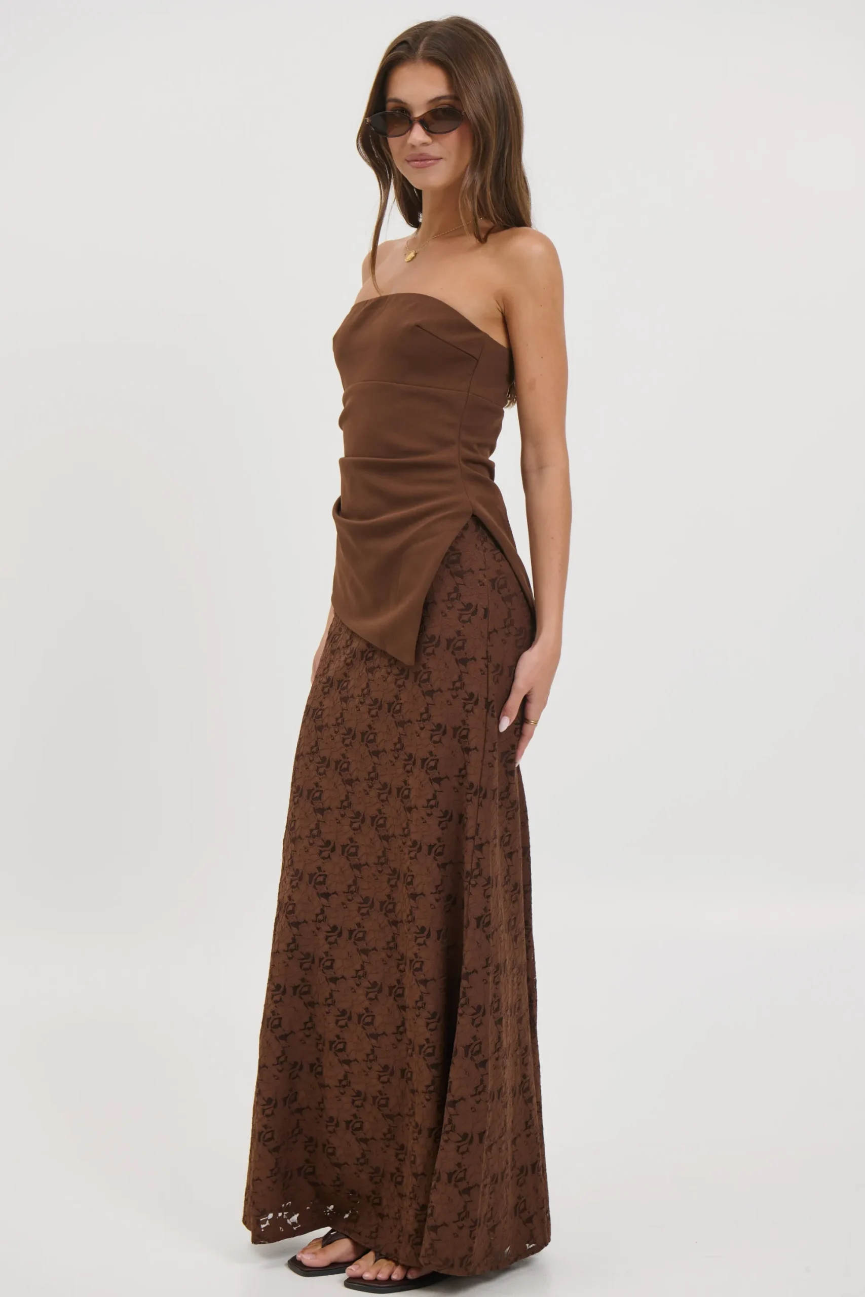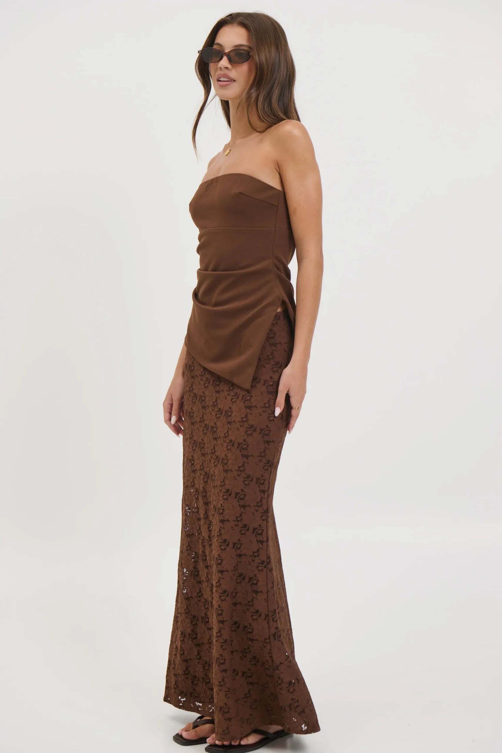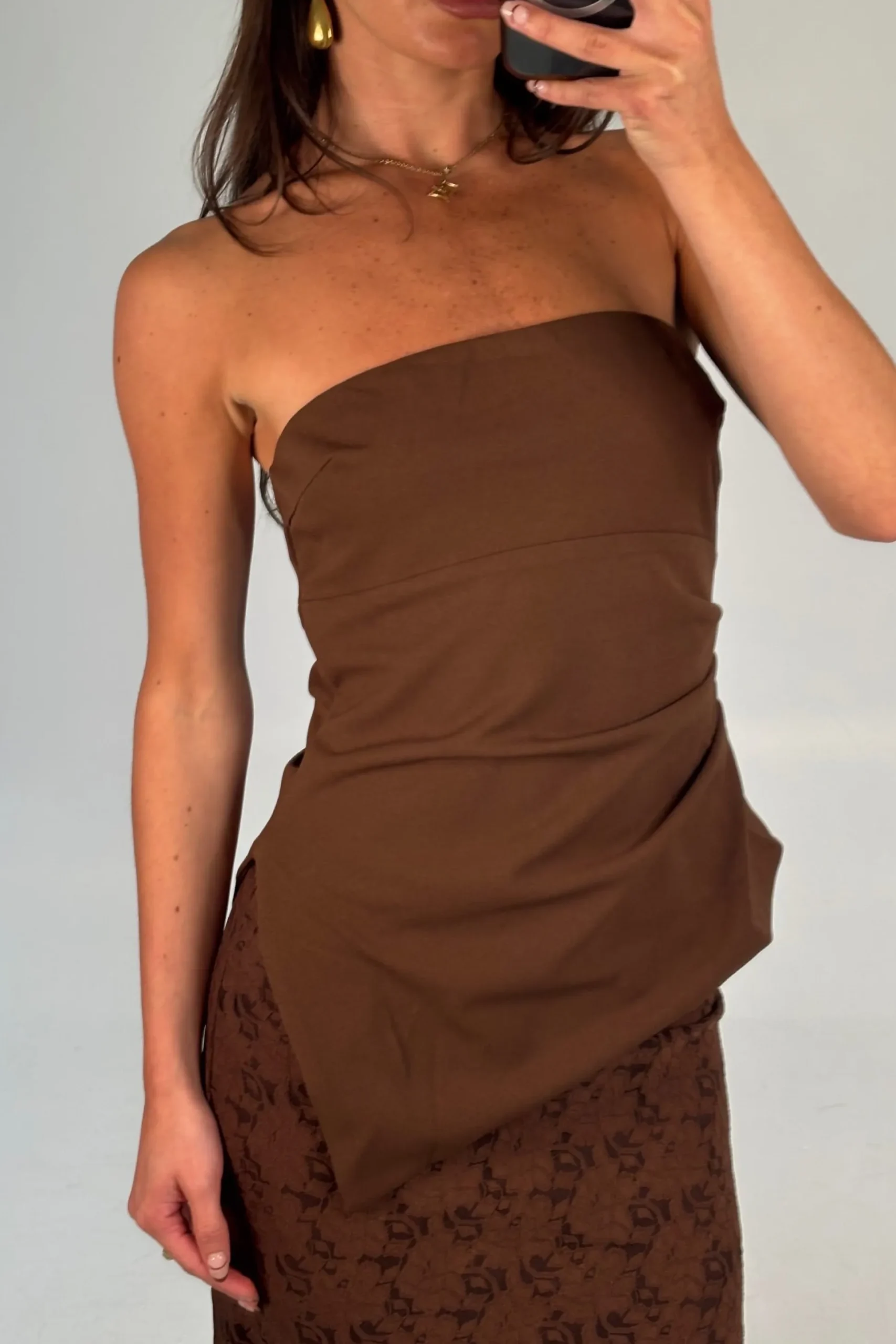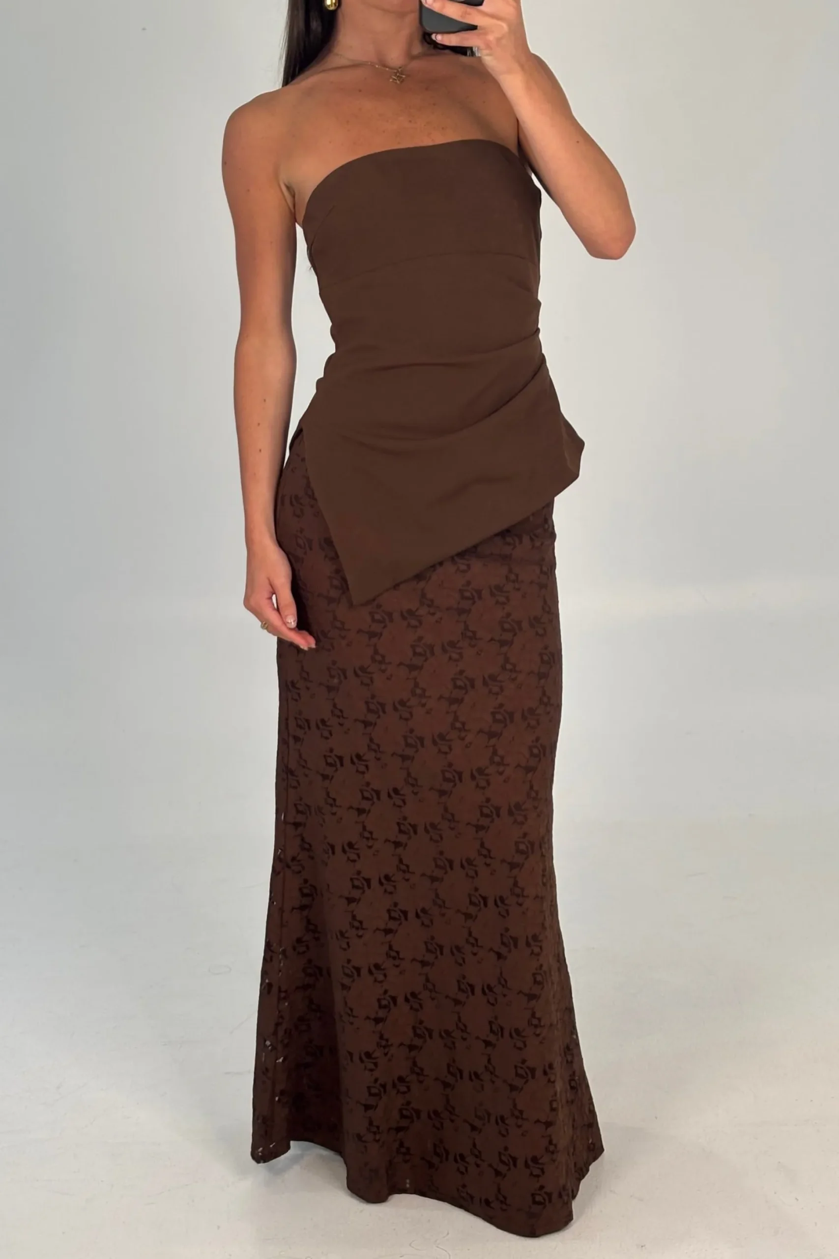 Meet the Harly Set, The skirt features a full lining, side zipper closure, and a soft A-line hem that drapes beautifully. The strapless top adds a modern edge with its asymmetric cut and sleek side zipper, perfectly balancing structure and femininity. Ideal for special occasions or elevated everyday wear.