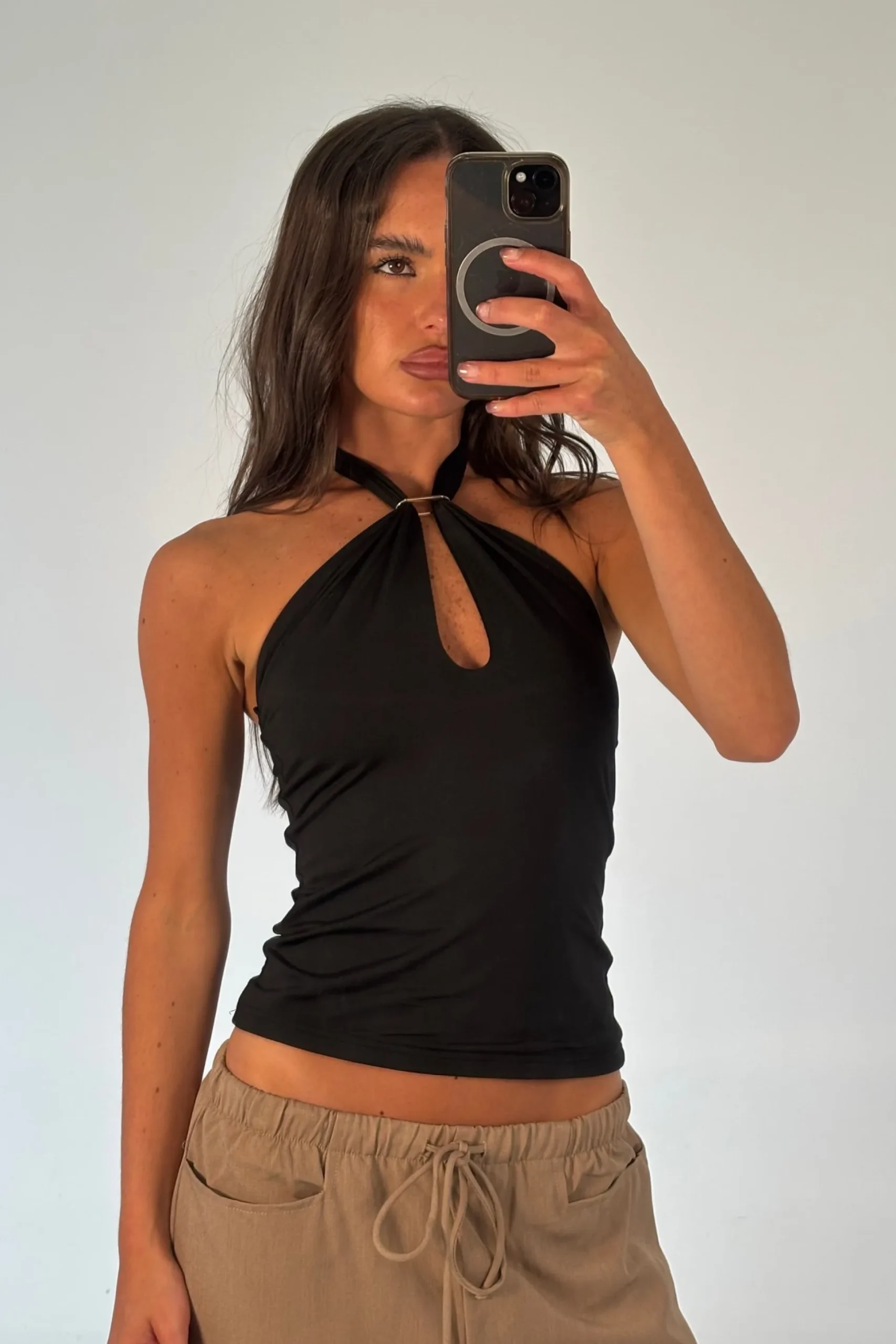 Meet the Janelle Top, Featuring a halter neck tie design, this top is elevated with a gold detail that creates a chic keyhole cut-out at the front. Crafted from a tight, stretchy material, it offers a flattering, body-hugging fit that’s perfect for both casual and dressy styling.