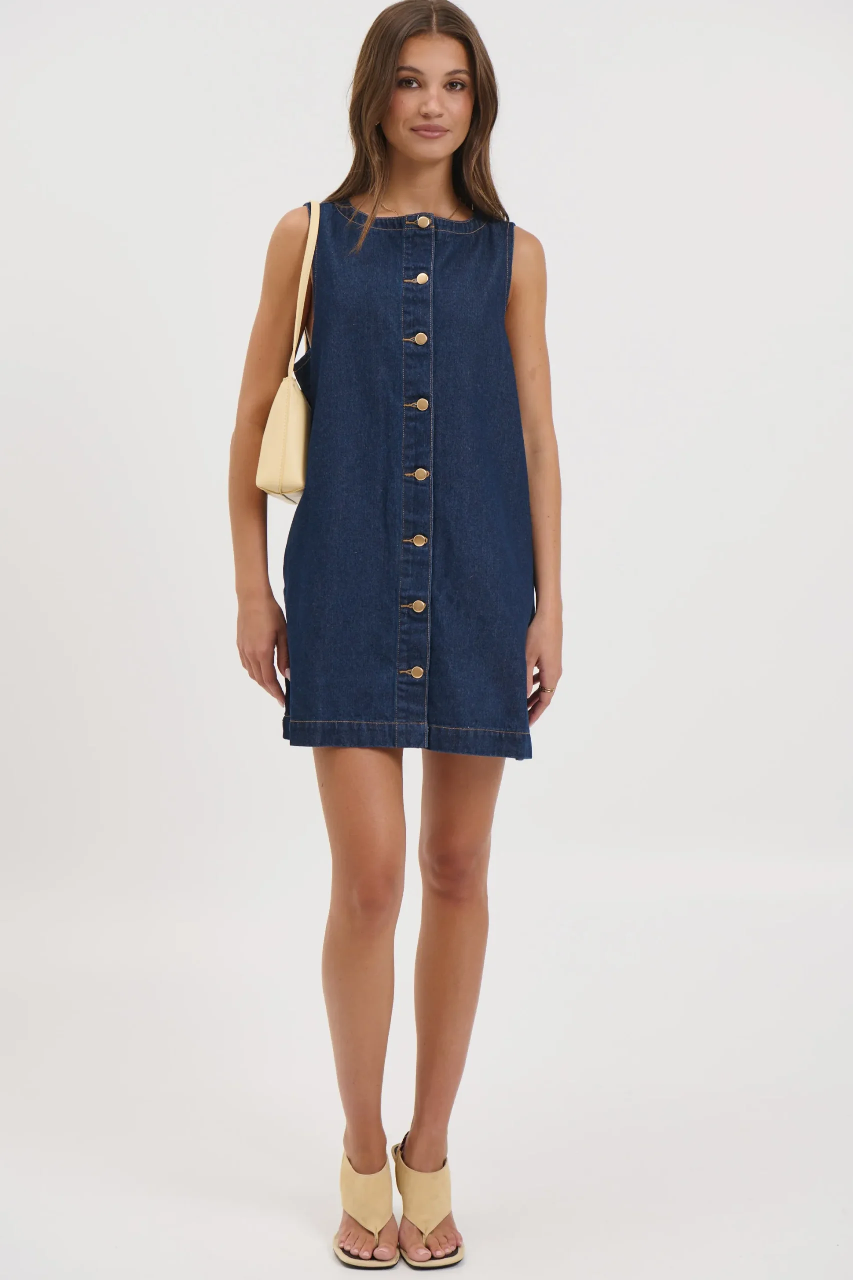 Meet the Jaymes Denim Dress, featuring a high scoop neckline and a sleeveless silhouette. Designed in a mini length, it includes functional side pockets and a full front button closure for a classic, easy-wear look.