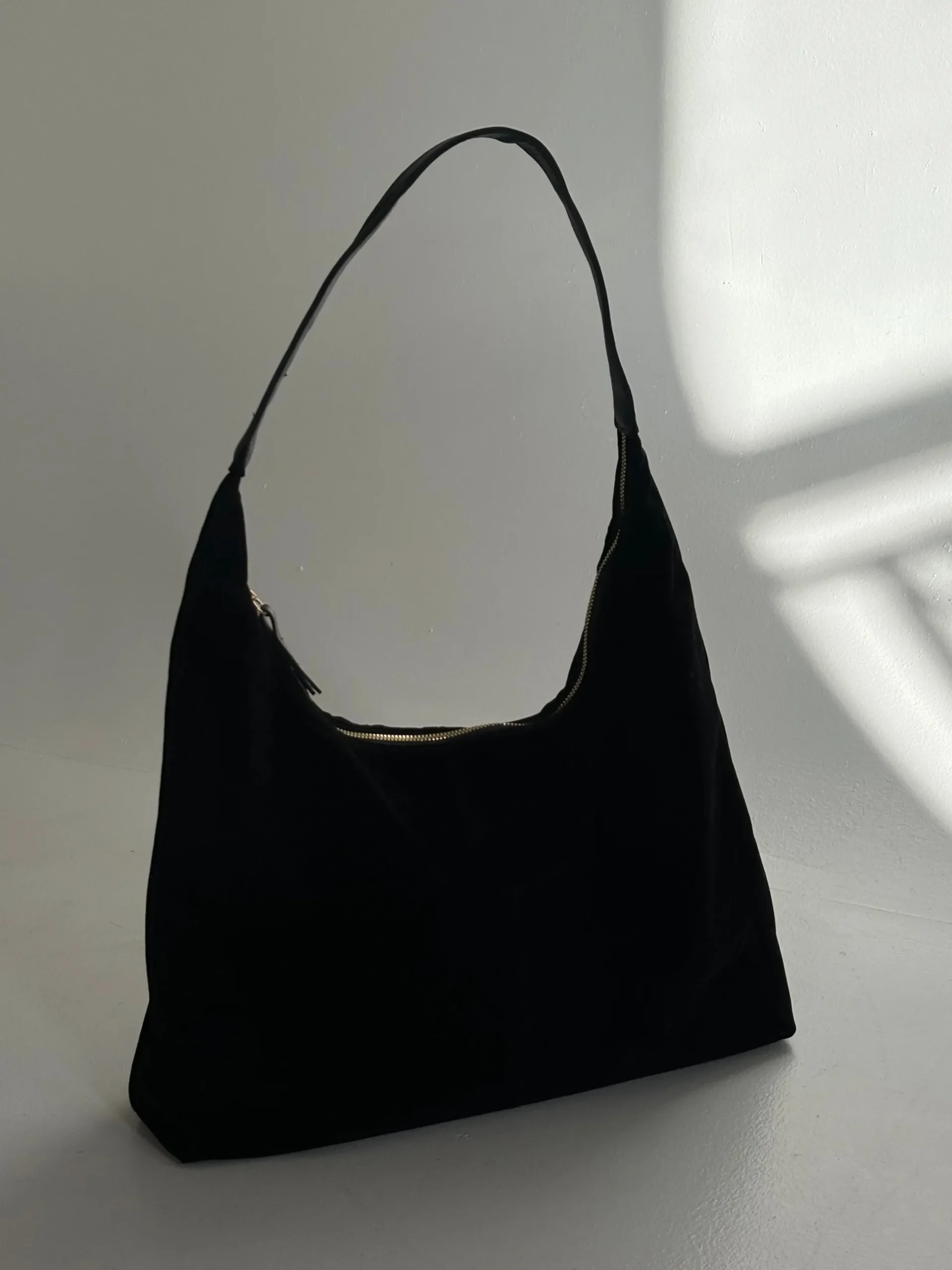 This bag features a faux suede material and a slouchy design, complete with a convenient shoulder strap for a boho-inspired look.