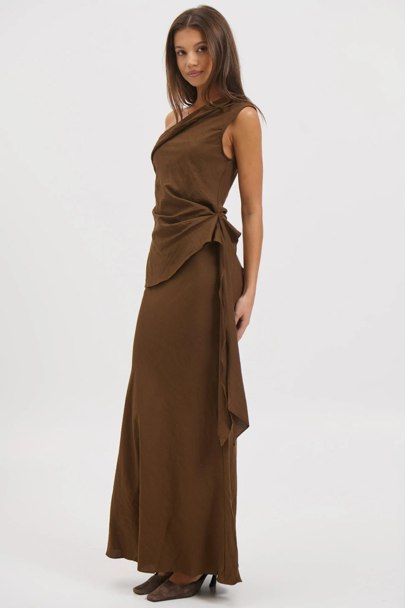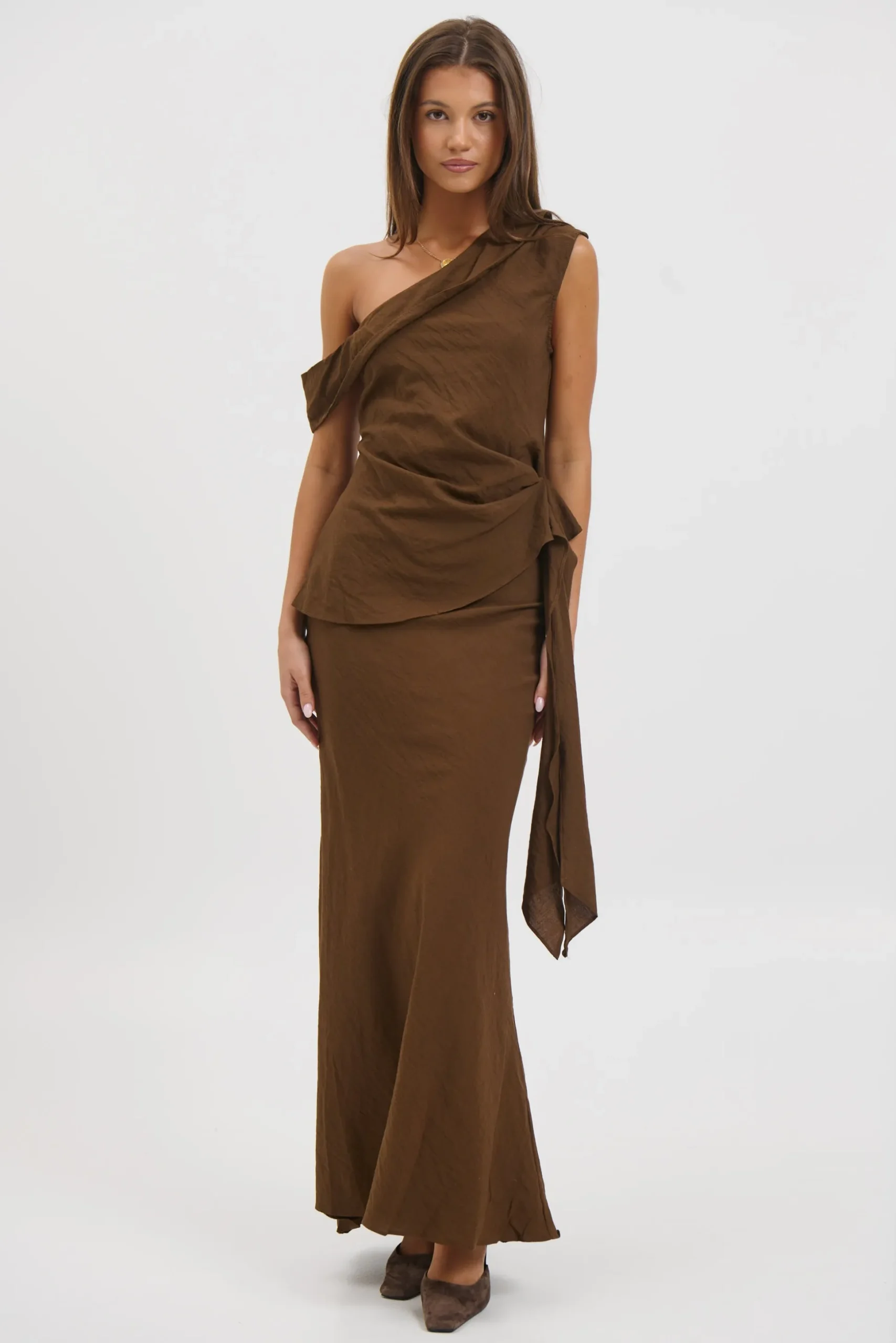 Meet the Kallie Set, Featuring a maxi skirt that flows effortlessly with a side zipper closure for a sleek finish, fully lined for comfort and coverage. Paired with an asymmetric top that showcases a modern silhouette, left unlined for a lightweight feel, and finished with excess draped fabric for added dimension and movement.