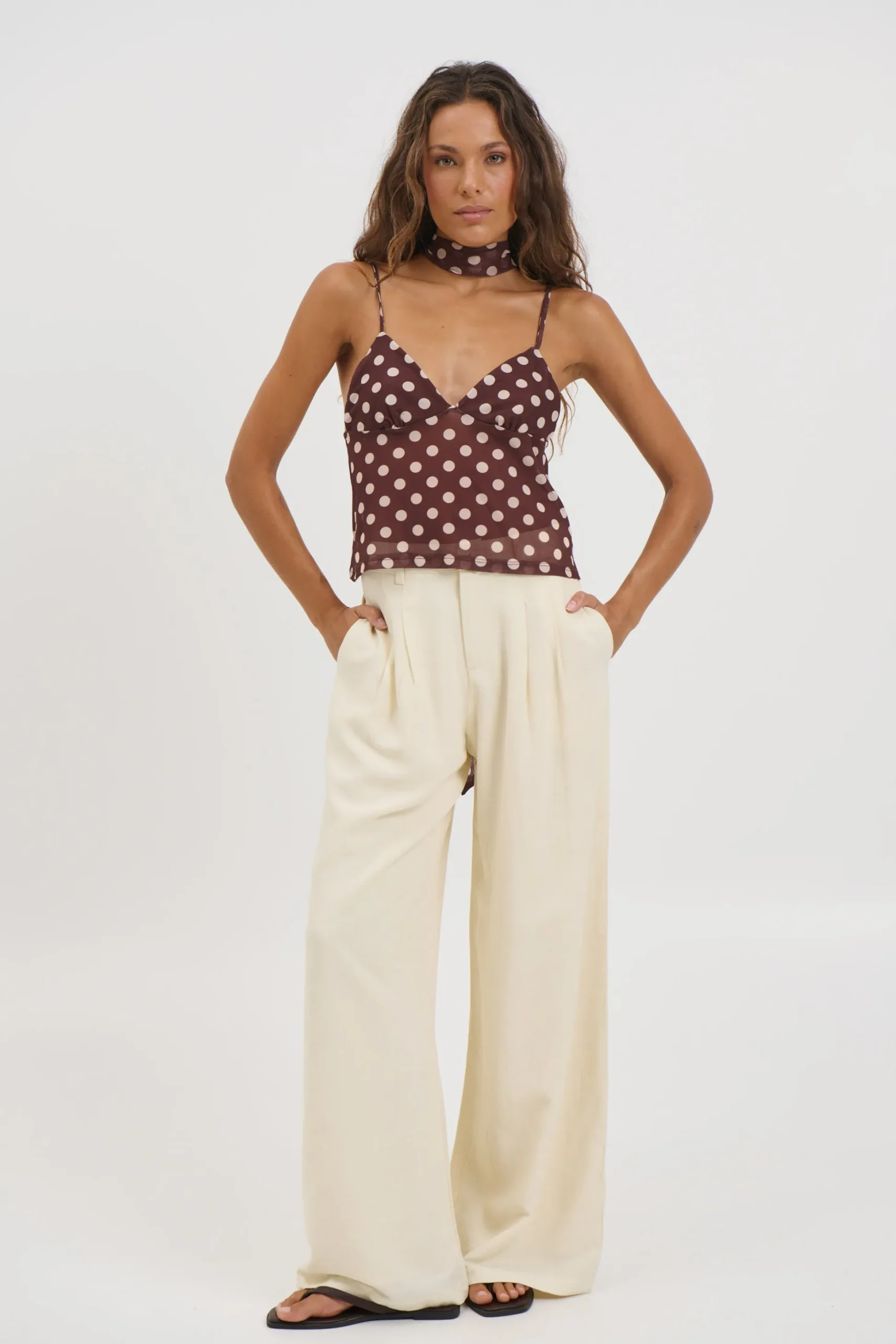 Meet the Kasia Polka Dot Top, Featuring a breezy, playful design, this crop top combines a relaxed, flowy fit with sheer mesh for an effortlessly chic look. The triangle bust is fully lined for comfort and coverage, while the delicate polka dot pattern adds a touch of whimsy, complete with a coordinating scarf.