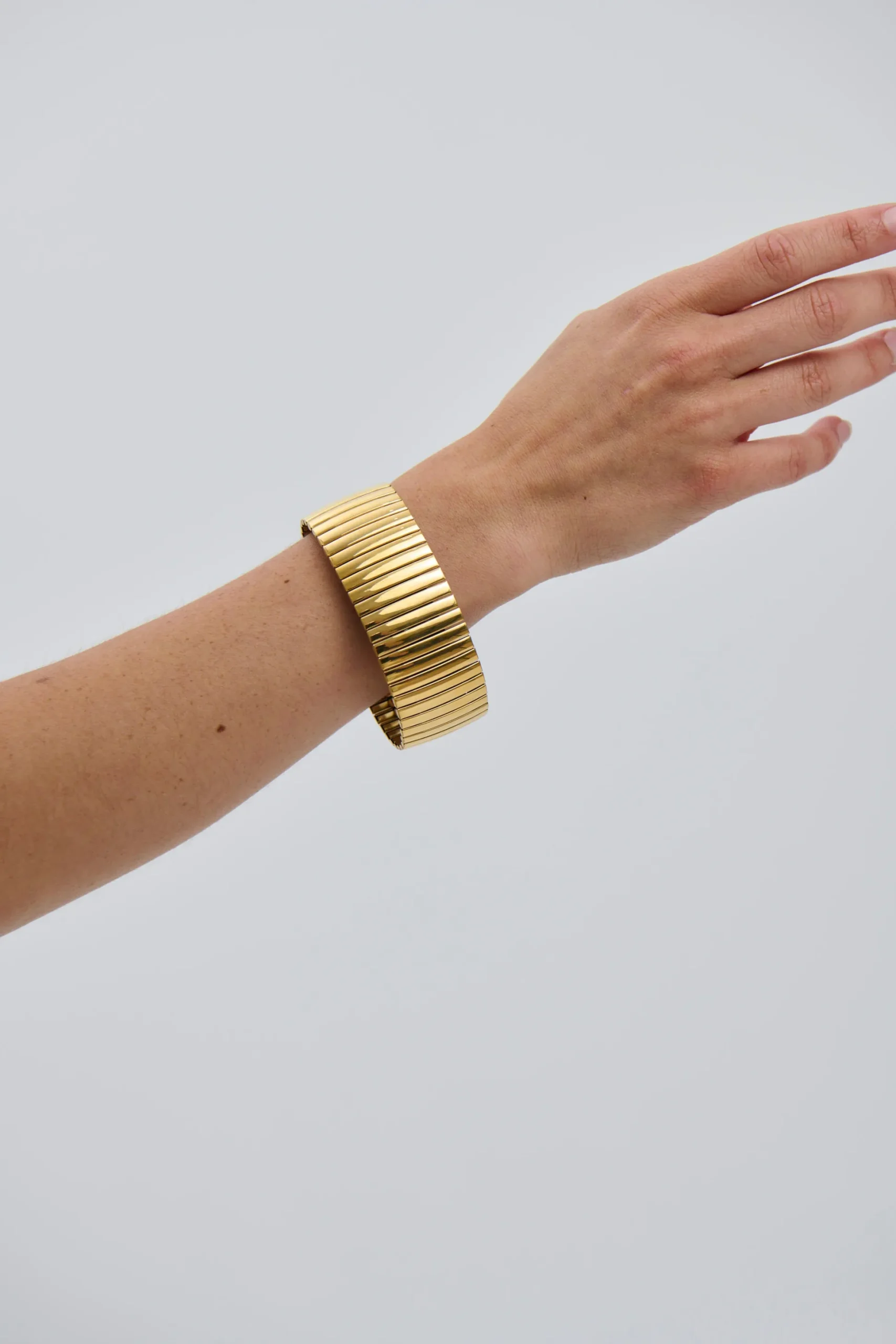 Meet Katrina Bracelet, This thick 18k Gold-plated bracelet featuring a flexible, ribbed design for a bold yet comfortable fit. Modern and striking, perfect for making a statement.