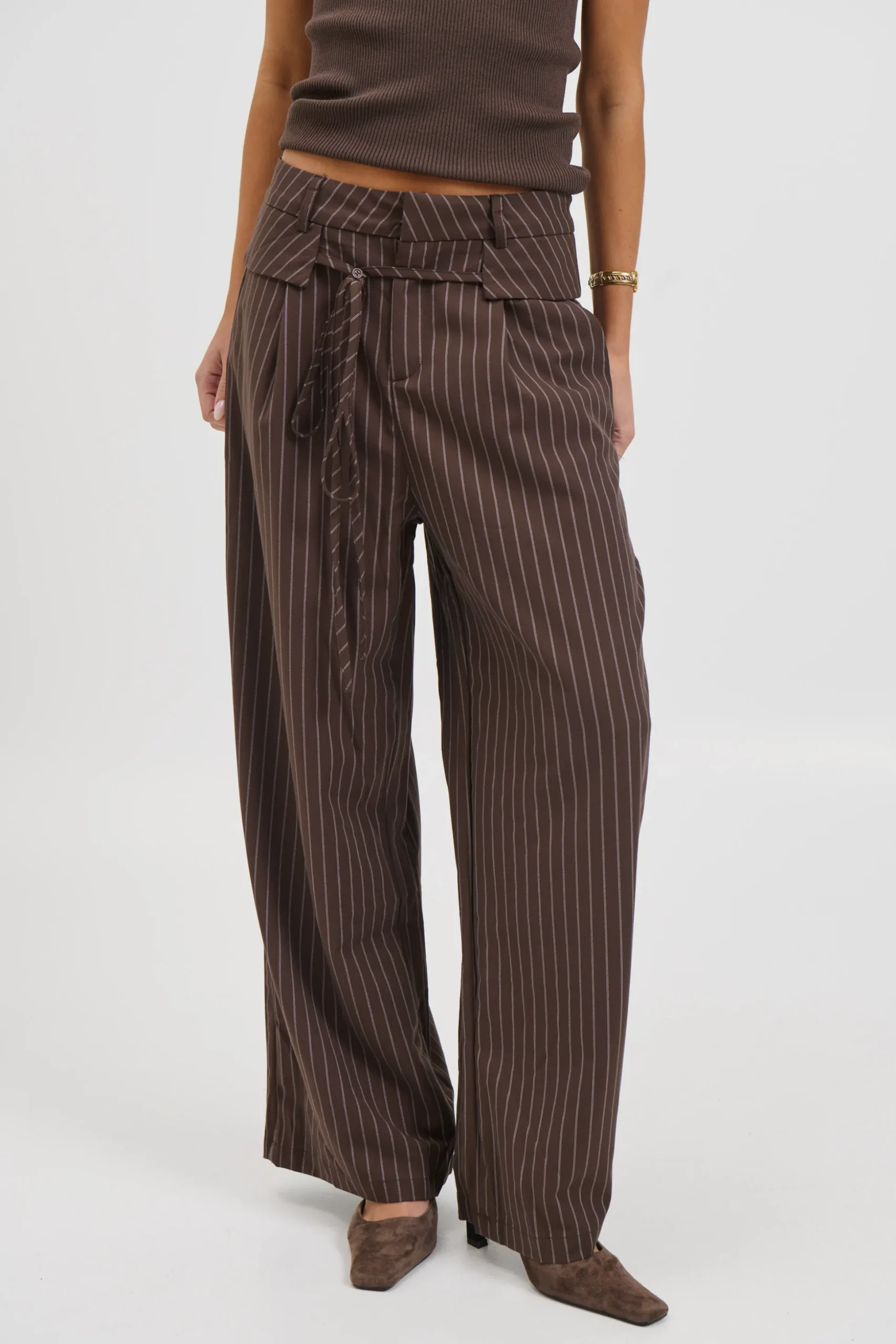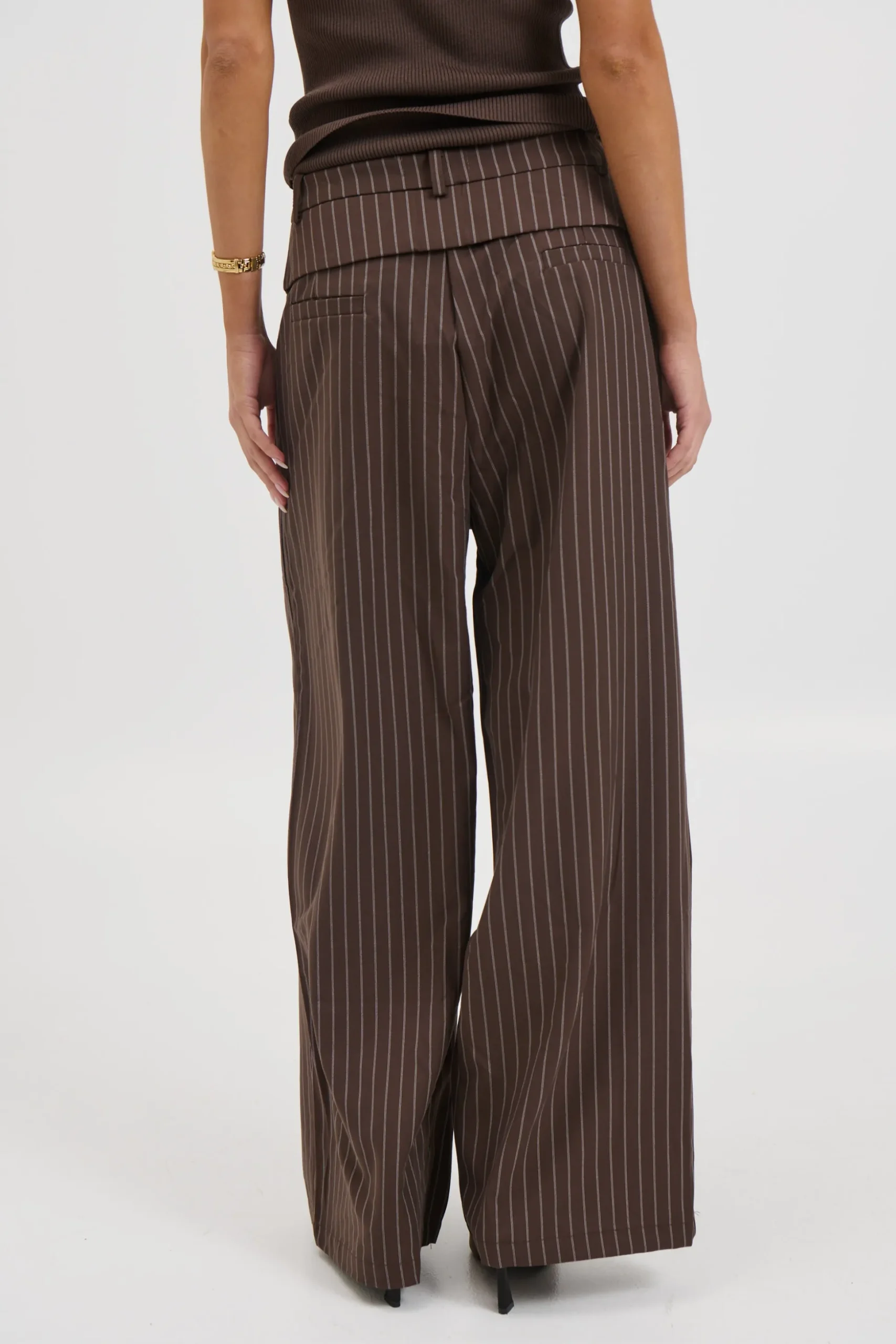 Meet the Klara Pinstripe Pants. Make a statement in these pinstripe pants, featuring a relaxed flared leg that brings effortless sophistication to your look. Designed with a secure zipper and clasp closure, they’re finished with a unique waistband collar detailing that adds a tailored, fashion-forward twist. Perfect for elevating both office and off-duty outfits.