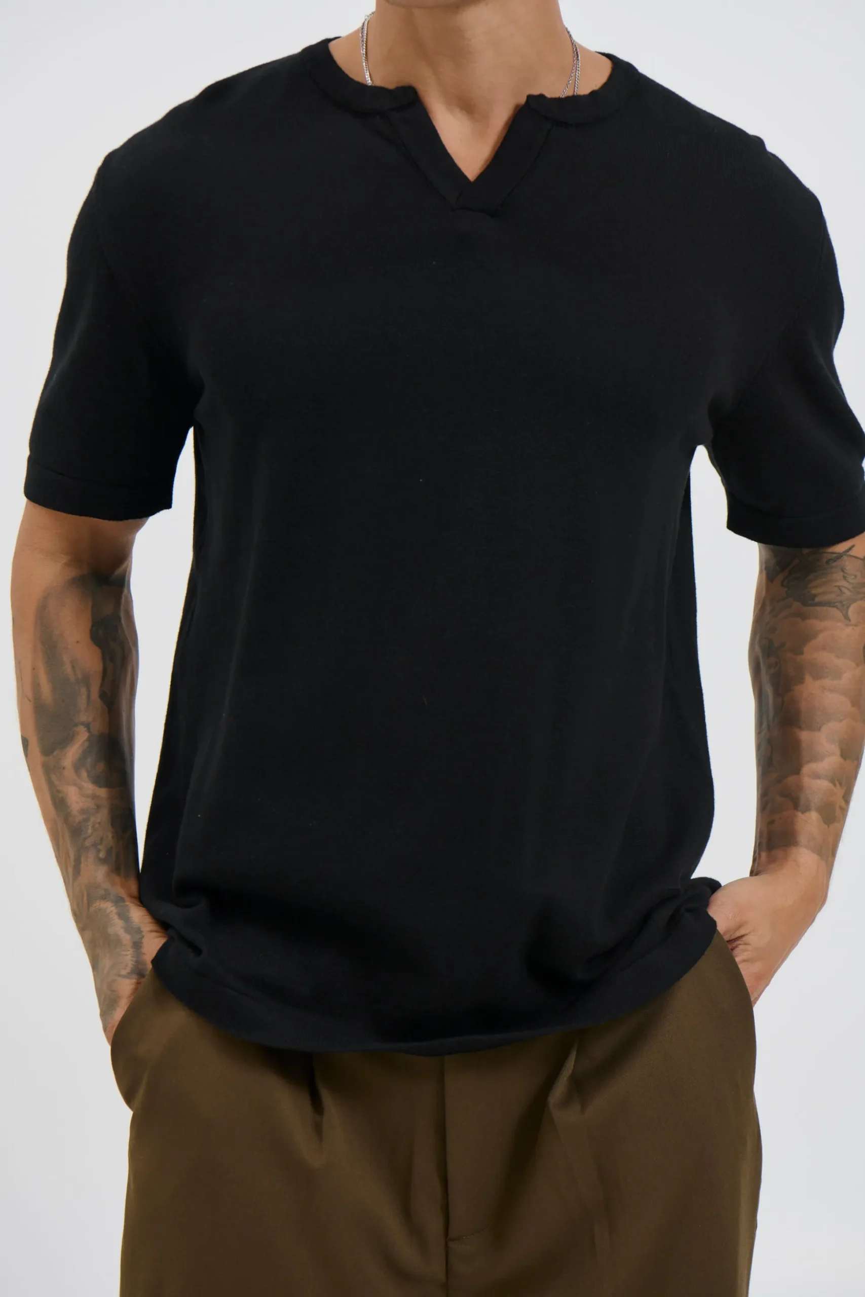 The Knitted Split Neck Tee, Crafted from 100% cotton in a soft knit finish, this men’s tee delivers a clean, fitted silhouette with a comfortable stretch. The split neckline adds a subtle edge, offering a refined take on a casual essential. Lightweight, breathable, and effortlessly versatile—this tee is made to move with you.