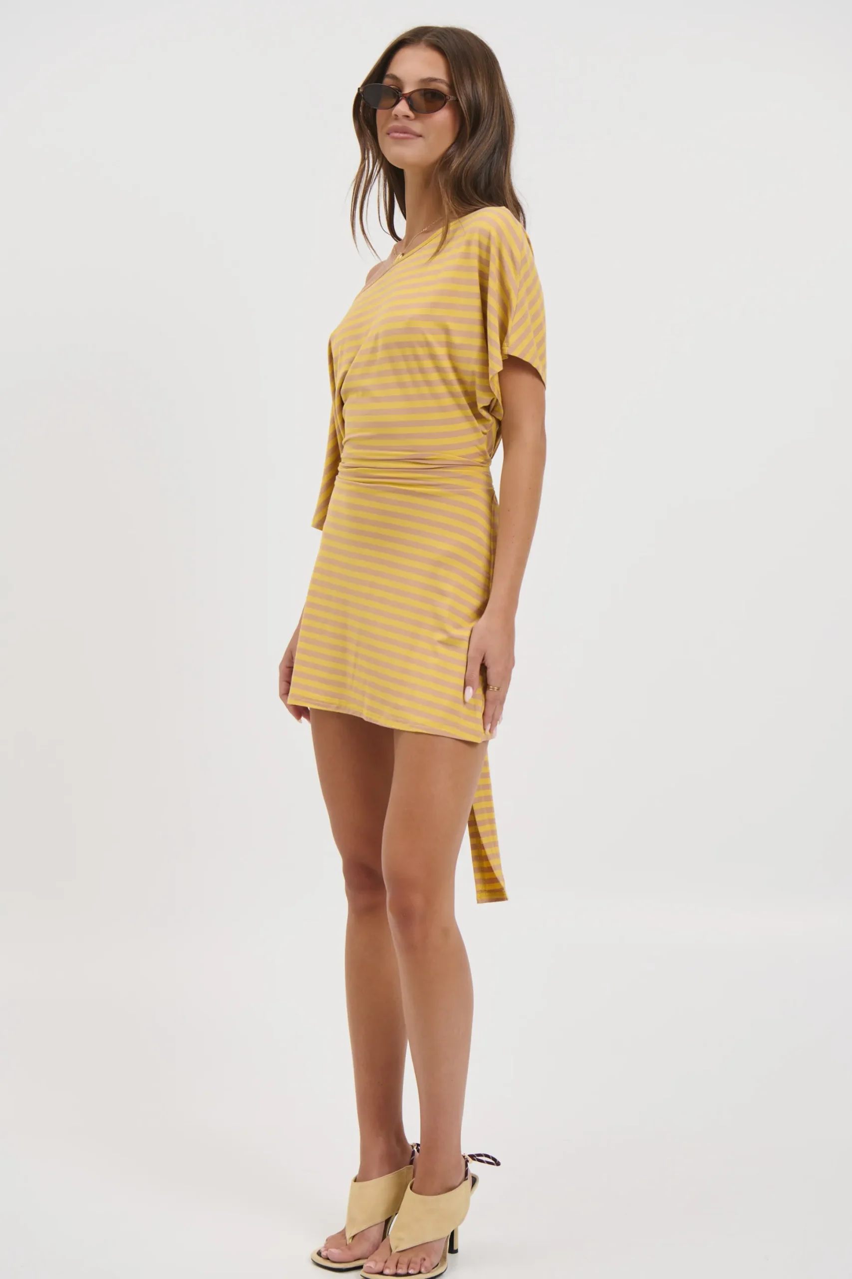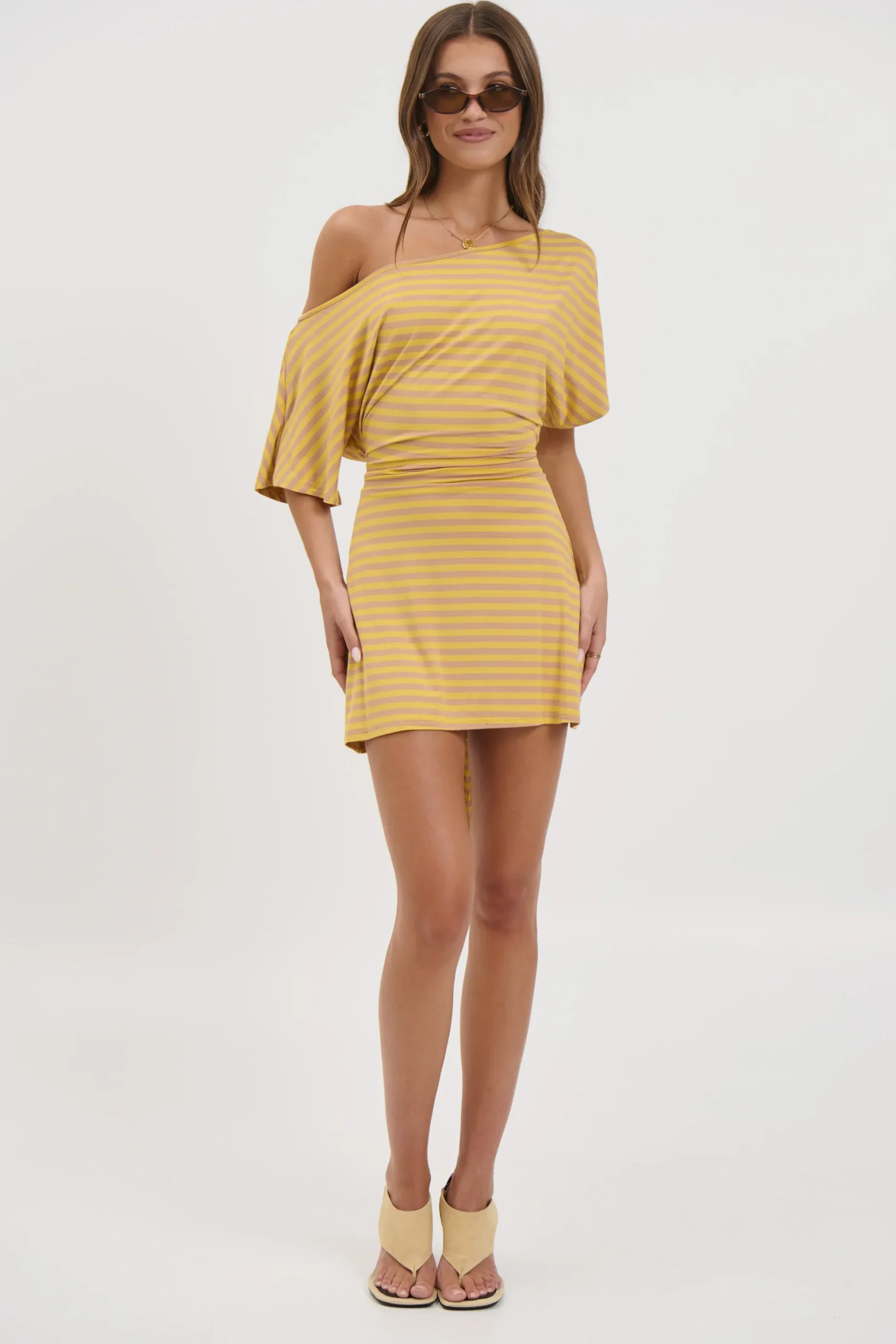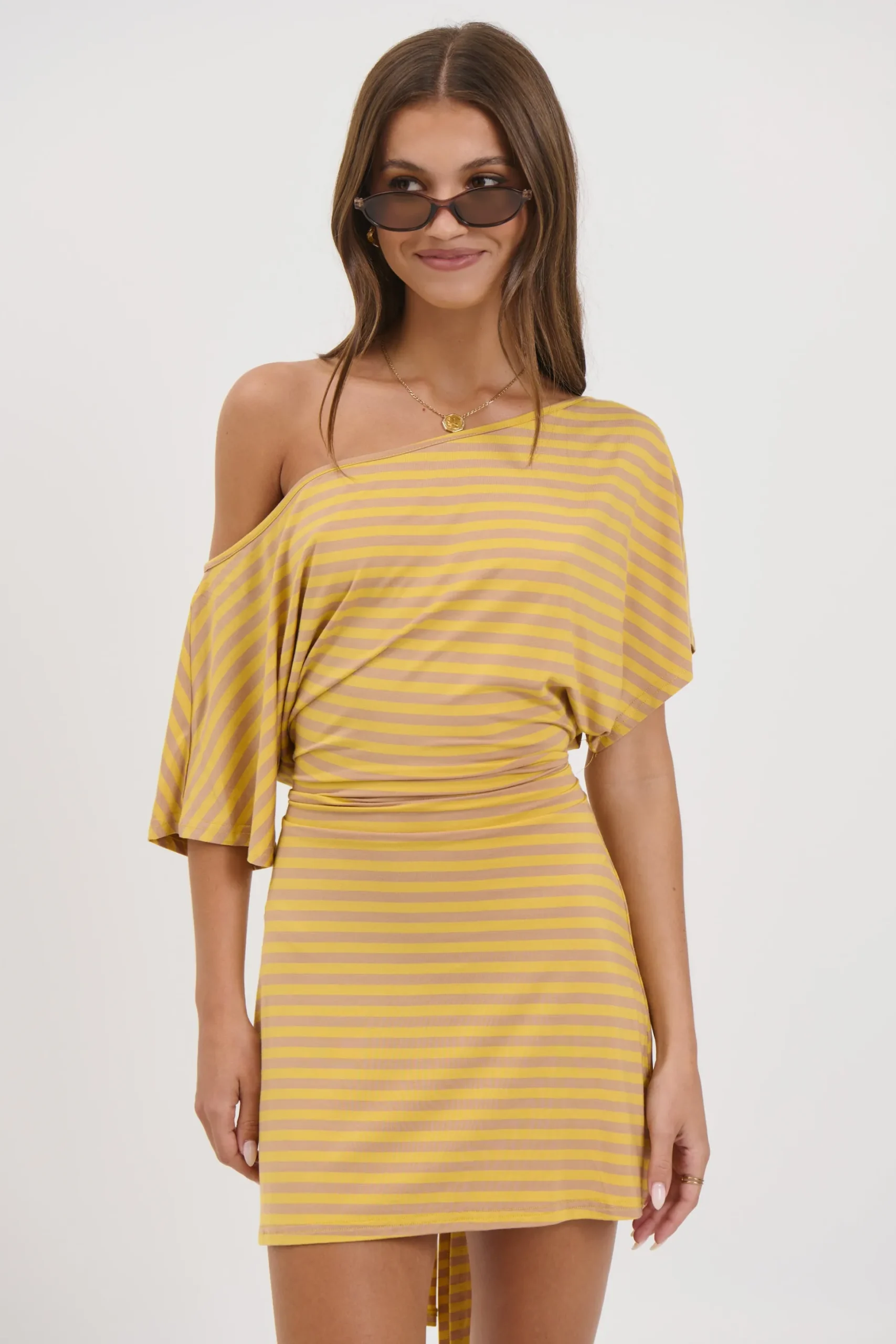 Meet the Lana Mini Dress, The oversized tee-style sleeves offer a casual, effortless vibe, while the fitted waist cinches in for a flattering silhouette. An asymmetric off-the-shoulder neckline adds a touch of modern edge, making this dress perfect for day-to-night styling.