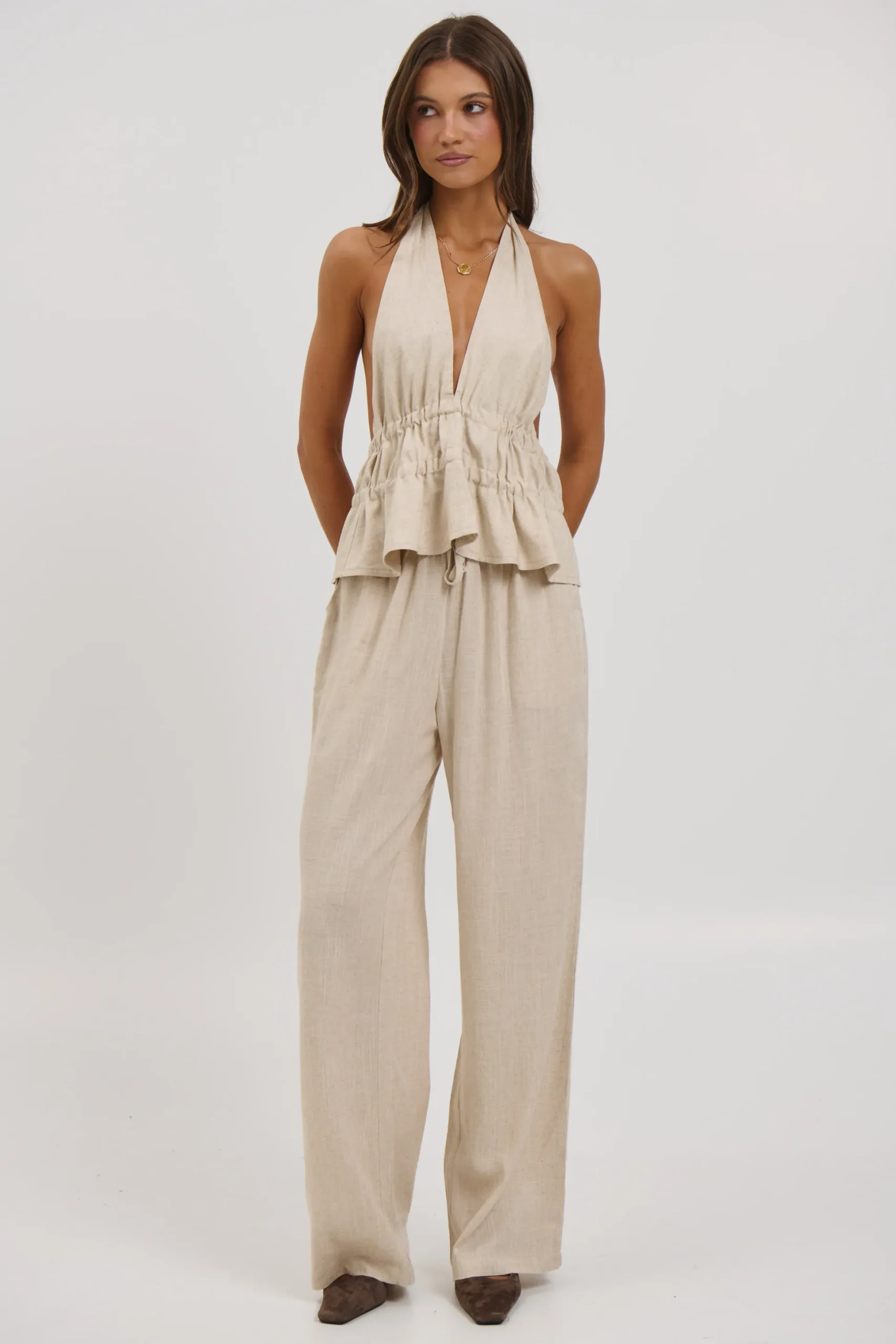 Meet the Leesa Top Featuring a halter tie neck and a v-cut bust, it offers a flattering and feminine silhouette. The open back with adjustable ruching ties around for a customised fit, while the lightweight linen-blend fabric keeps you cool and comfortable. Pair it with the Leesa Pants for a coordinated, chic look perfect for any occasion.