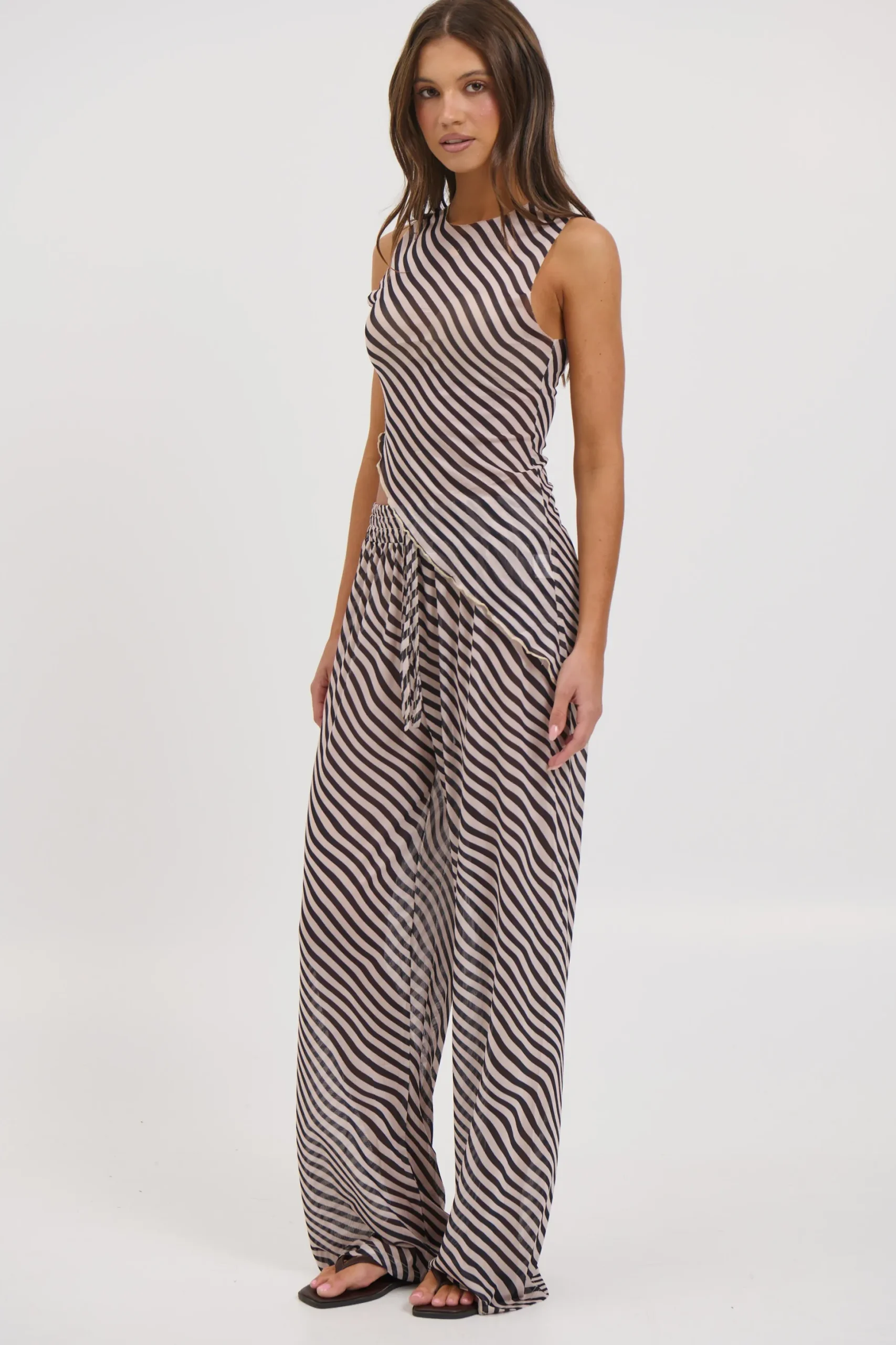 Meet the Mia Sheer Set, Featuring a matching set designed in a striped mesh material, this look includes straight-leg pants with an elasticated drawstring waist and full lining for comfort. The coordinating top features a sheer, asymmetric silhouette for an effortlessly modern and elevated feel.