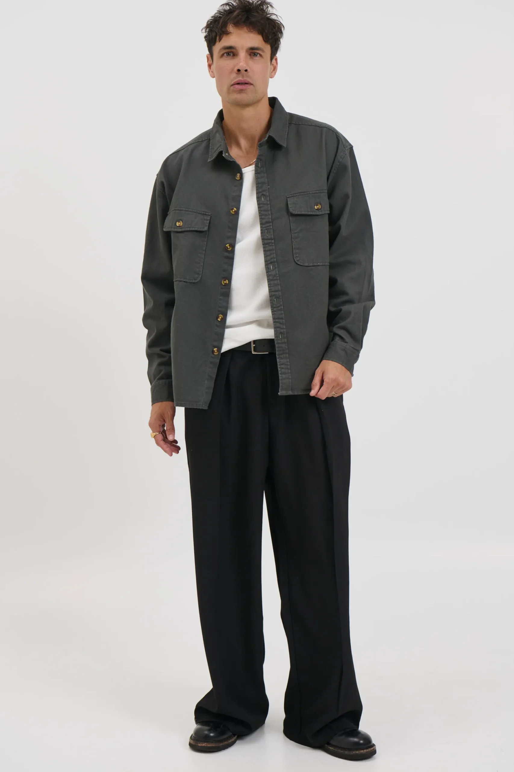 The Mike Cotton Drill Shacket combines the best of a shirt and jacket with a slightly oversized fit for a relaxed, on-trend look. It features a front tortoise shell button closure and functional front pockets, adding a touch of sophistication and practicality.