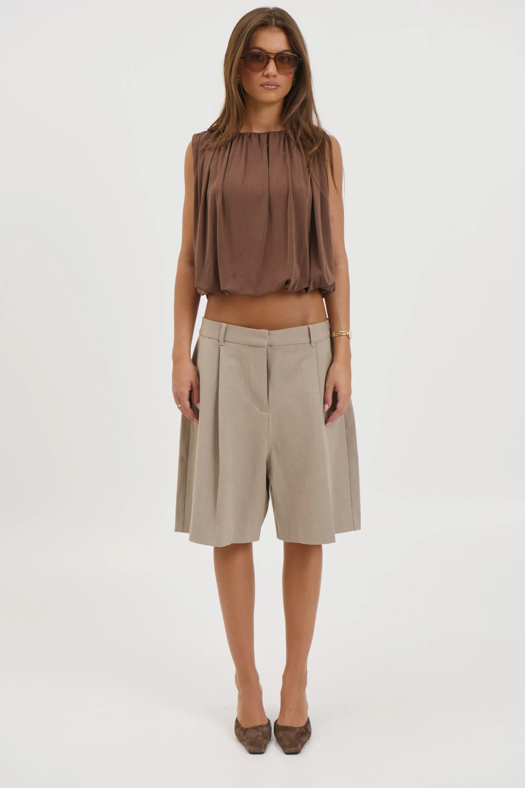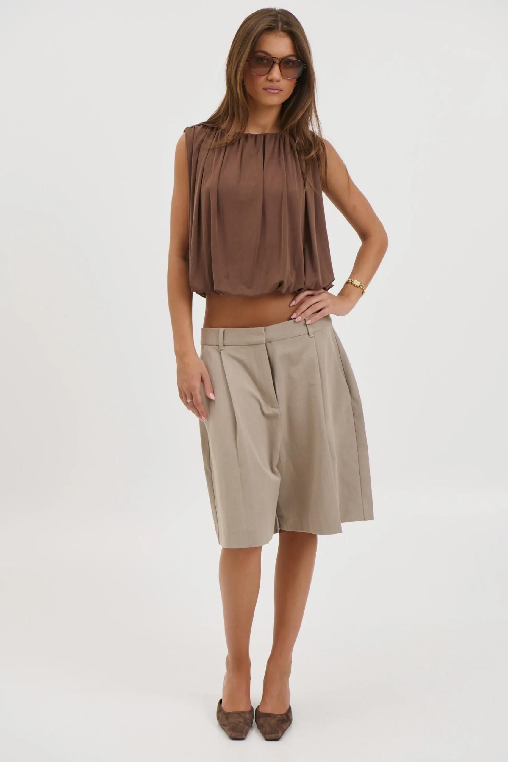 Meet the Mish Bubble top, featuring a relaxed, boxy silhouette with a gathered elastic hemline for a voluminous shape. Designed with a high crew neckline and wide sleeveless cut for a clean, structured look.