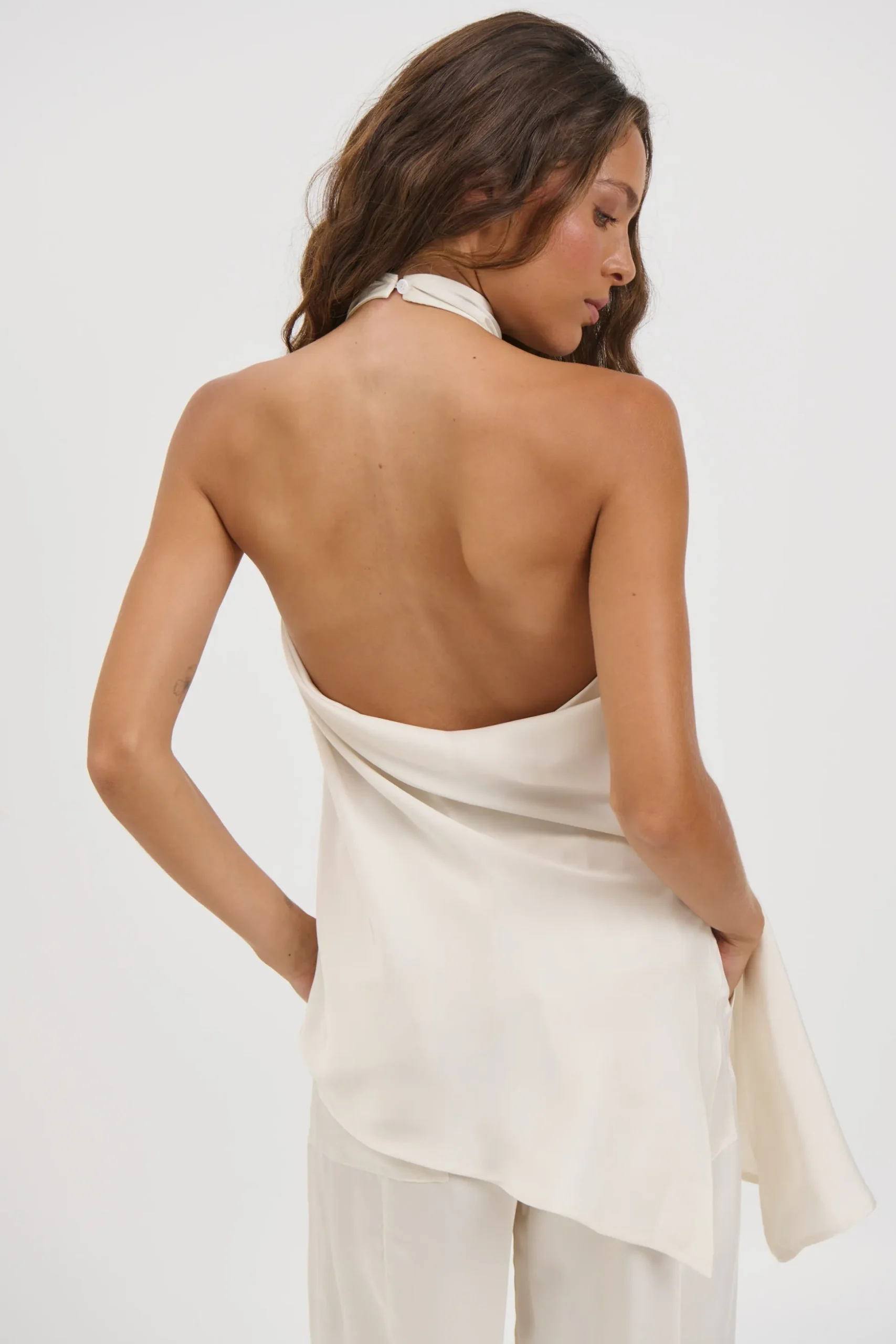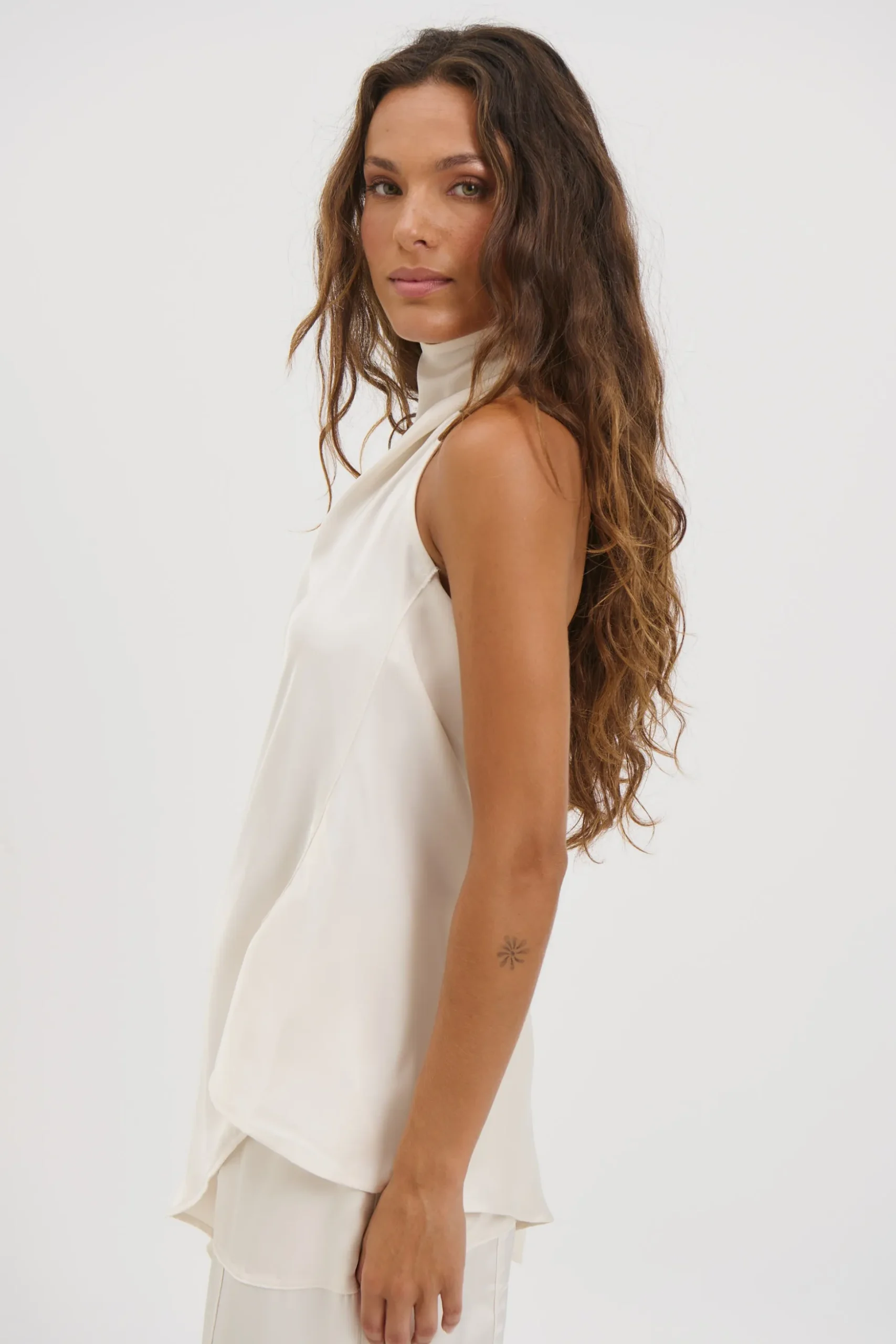 Meet the Myla Top, Featuring a silk-look finish, this lightweight top is designed with a refined halter high neckline and a delicate button closure for an elevated touch. The longline silhouette falls effortlessly with an asymmetric hem. Complete the look with the Myla pants for a coordinated, sophisticated set.