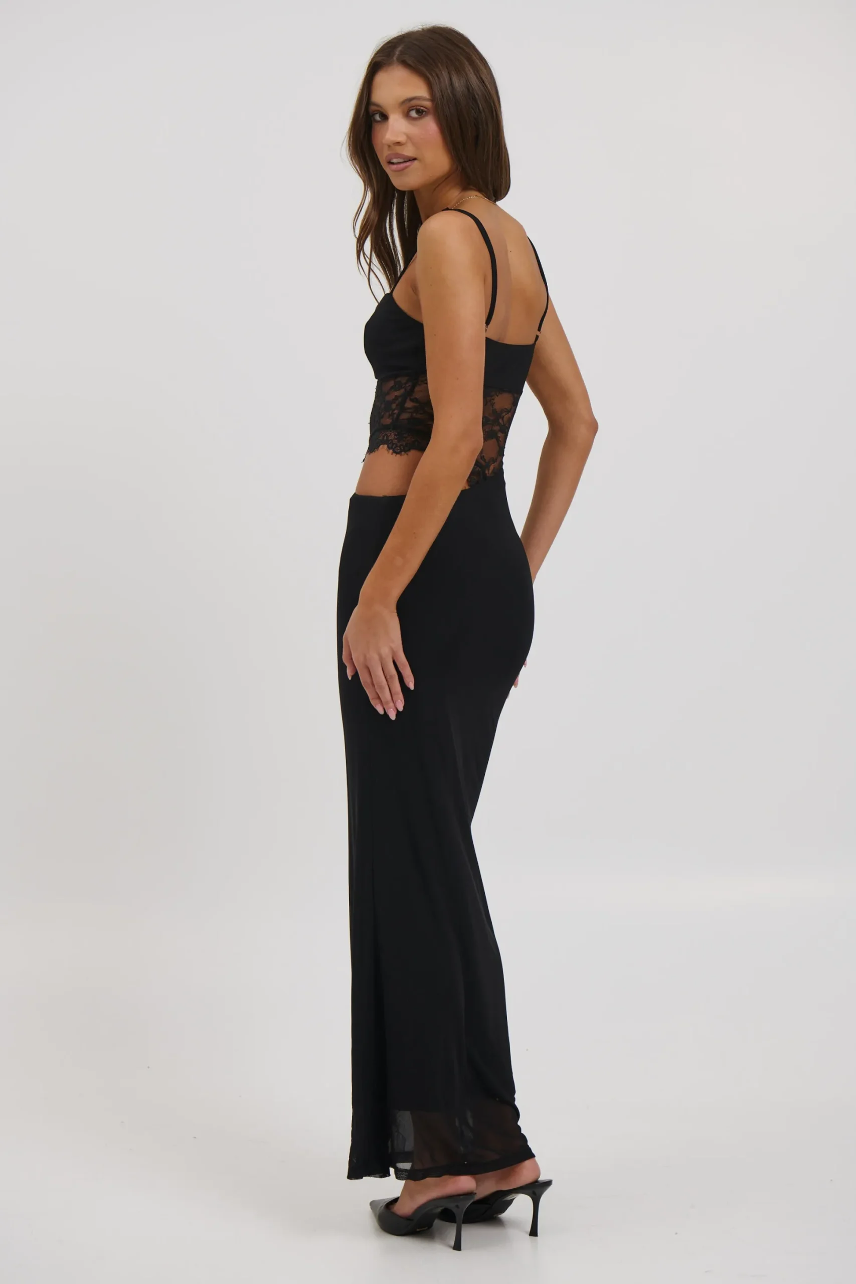 Meet the Navy Lace Maxi, features adjustable thin straps and a ruched bust crop with delicate lace detailing and a cutout waist for a flattering touch. Falling into a flowing maxi length, it’s crafted from soft mesh fabric and fully lined for comfortable wear.
