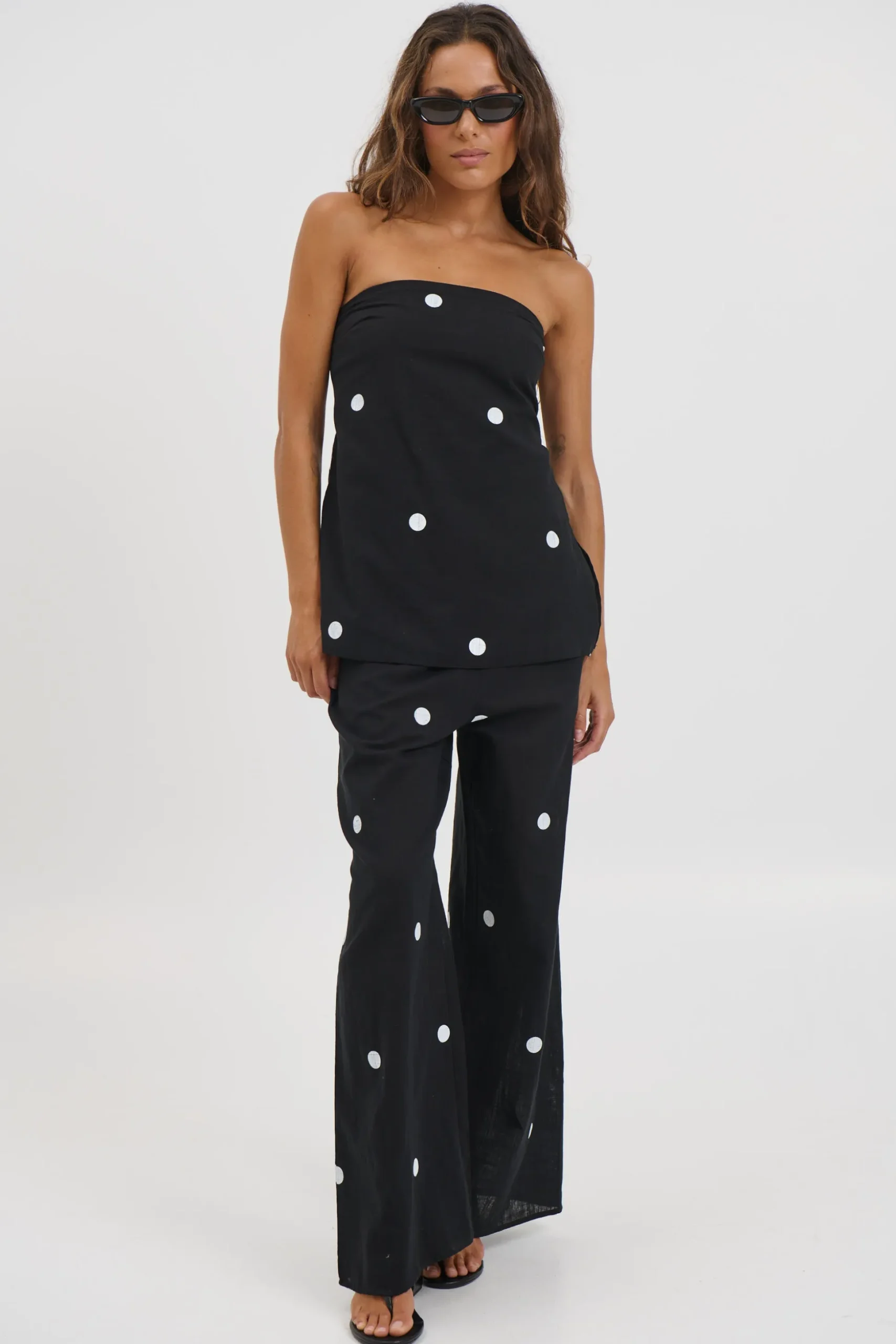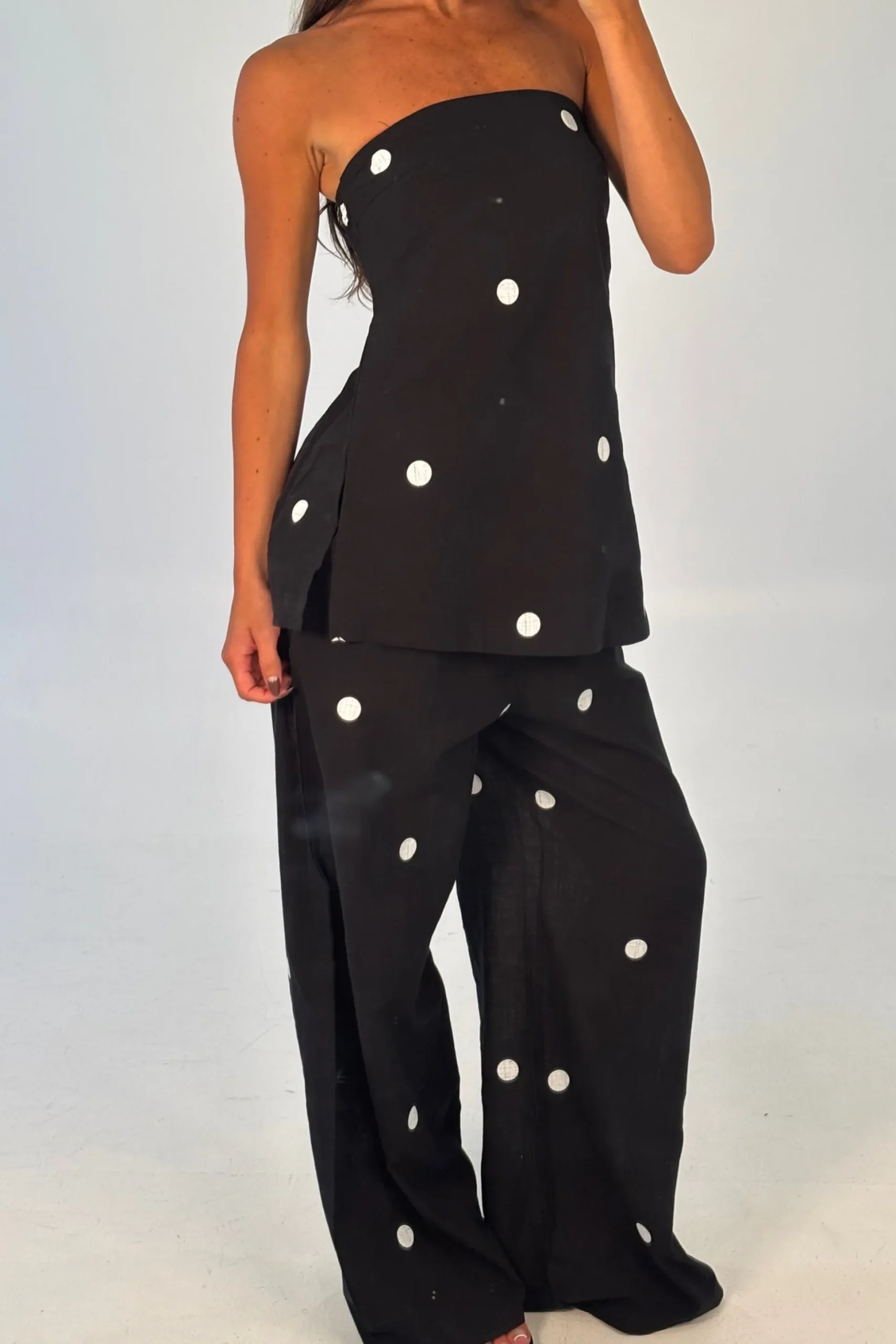 Meet the Nora Set, includes a strapless top with side splits and an elasticated back panel for a comfortable fit. Paired with wide-leg pants featuring an elasticated waistband, side pockets, and an unlined finish, this effortless duo is perfect for relaxed yet stylish dressing.