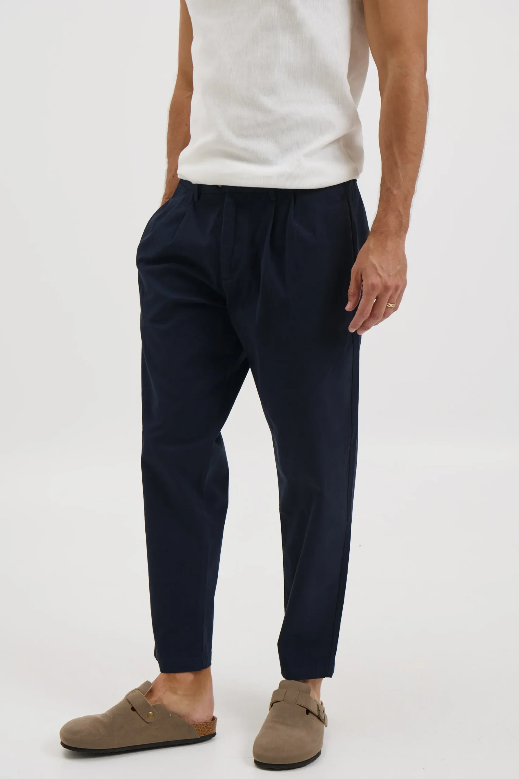 The NTH Cropped Pleat Pant features pleated cotton fabric and is designed with double front pockets, as well as a single button back pocket. It also includes belt loops for added functionality.