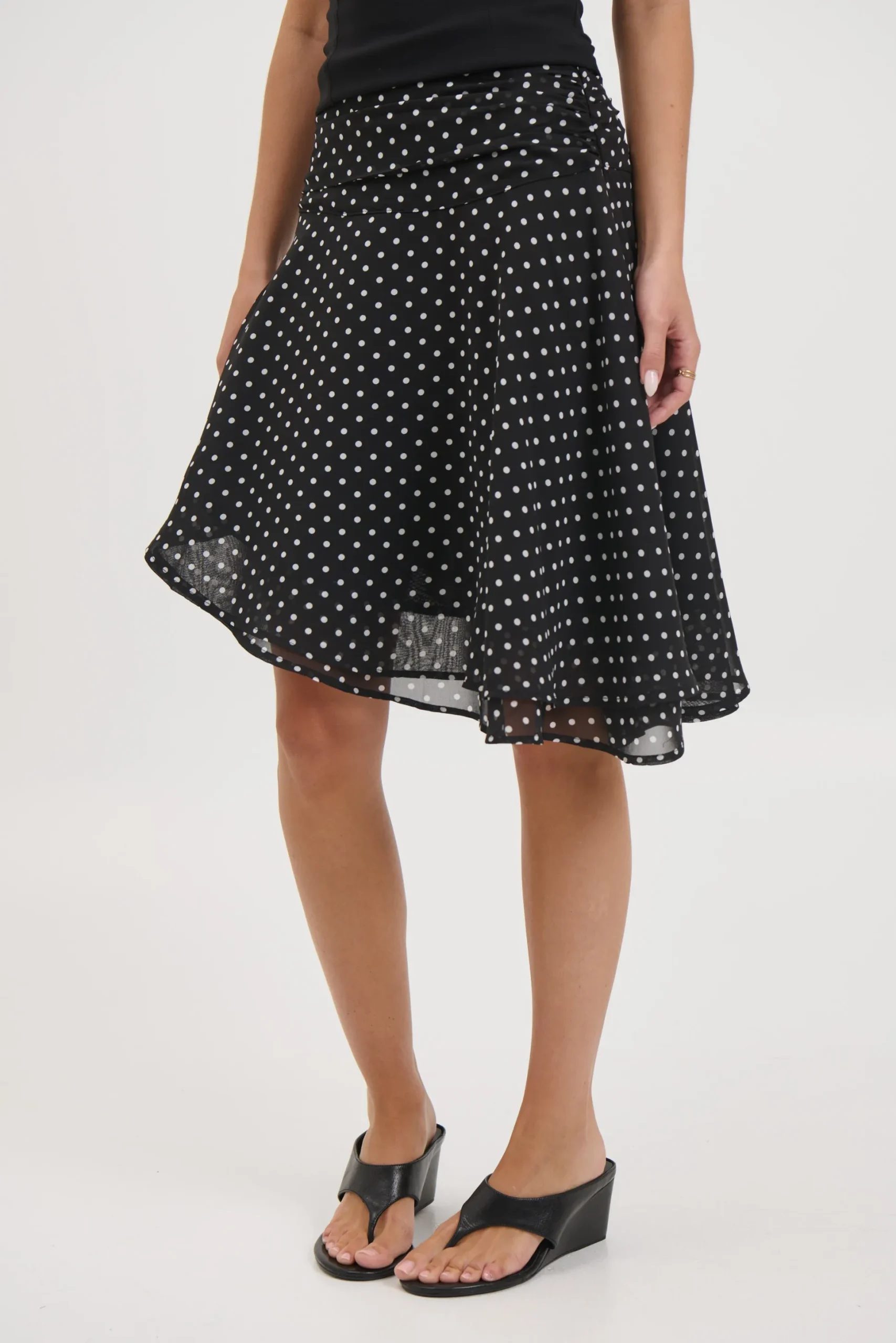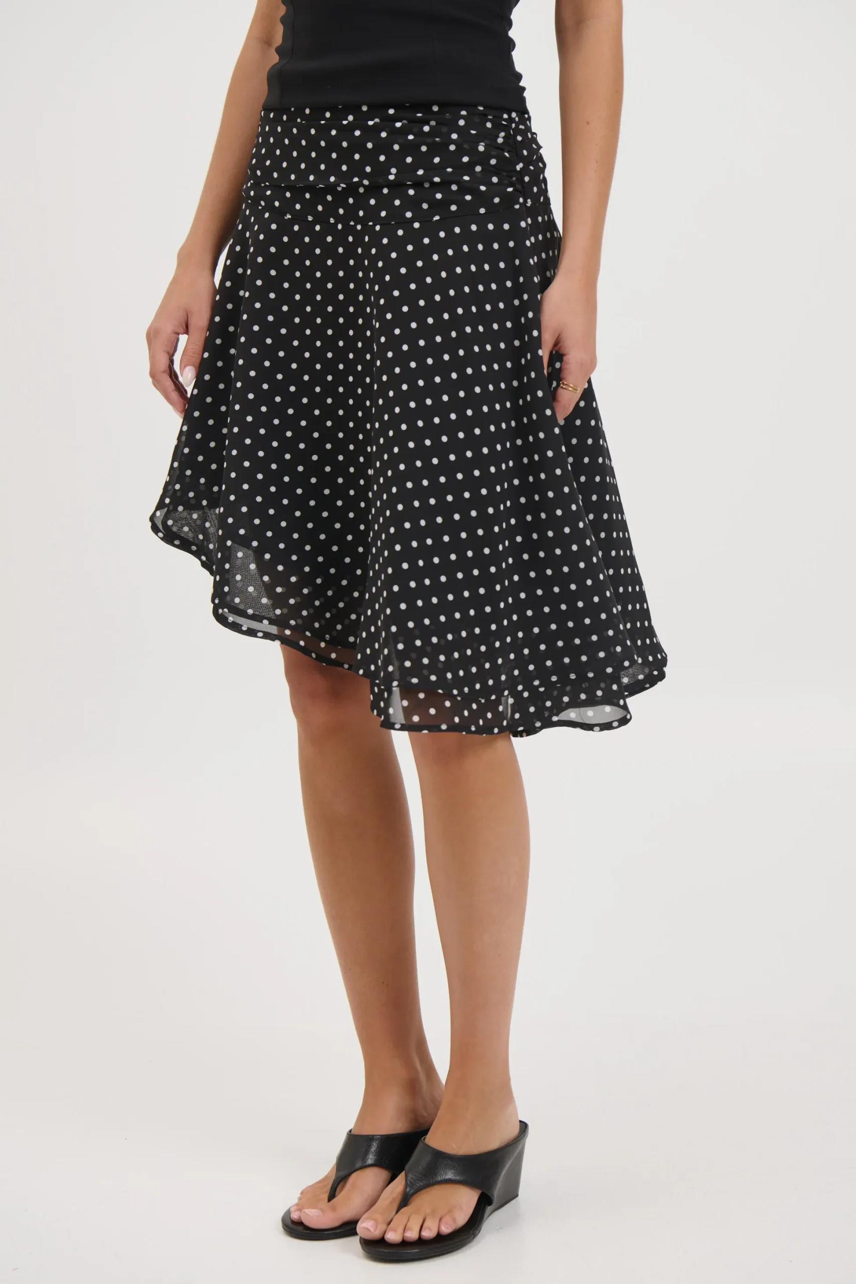 Meet the Paloma Midi Skirt, featuring a playful twist with its lightweight, semi-sheer fabric and dynamic handkerchief hemline. The high-rise waistband offers a flattering, snug fit with an invisible zipper closure, while the soft pleating creates gentle movement and flow.