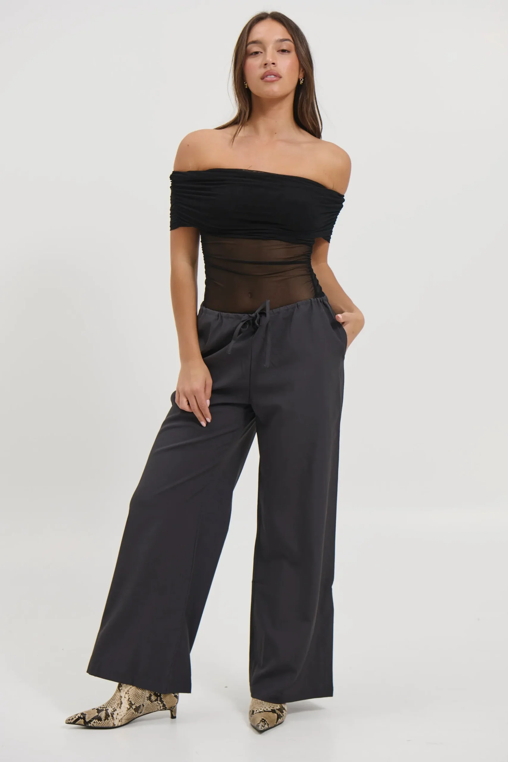 Meet the Penny Mesh Bodysuit, Featuring a sheer mesh design, this off-the-shoulder bodysuit stuns with a fold-over neckline and short sleeves for an effortlessly chic silhouette. Designed with a secure clasp closure and a flattering cheeky brief cut, it’s the perfect layering piece to elevate your look with a touch of edge and elegance.