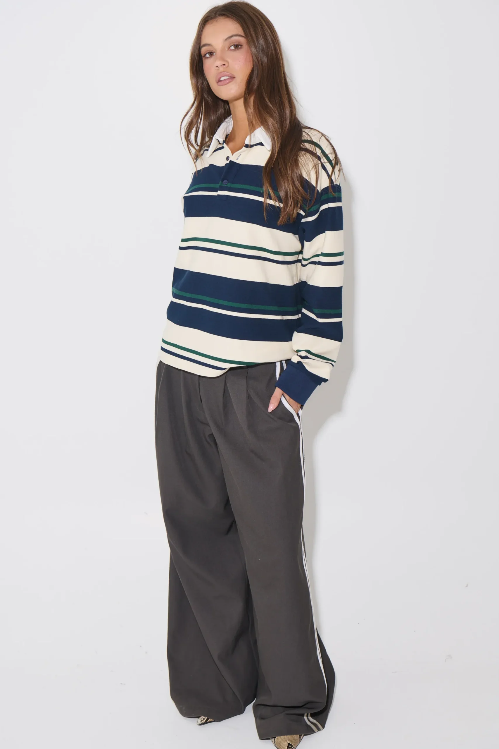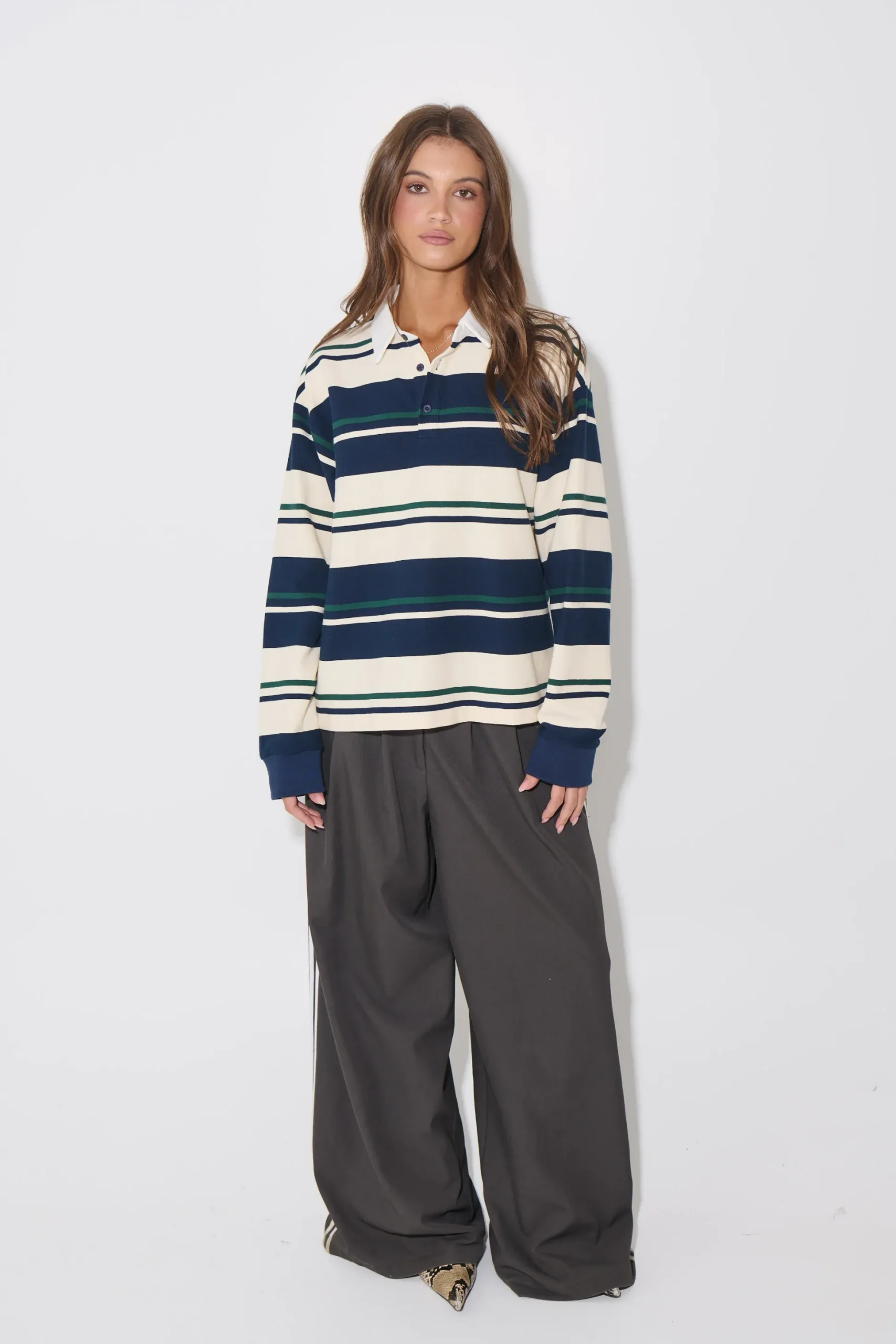 Meet the Preppy Jersey, embrace the striped trend with a relaxed silhouette. This long-sleeve, collared shirt is crafted from cotton for comfort and durability. Its baggy fit offers a modern, effortless style.
