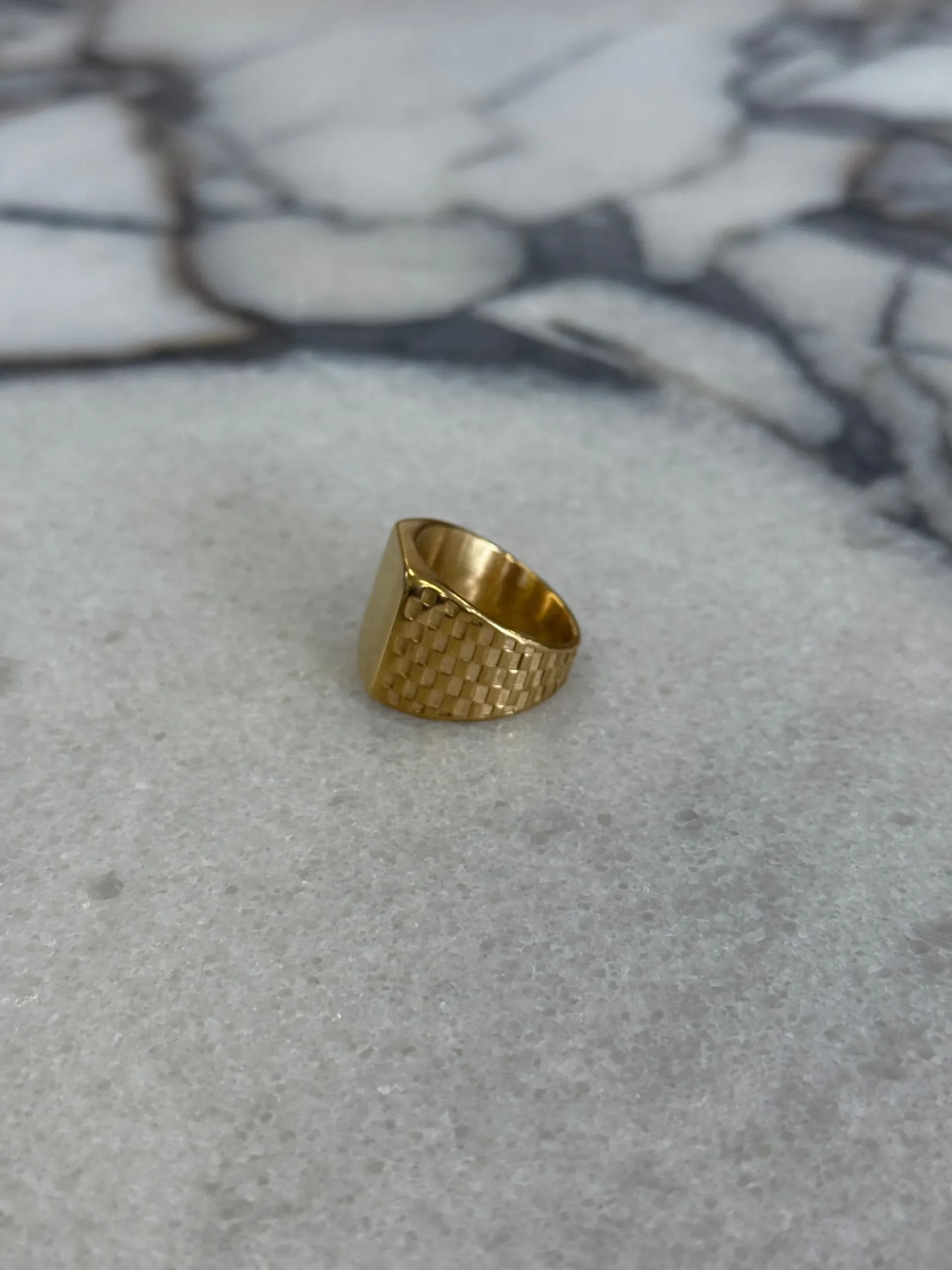 The Bold Signet Ring, crafted with a chunky silhouette and checkered detailing for a timeless accessory designed to elevate everyday looks.
