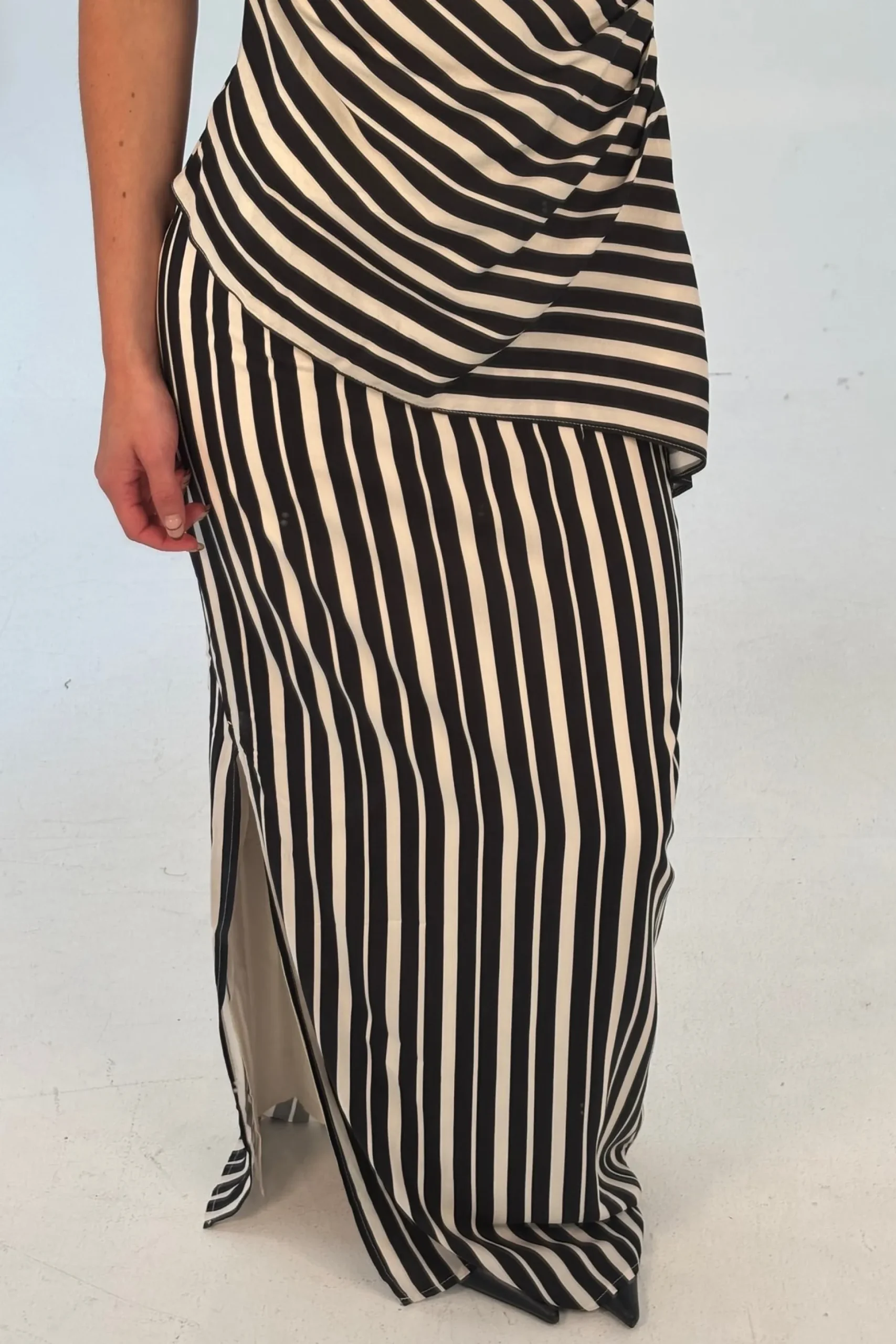 Meet the Rita Set, featuring a one-shoulder asymmetrical top with a low back and side zip closure, paired with a flowing maxi skirt that includes a side front split and back zip closure. Perfect for a sophisticated, coordinated look.