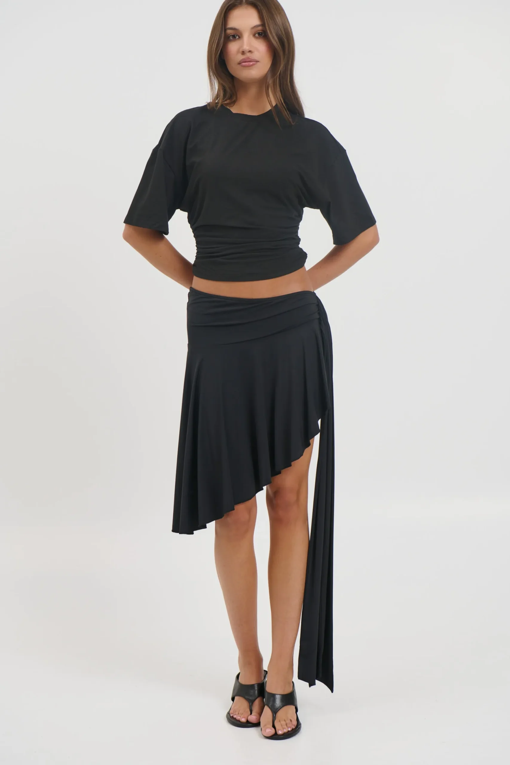 The Safari Midi Skirt offers a true-to-size fit with a low-rise silhouette. It features an adjustable side tie and an asymmetric hemline, blending practicality with a modern edge.