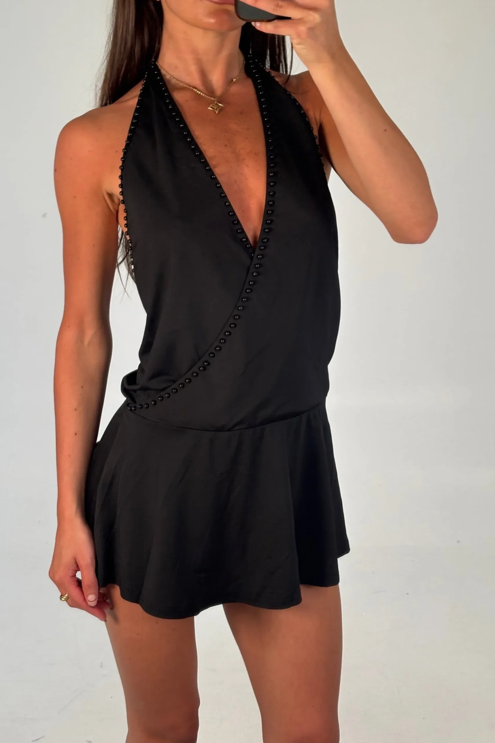 Meet the Saidee Mini Dress, Featuring a halter tie neckline and a daring deep V cut, the top is detailed with statement studs that add a touch of edge. The open back enhances its sultry appeal, while the flowy skirt brings a soft, feminine balance. This style is very short for a leg-baring look.